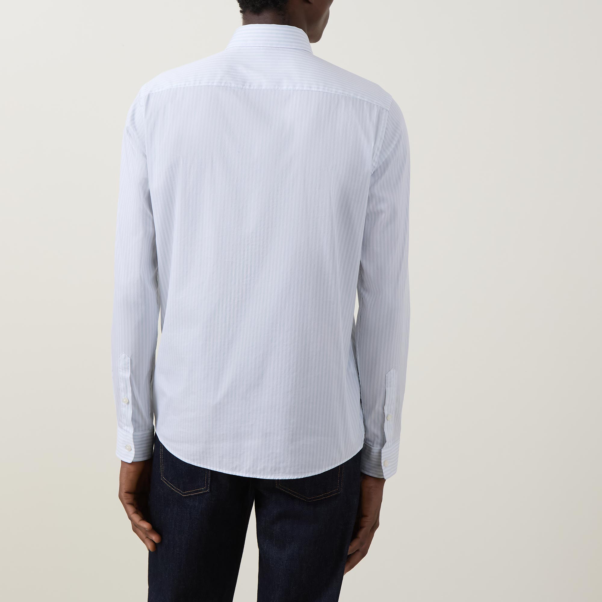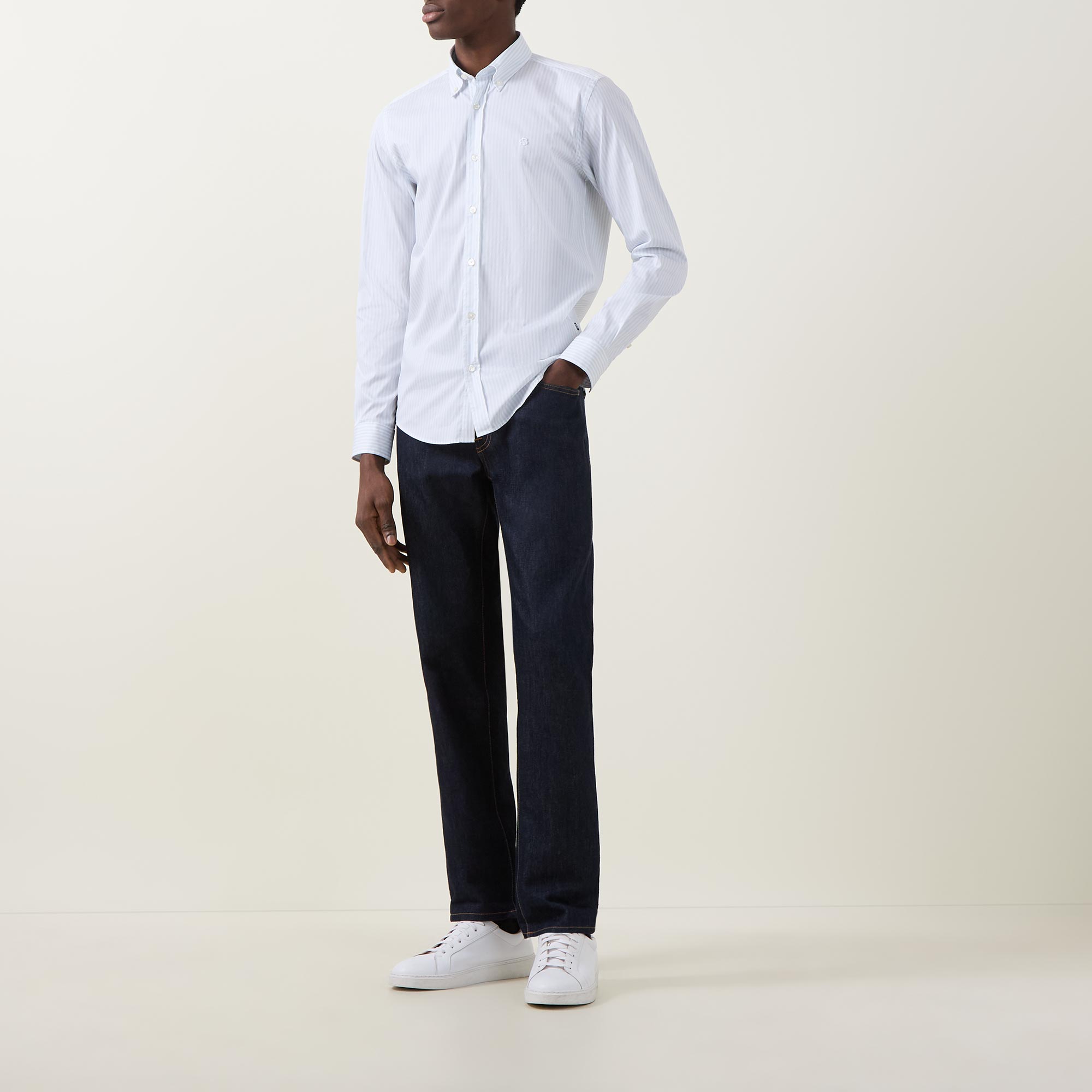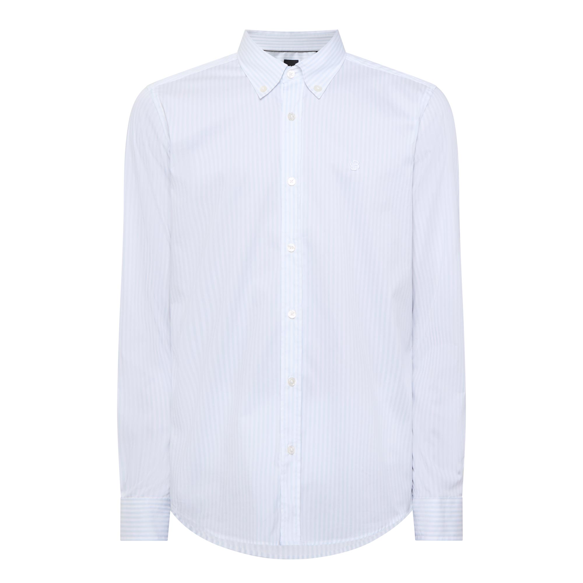 - Button-down collar, long sleeves, single-cuff, curved hemline, stripe pattern, logo detail