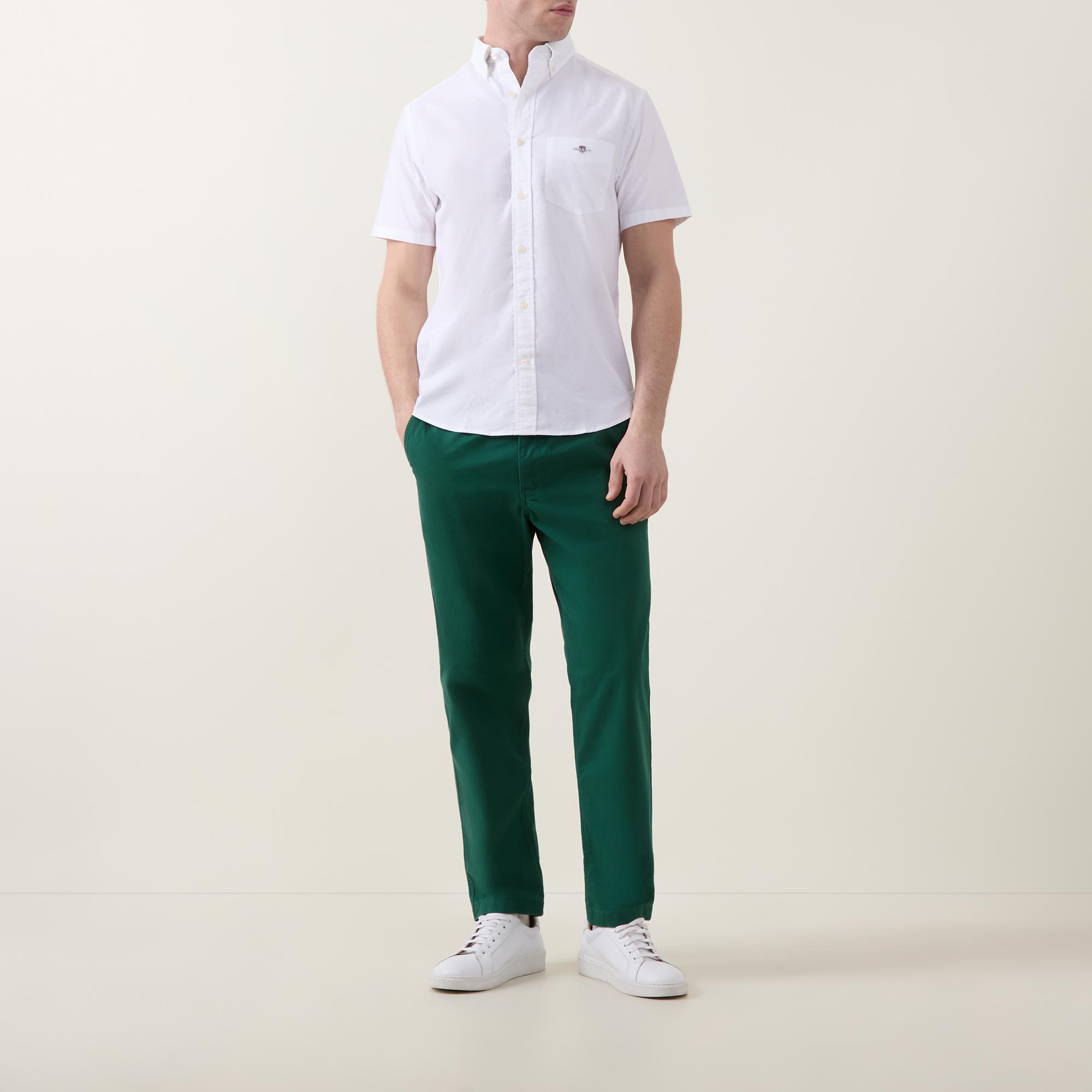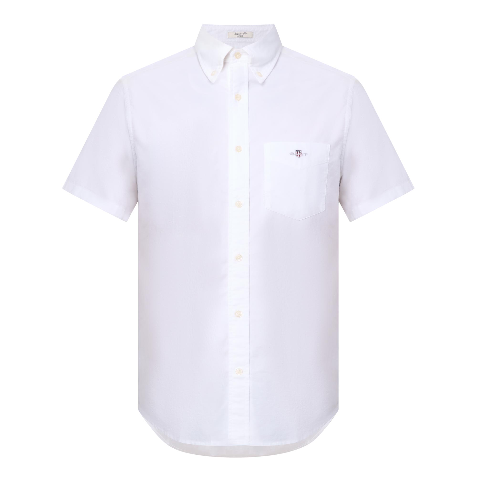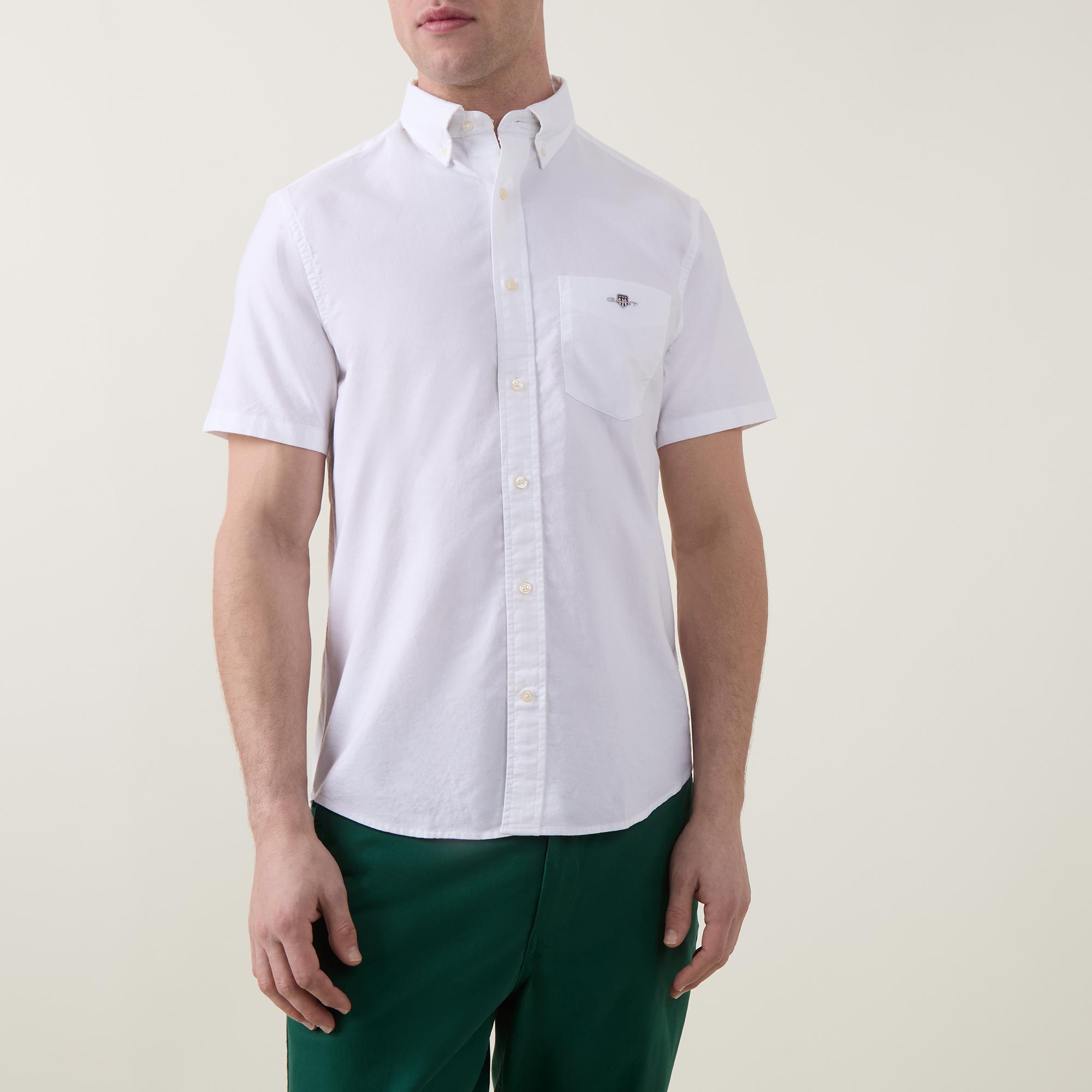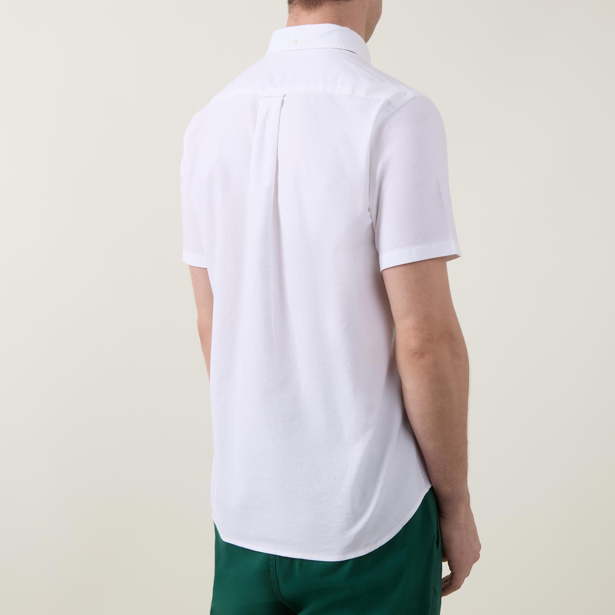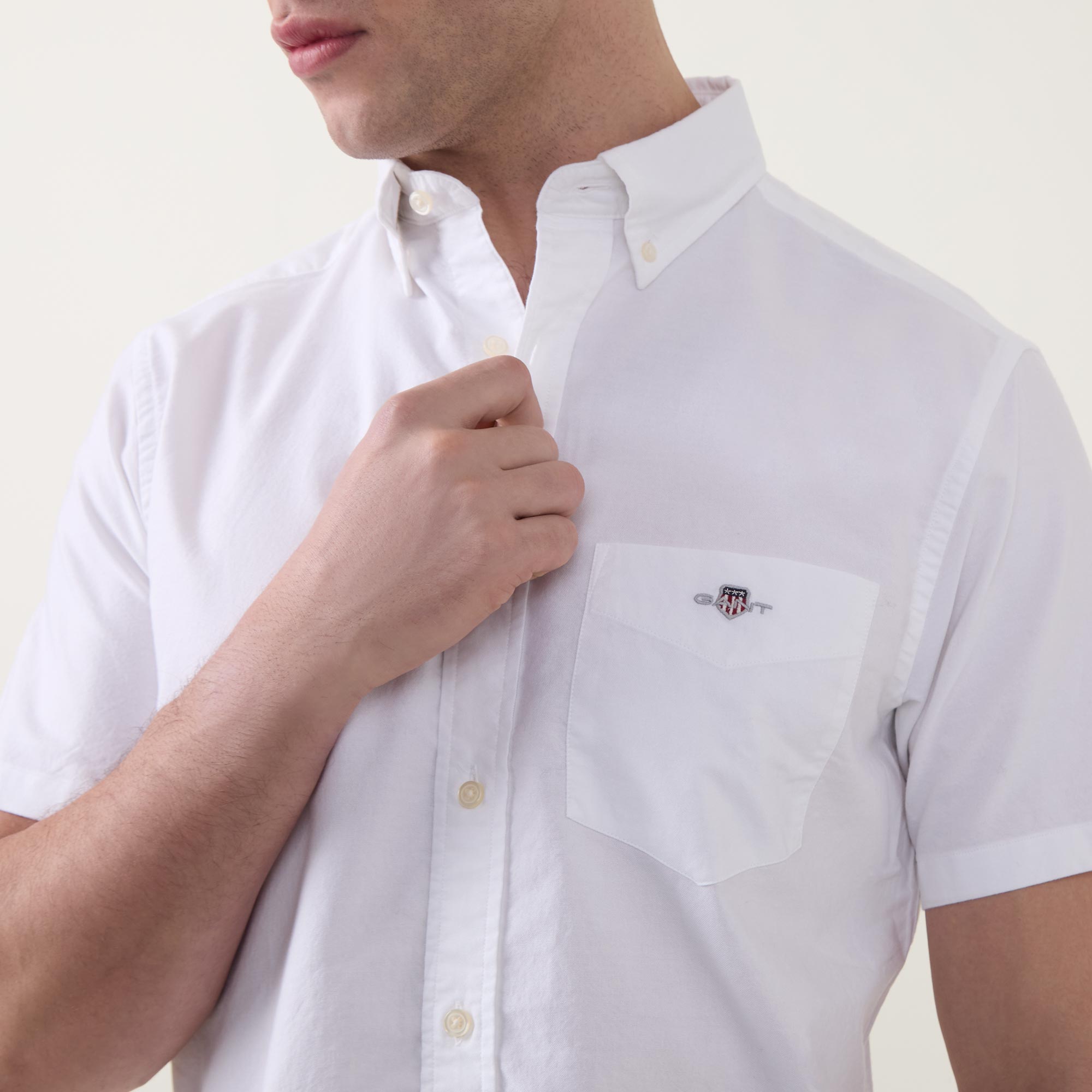 - Button down point collar, short sleeves, one chest patch pocket, front button fastening, curved hem, rear box pleat, locker loop, Shield logo embroidery on the chest