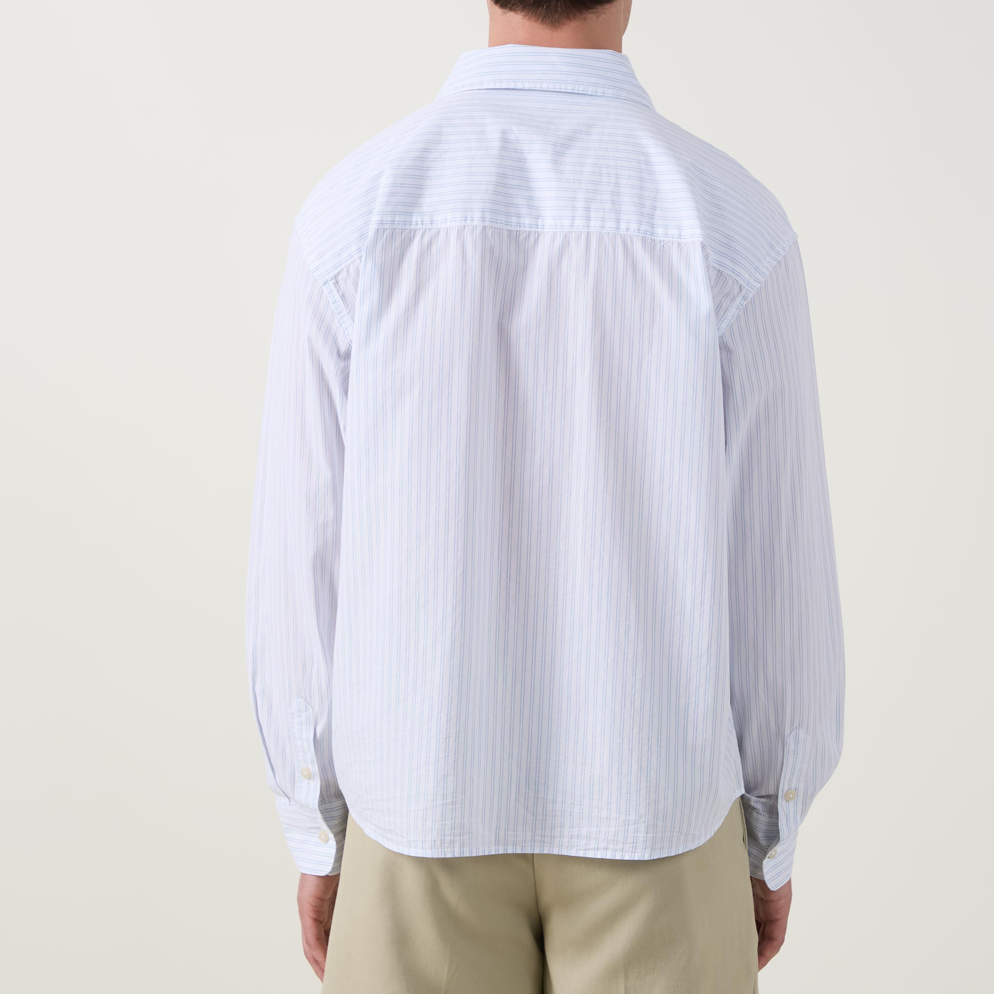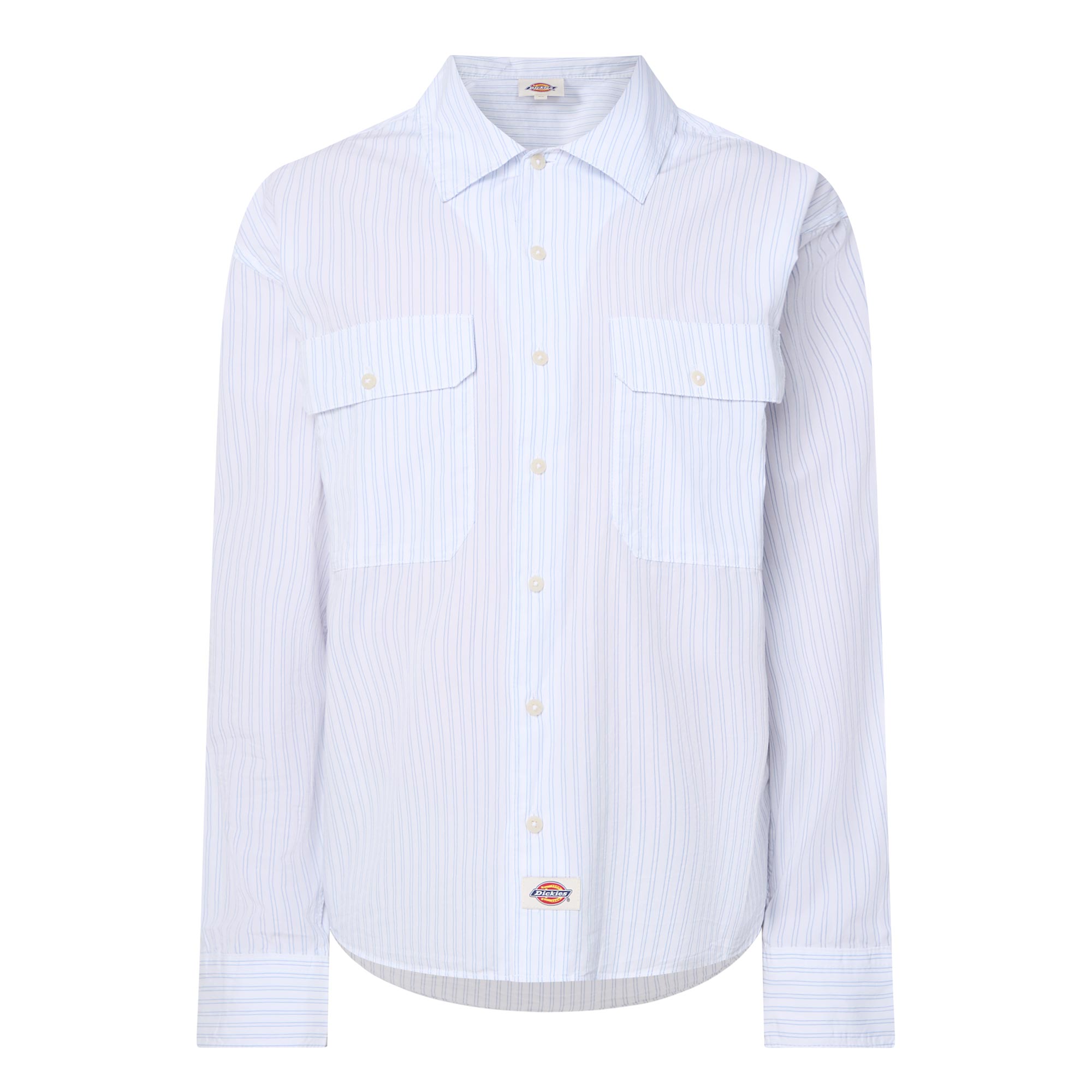 • Striped print, long sleeves, boxy fit, button fastenings, scooped hem, work shirt pockets, bevelled edges, shirt collar