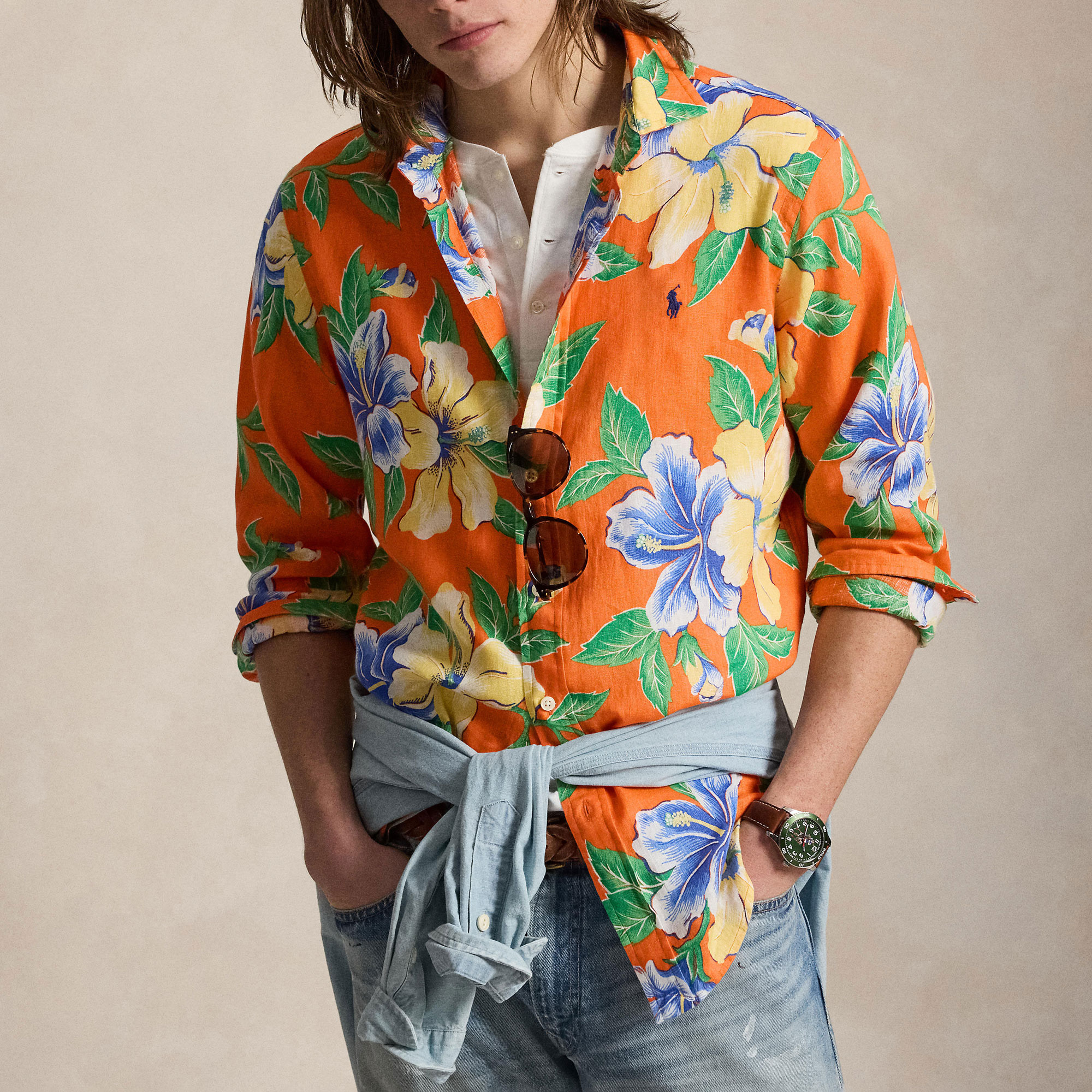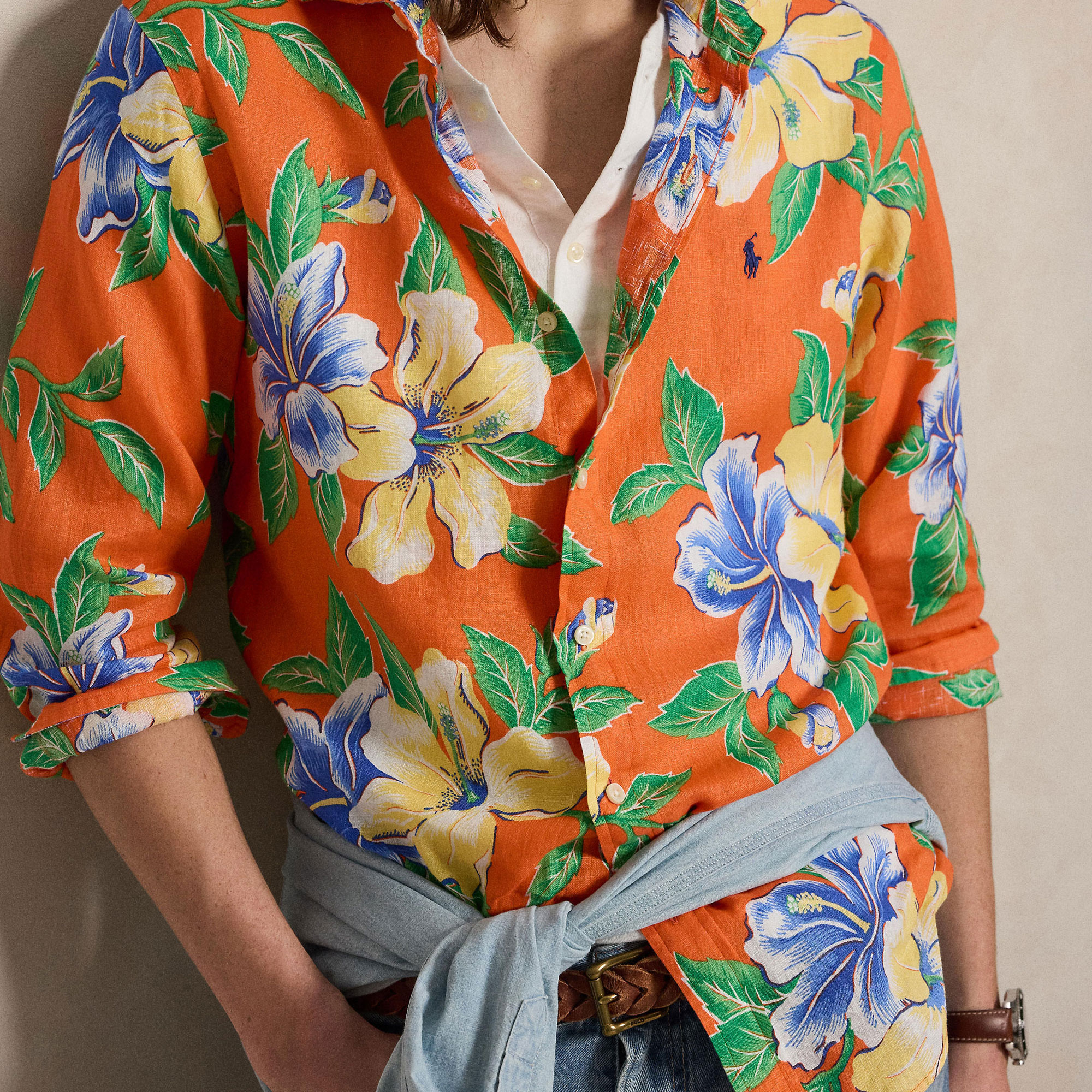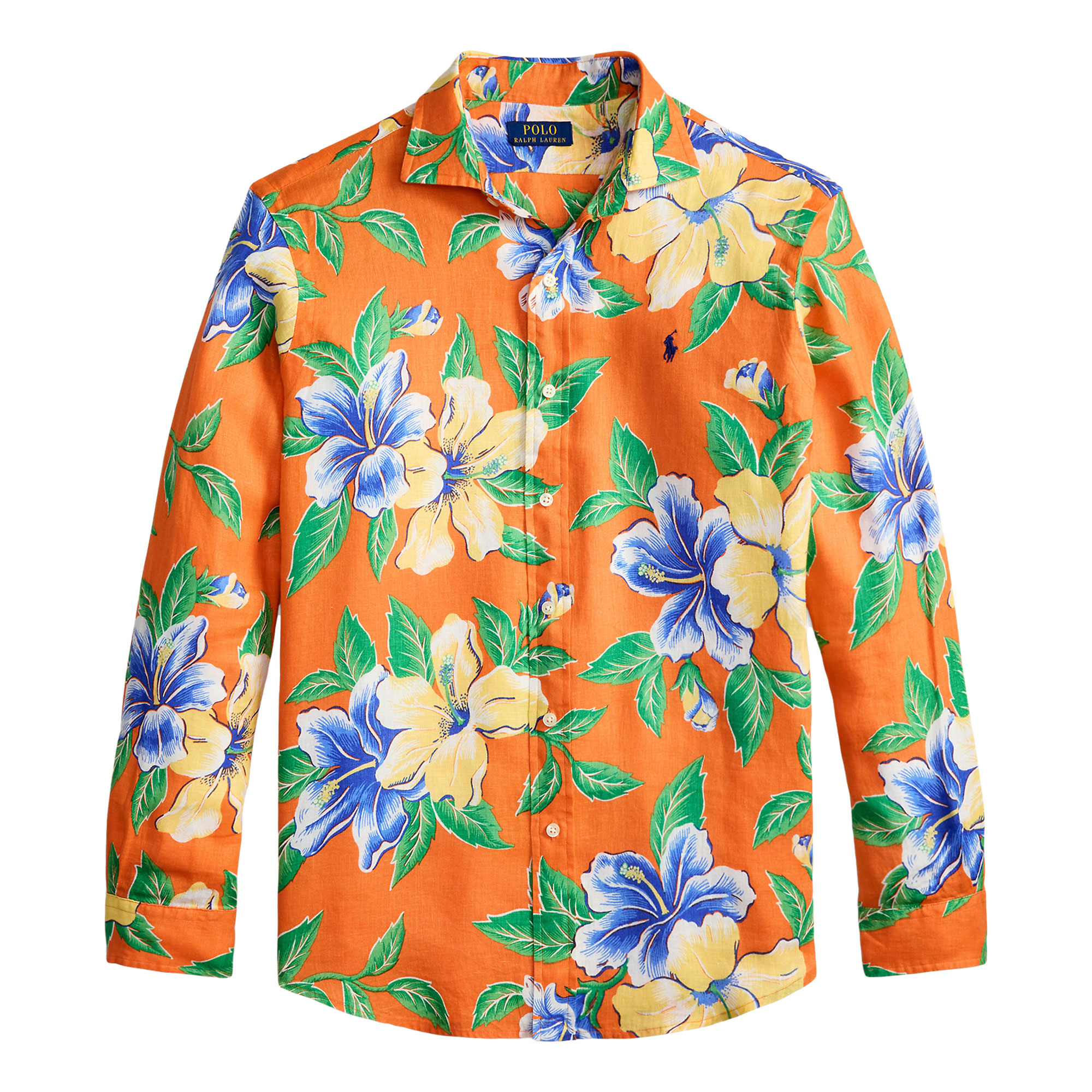 - Medium-spread collar, buttoned placket, long sleeves, buttoned barrel cuffs, pleated back yoke, signature embroidered Pony logo detail, ultralightweight linen, tropical floral print