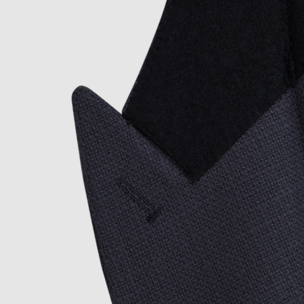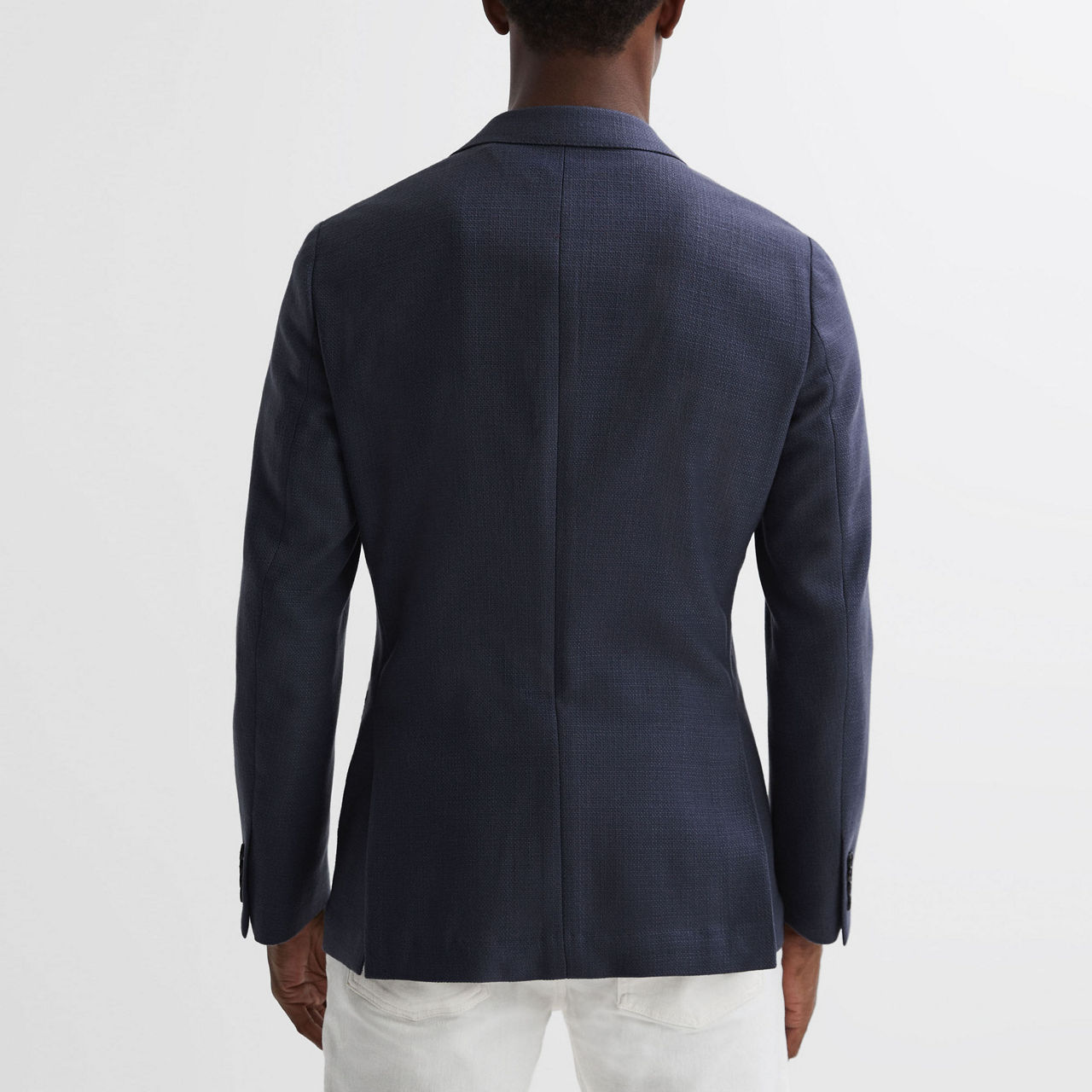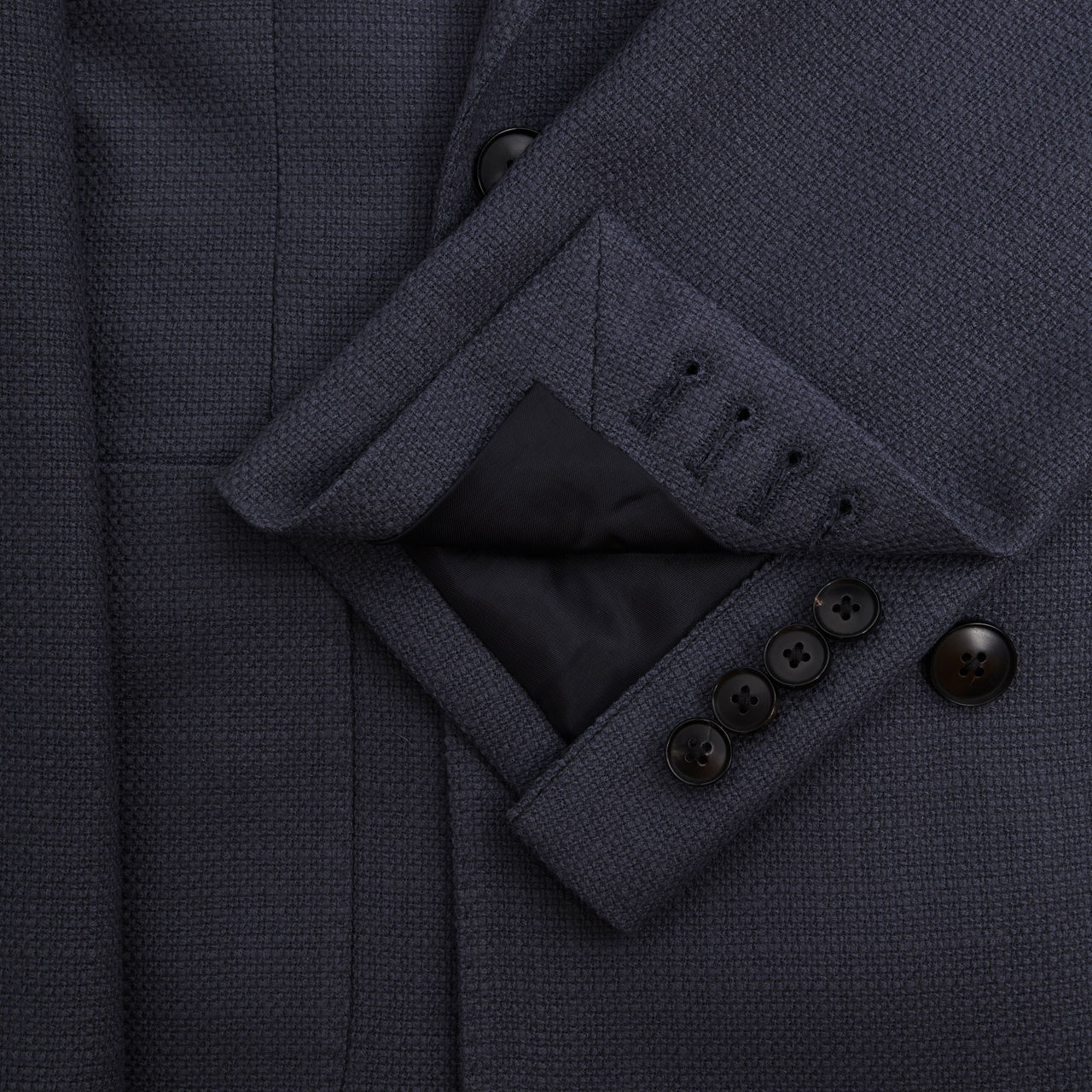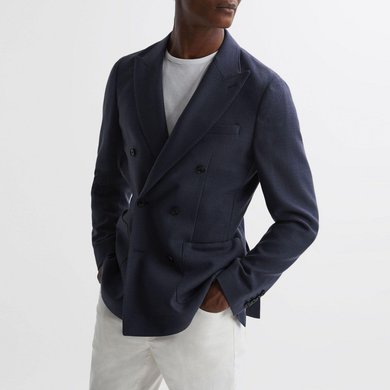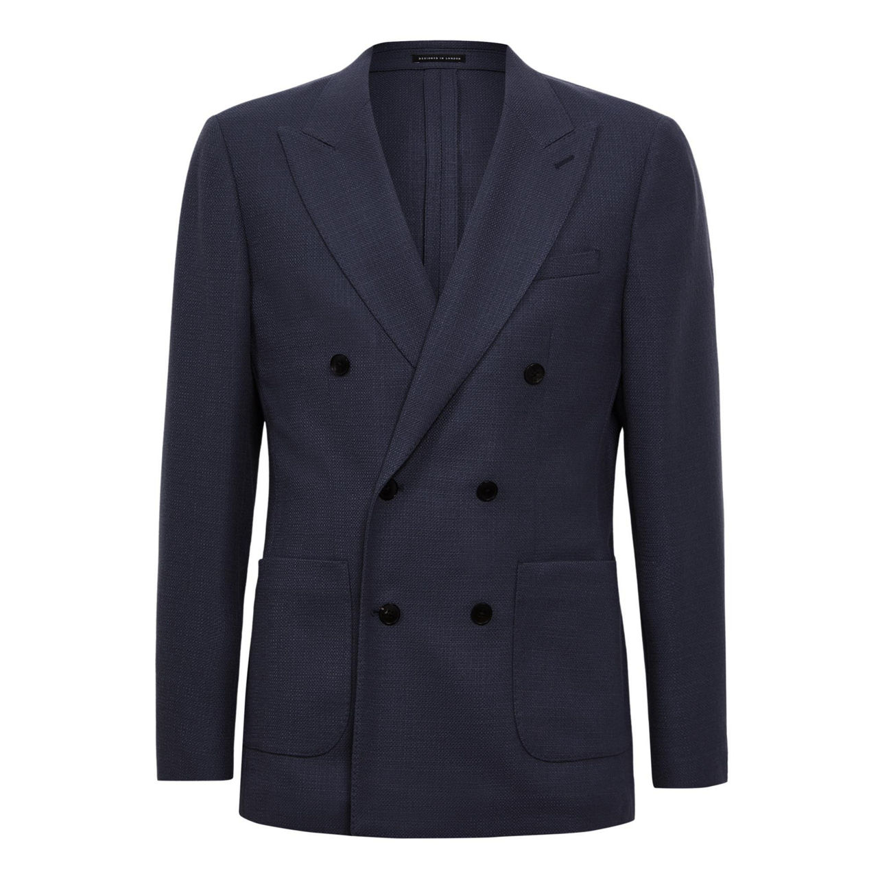 - Tactile weave, peak lapels, double-breasted, patch pockets, six-button closure, long sleeves