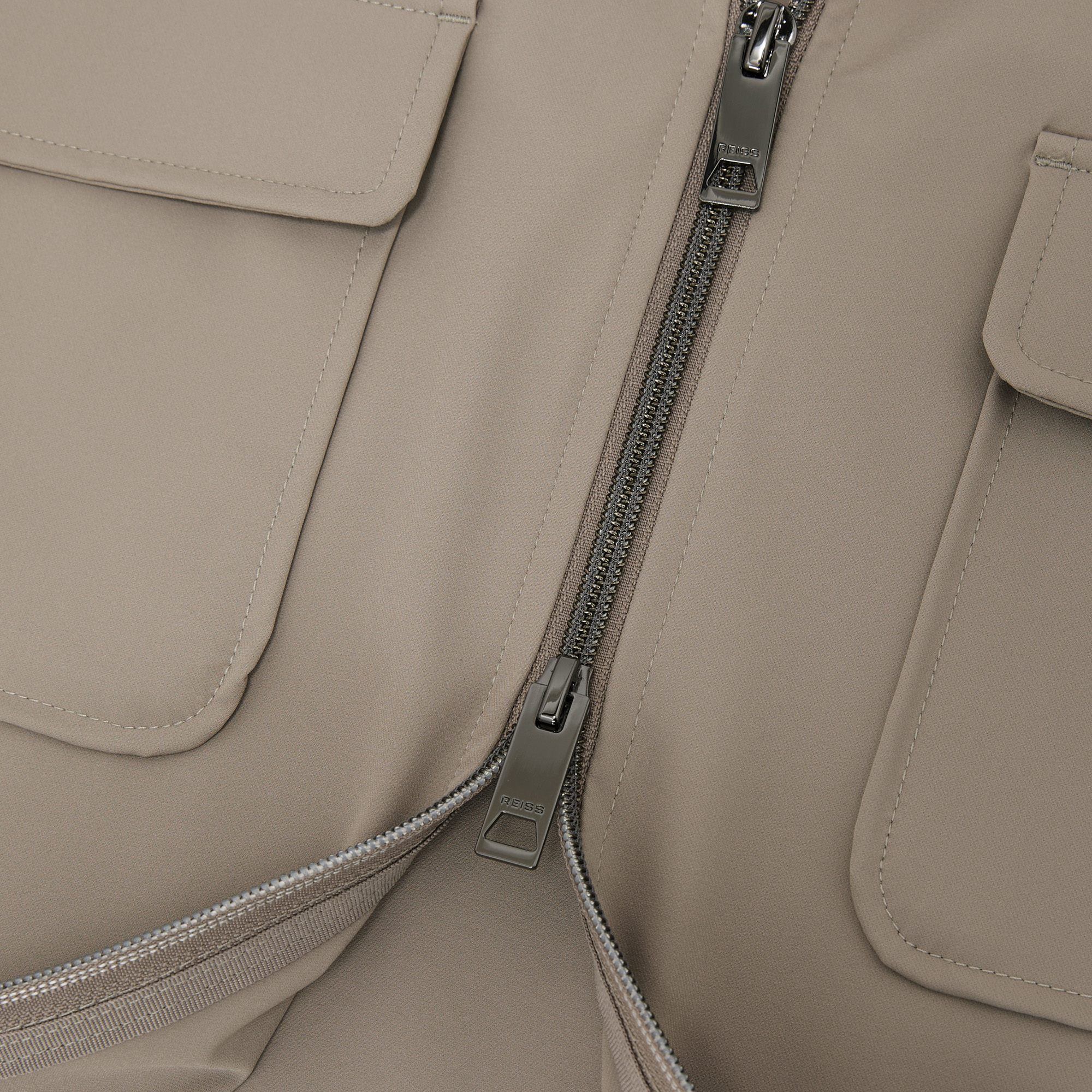 - Technical fabrication with stretch, classic collar, flap patch pockets, press-stud cuffs, dual front zip