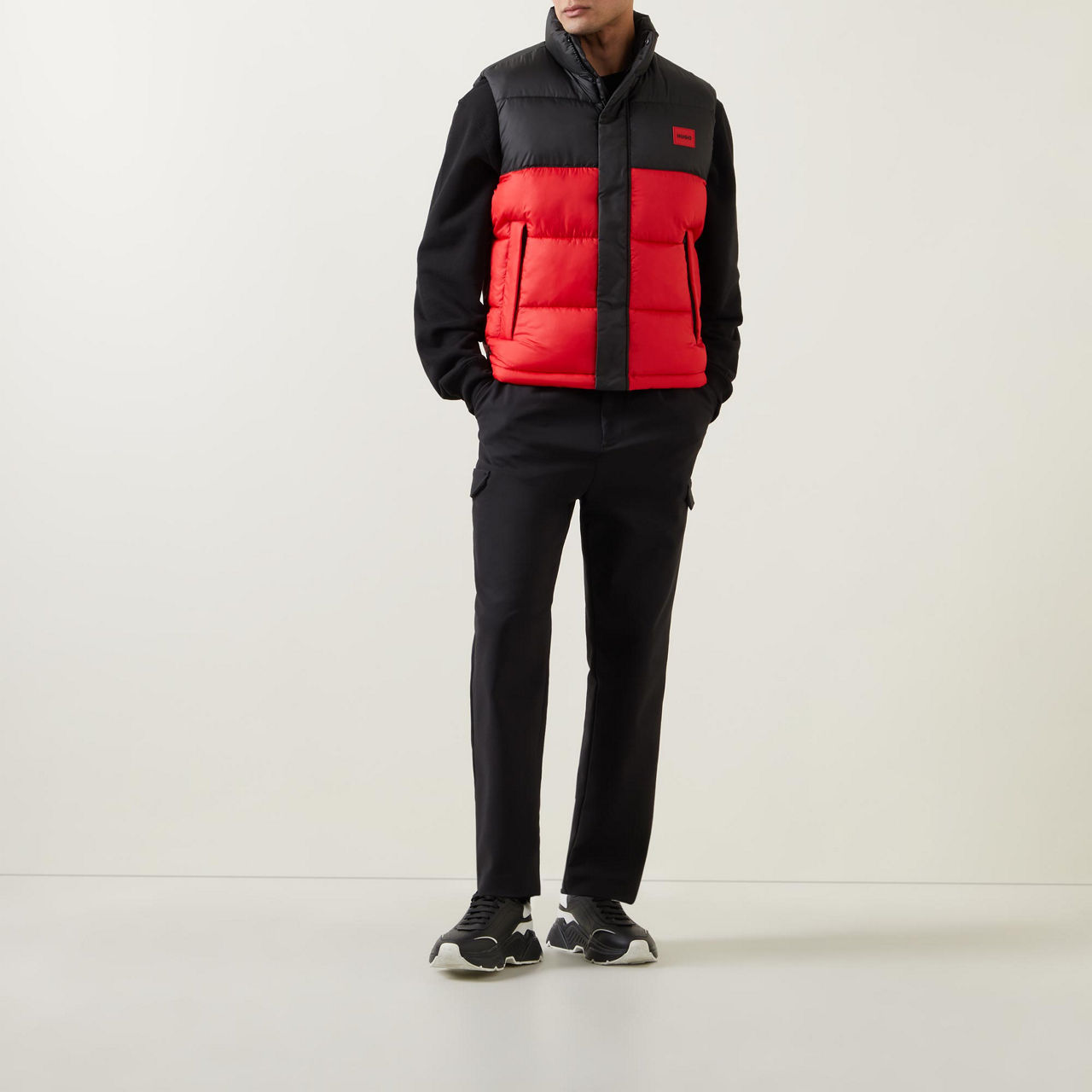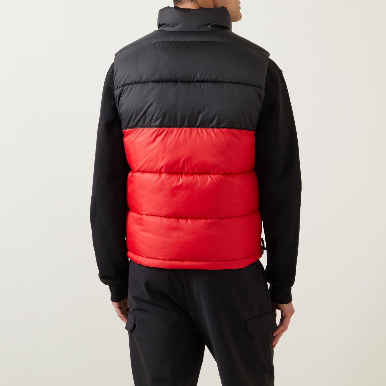 - Sleeveless, quilted padding, stand collar, zip fastening and snap button fastenings, two side pockets, logo badge
