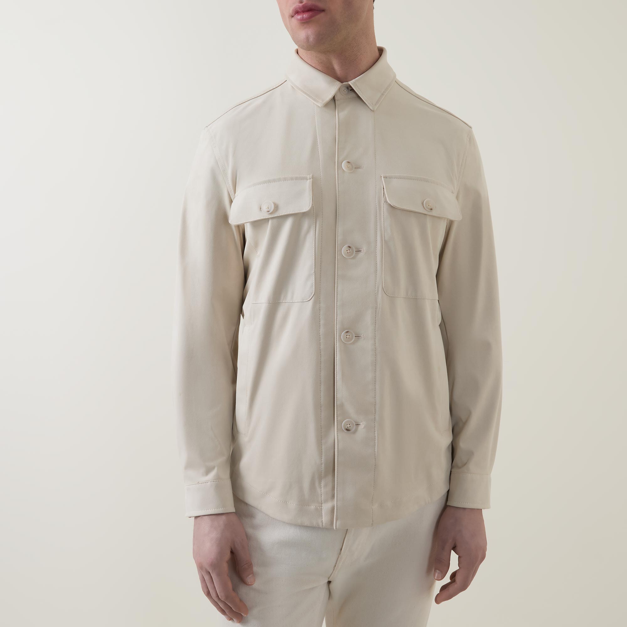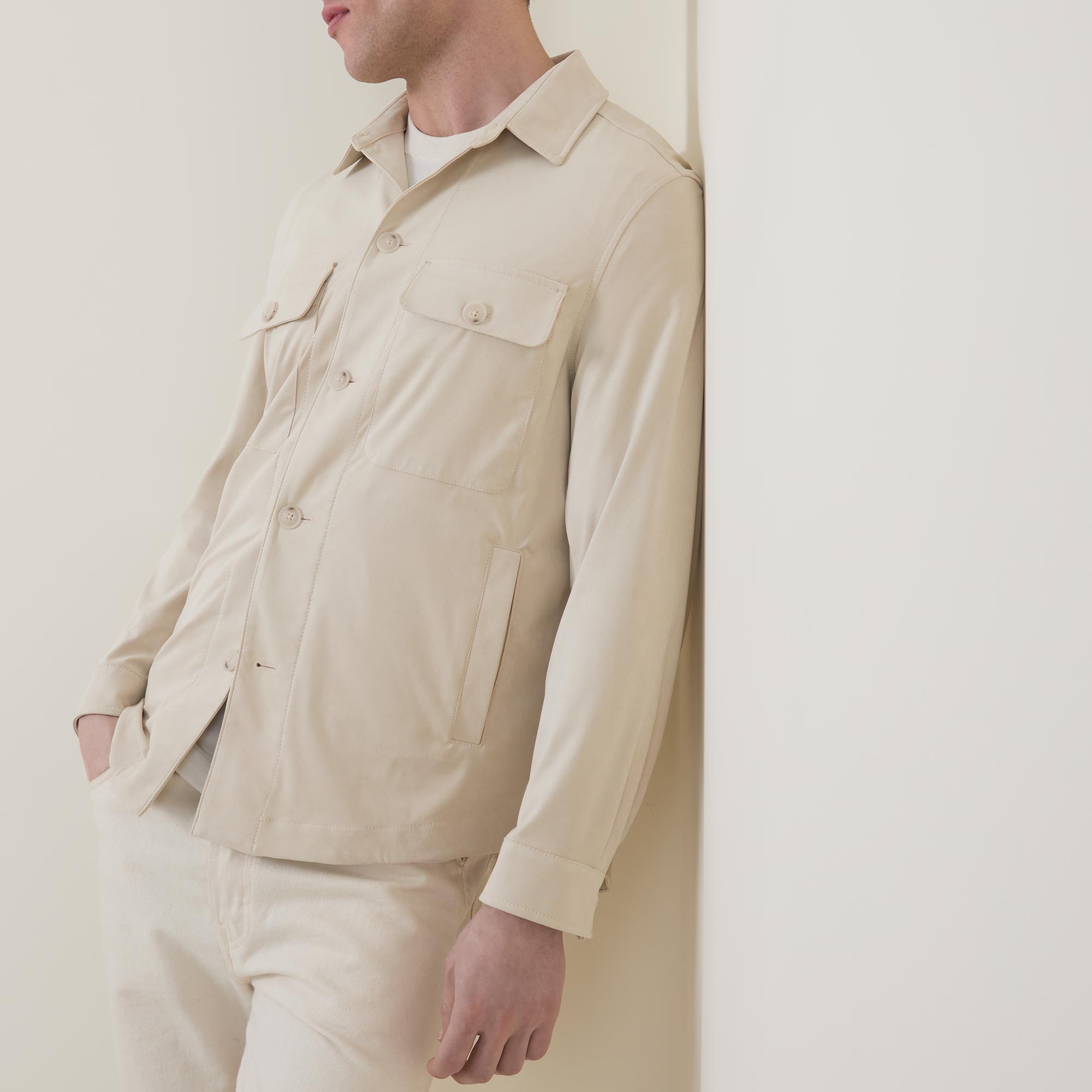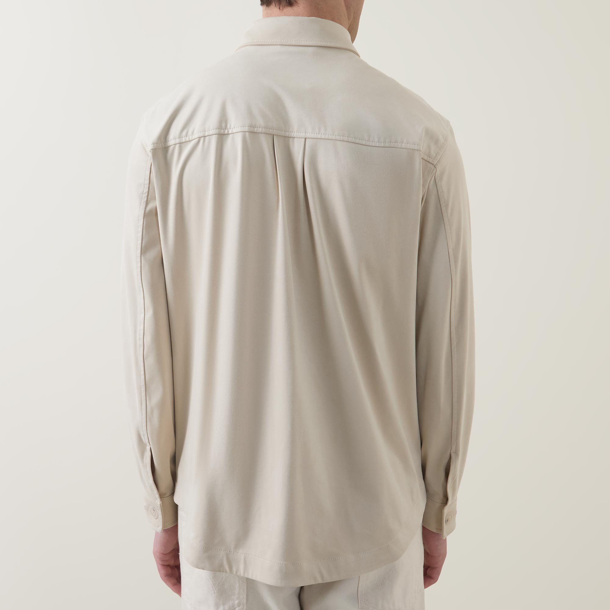 - Collared neckline, button fastening, long sleeves, curved hemline chest pockets with flap and button fastening, buttoned cuffs, box pleat to the rear