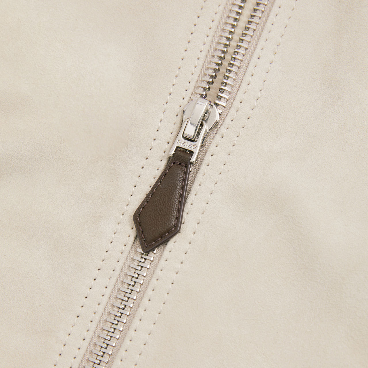 - Suede fabric, elasticated ribbed trims, press-stud side pockets, leather pull tags, two-way front zip fastening, long sleeves, shawl collar, lined