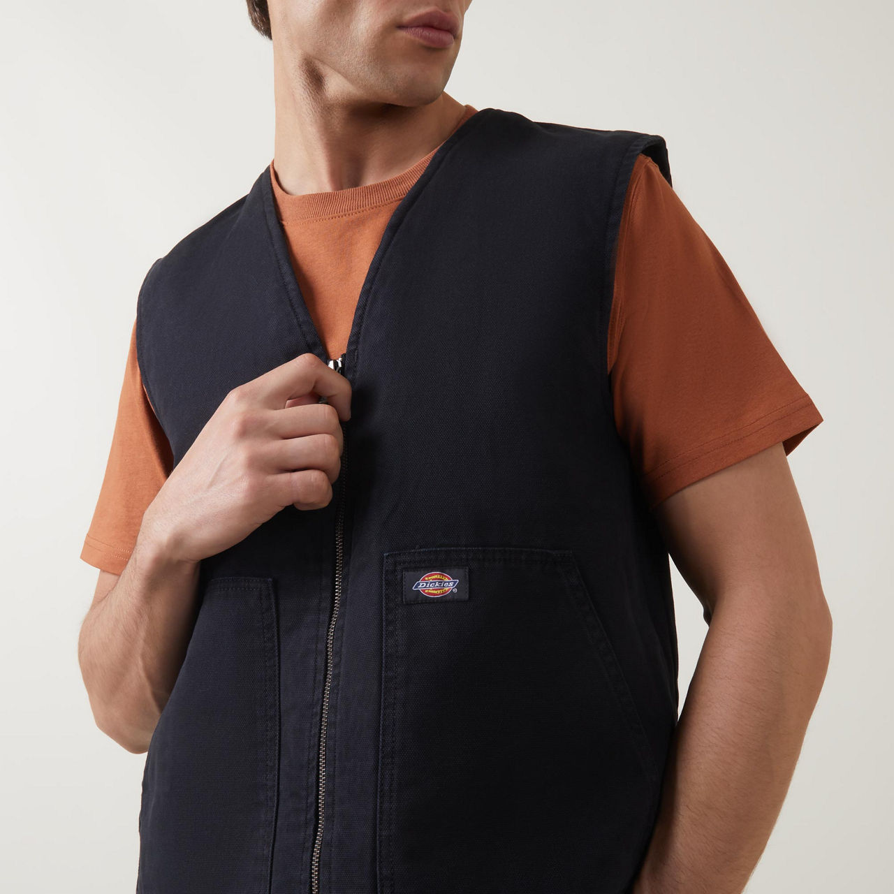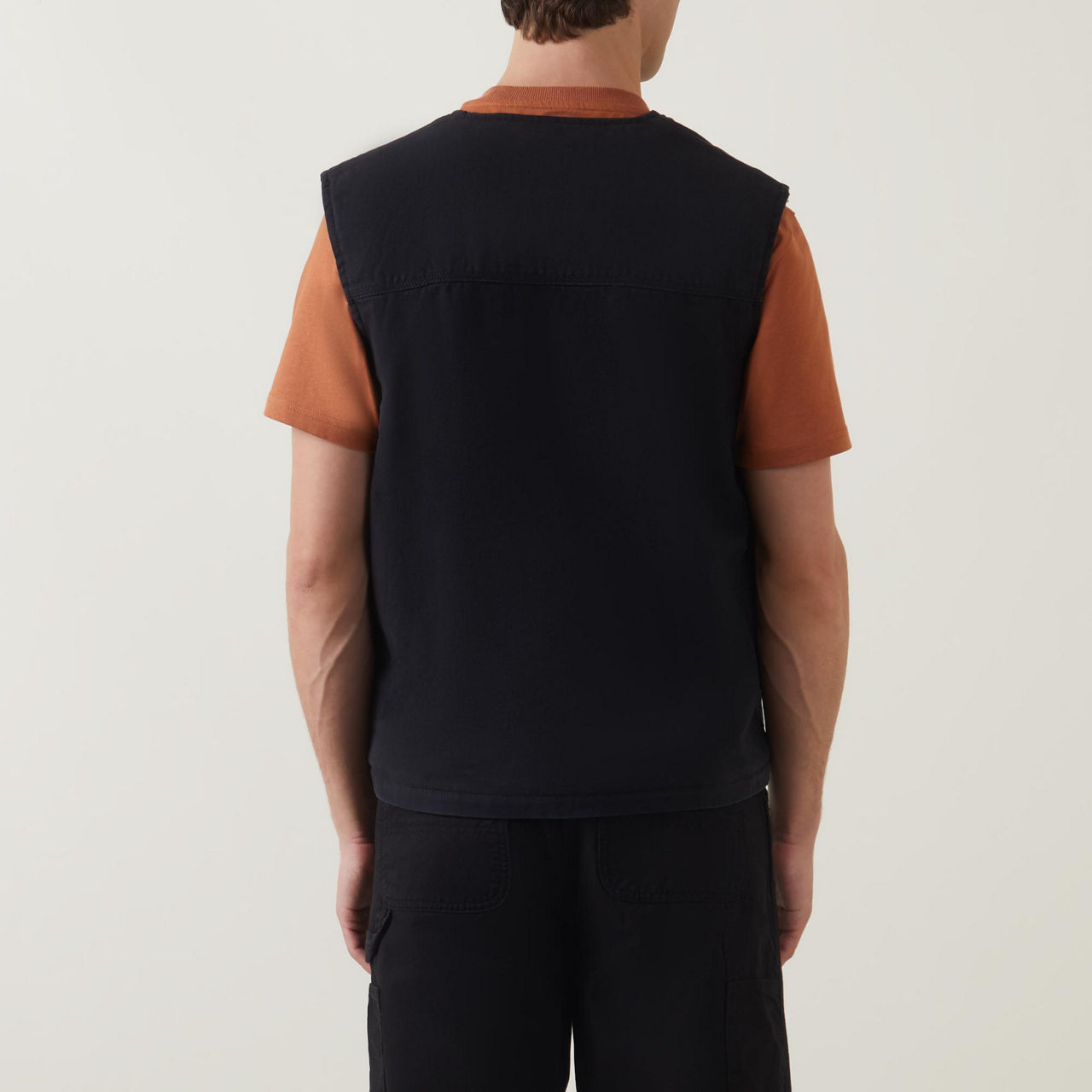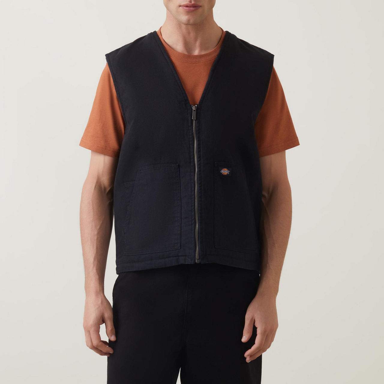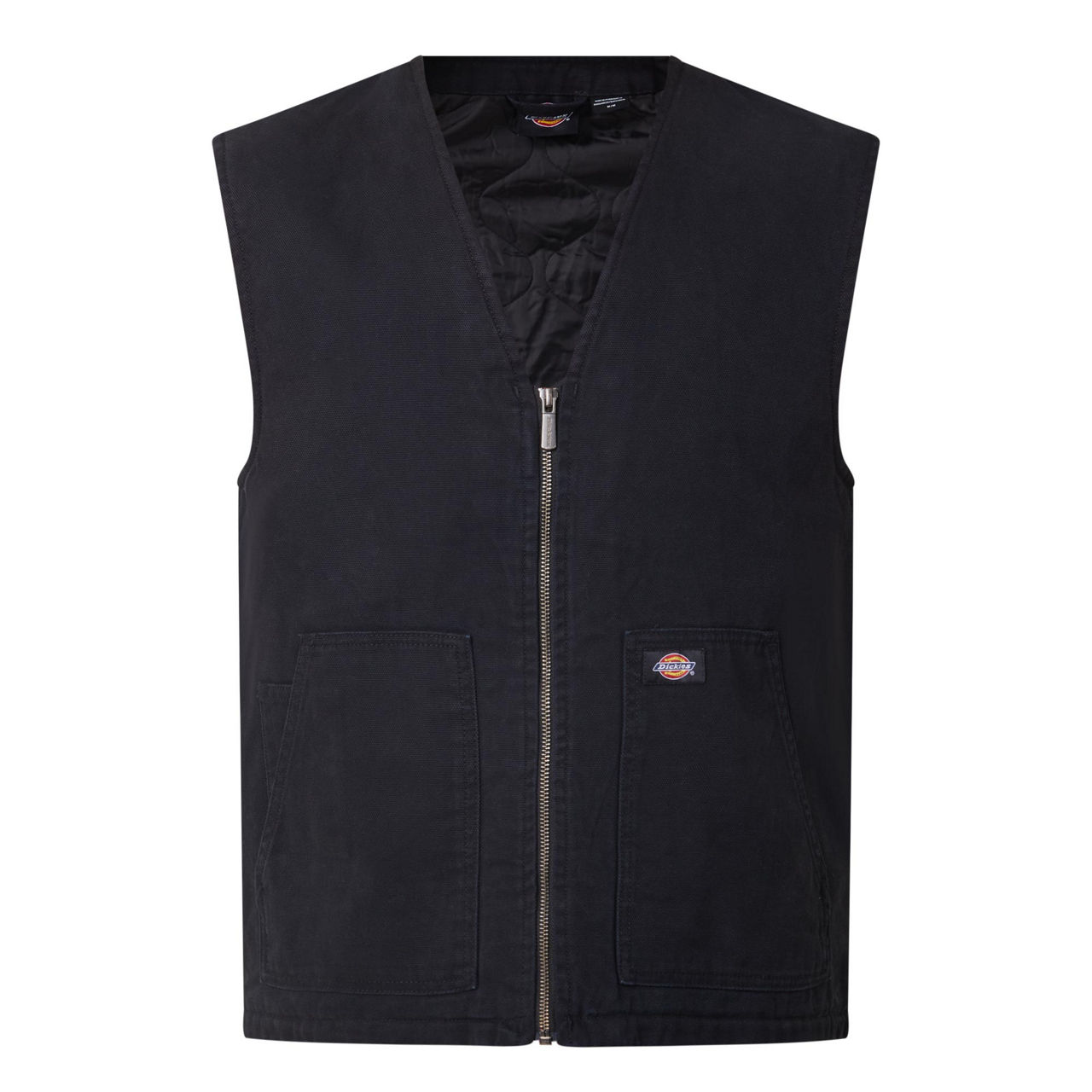 - Sleeveless, logo detail, zip fastening, V-neckline, front pockets