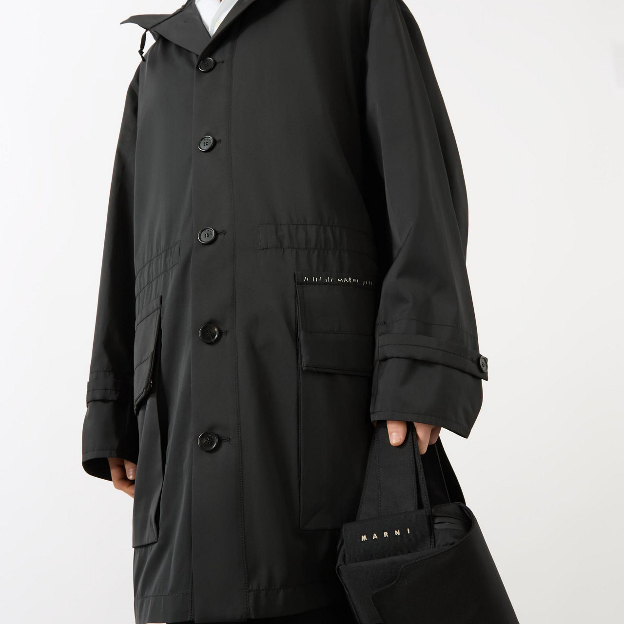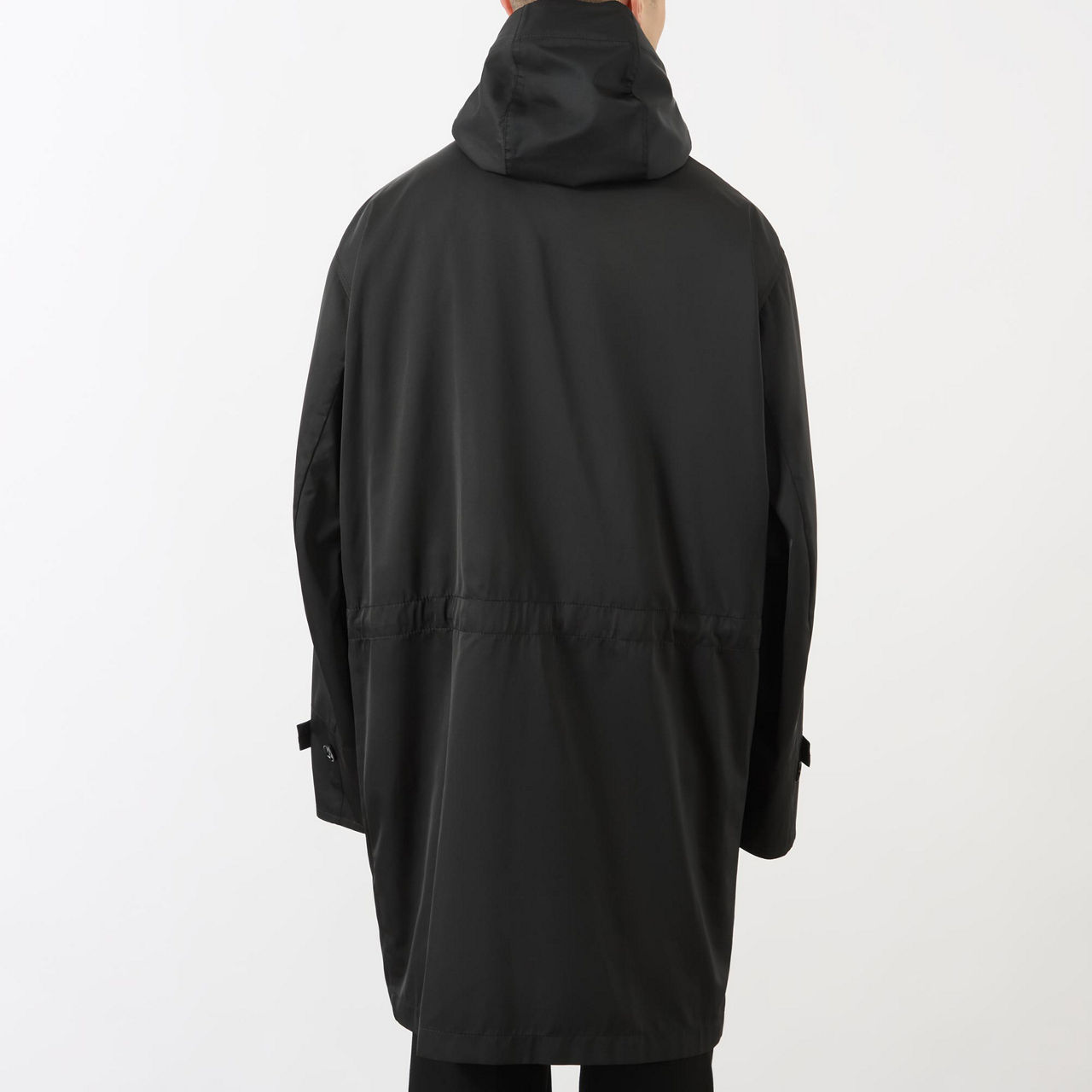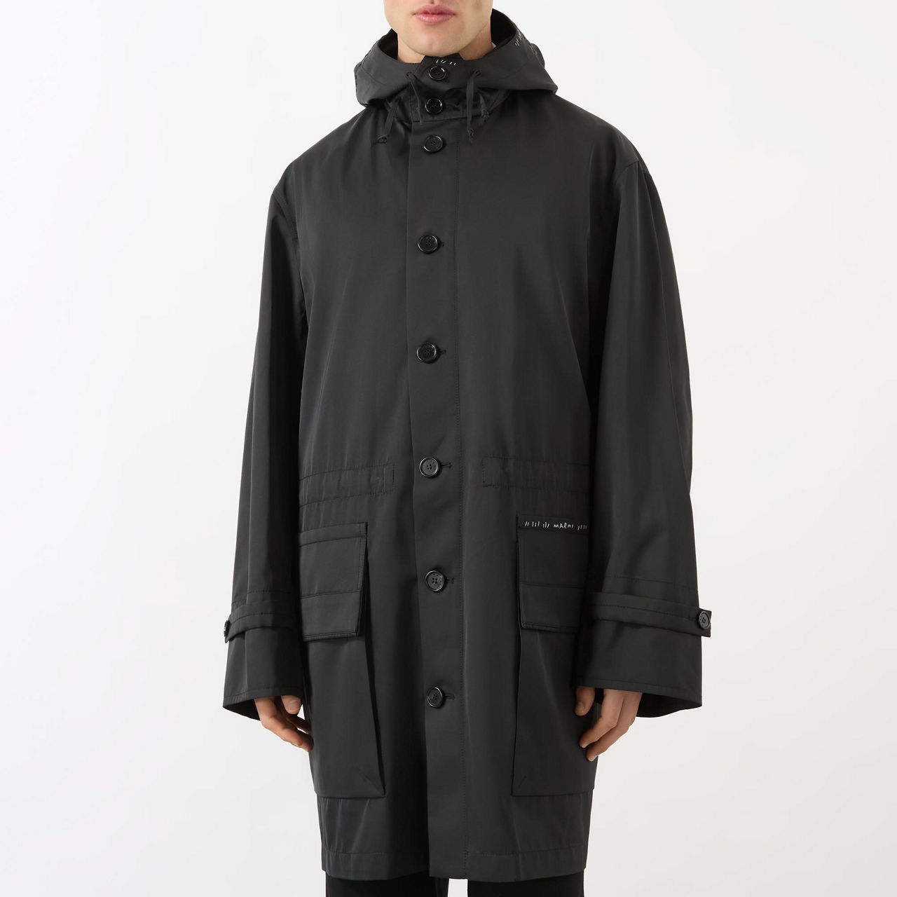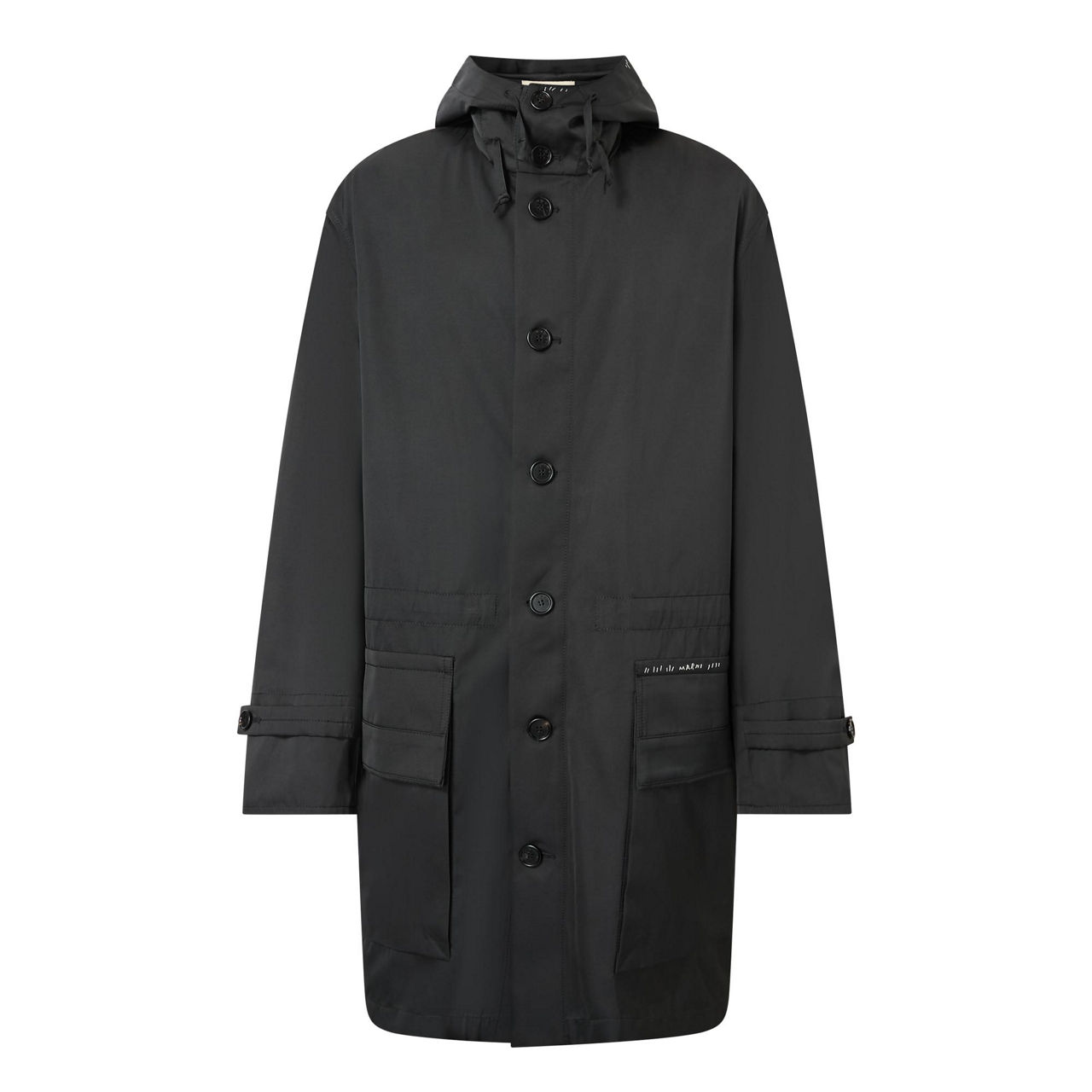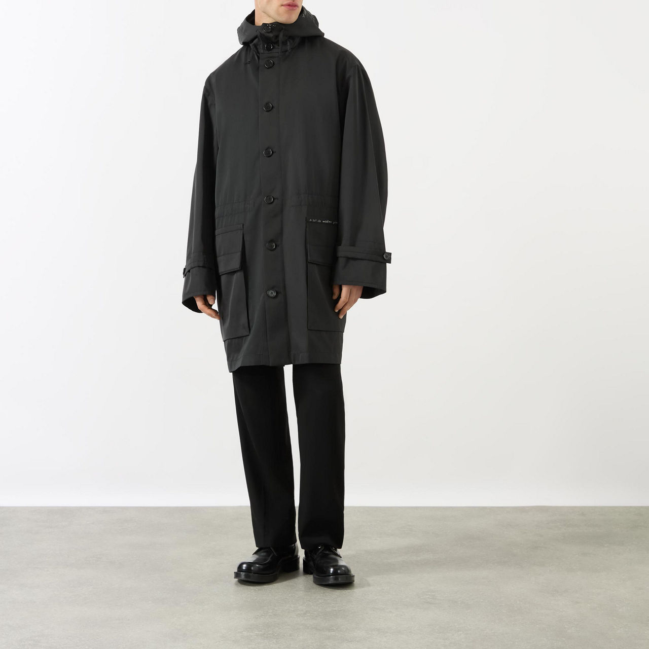 - Long sleeves, adjustable drawcord hood, dropped shoulders, button fastening placket, inner drawstring waistband, adjustable cuffs, two oversized patch pockets, longline silhouette