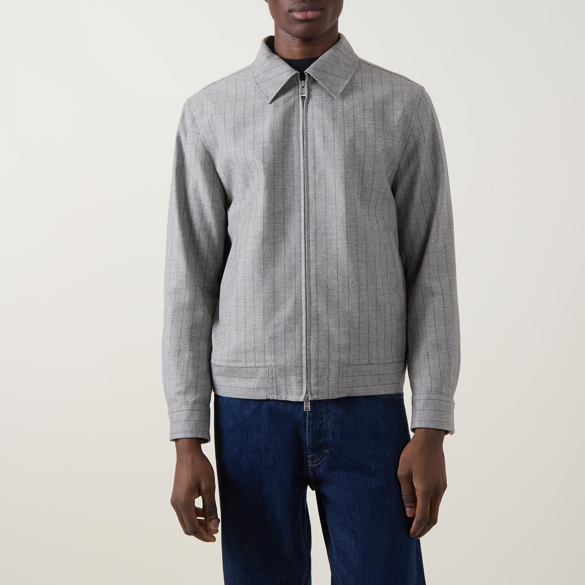 - Flat collar, two-way zip fastening, straight hemline, long sleeves, check pattern, logo details, zipped side entry pockets