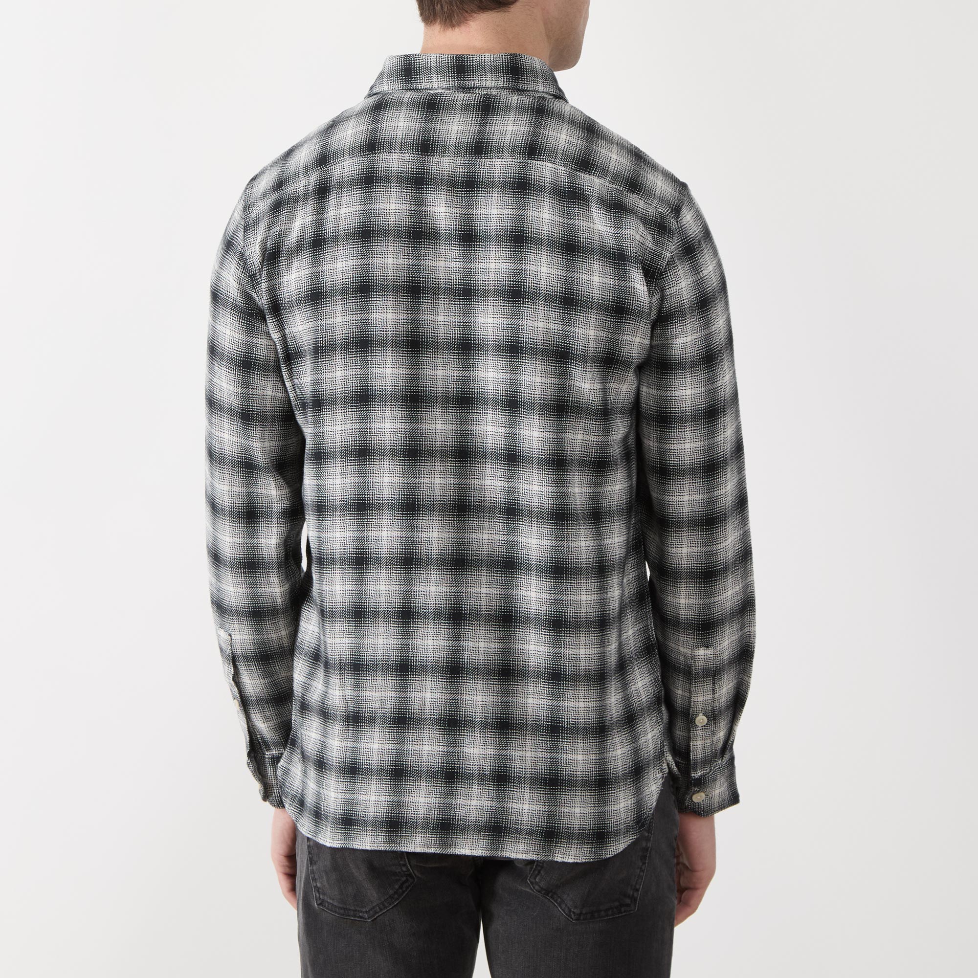 - Point collar, long sleeves, buttoned cuffs, two chest flap pockets with button fastenings, curved hemline, logo detail, check pattern