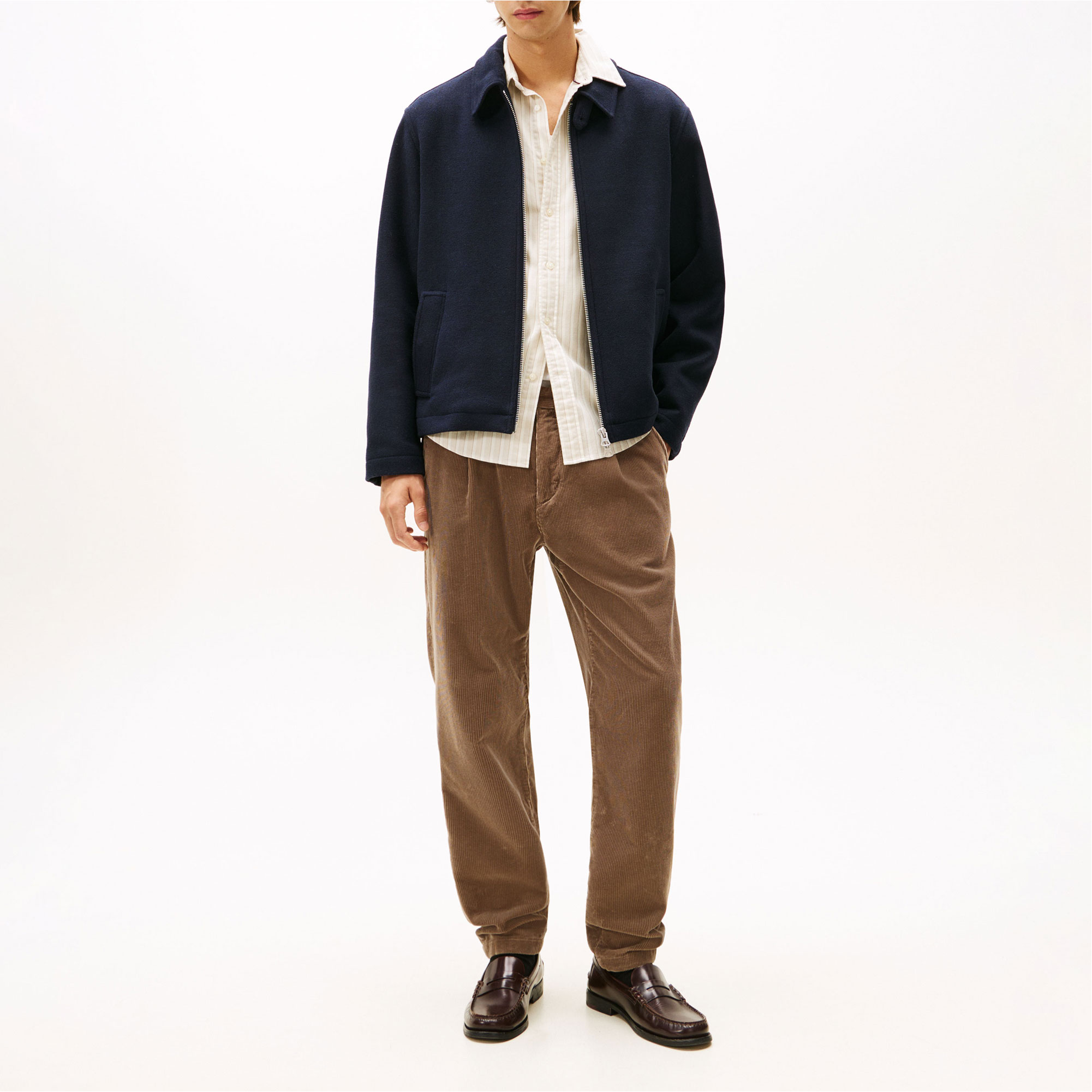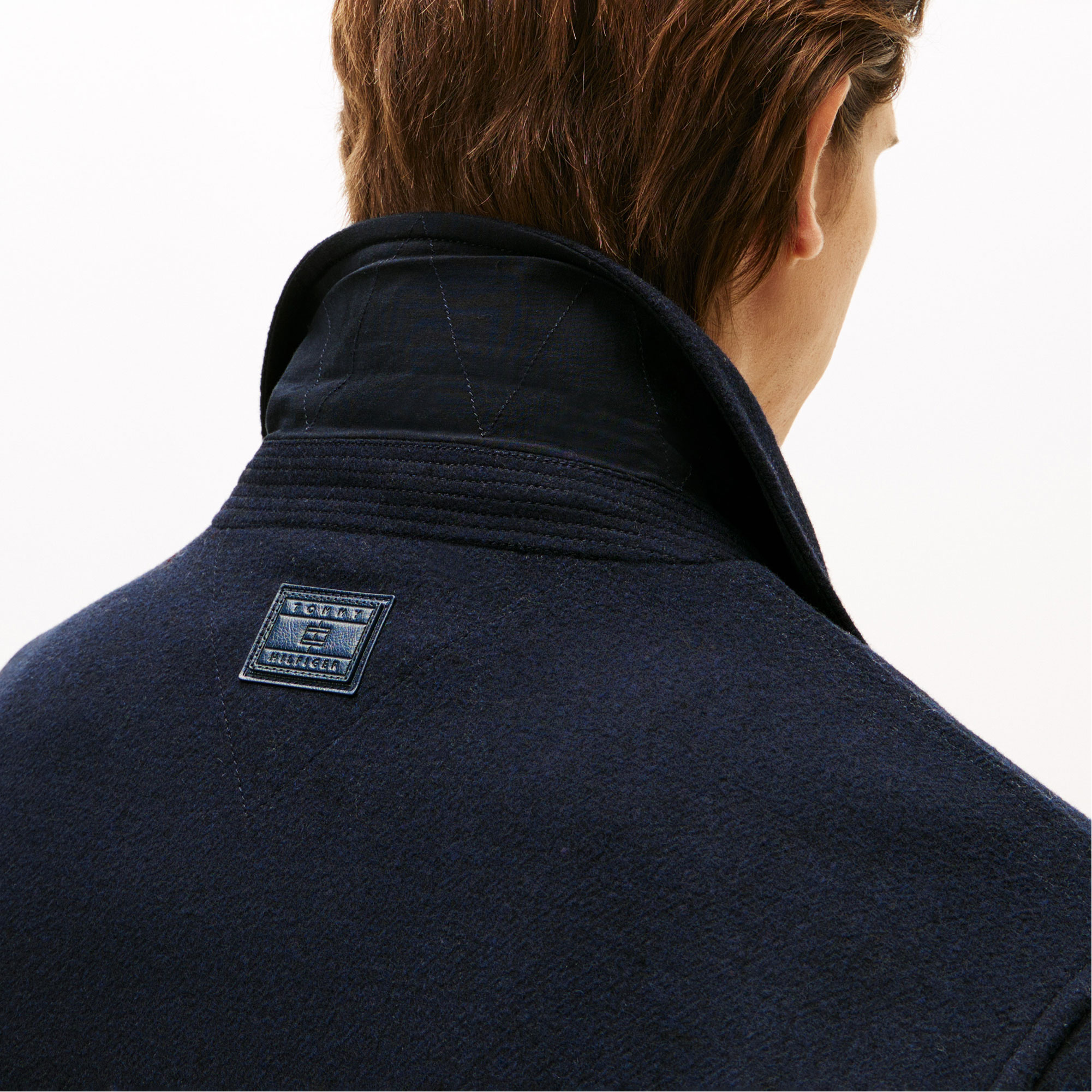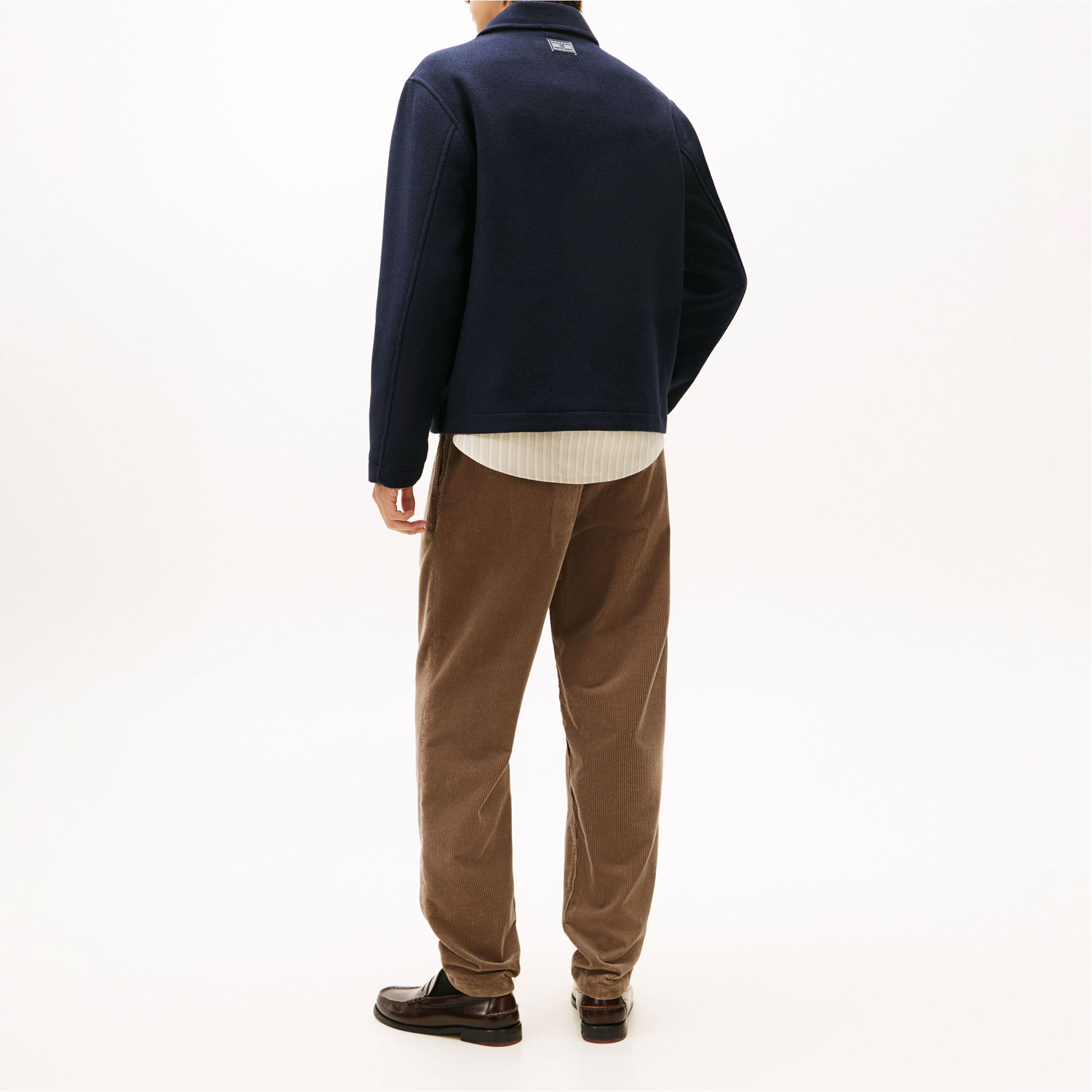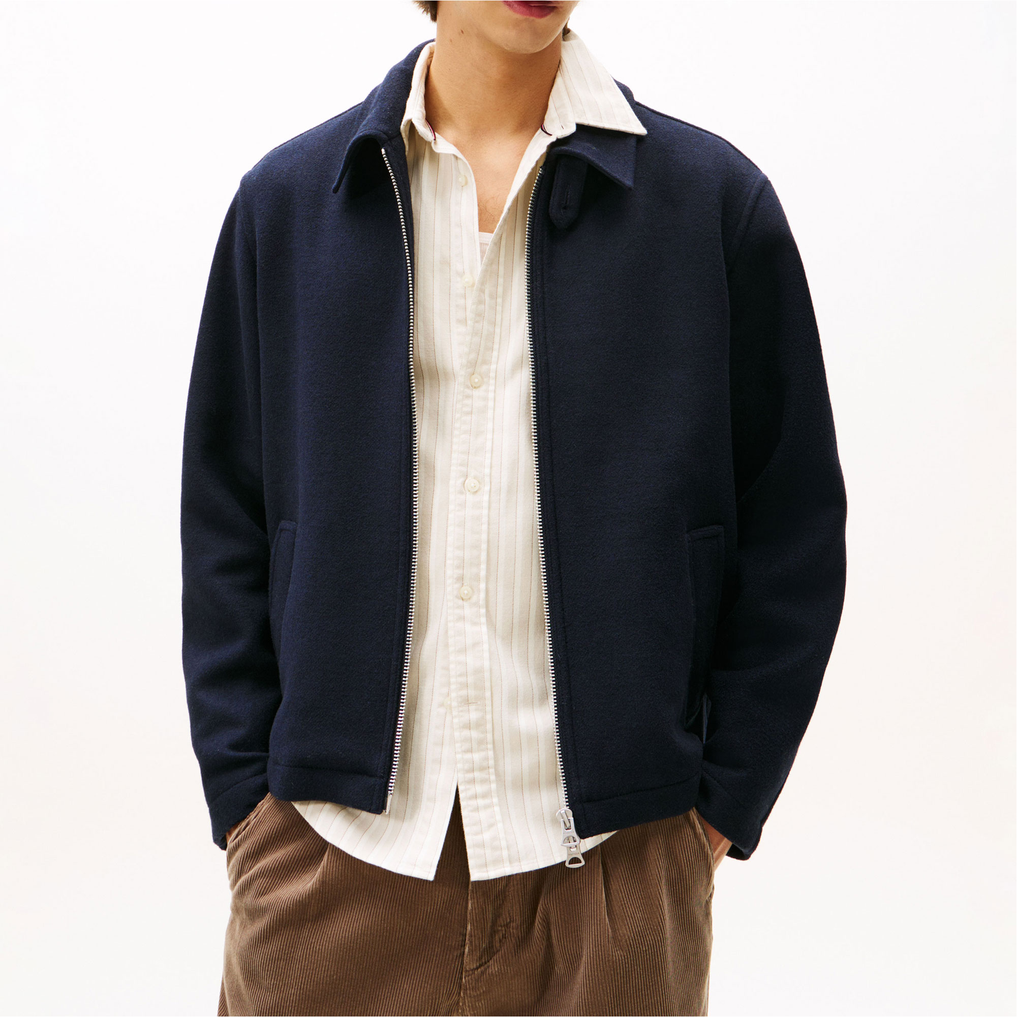 - Wool blend, tonal logo patch detail, semi-spread collar, zip fastening, two slip pockets, interior slip pocket, branding details