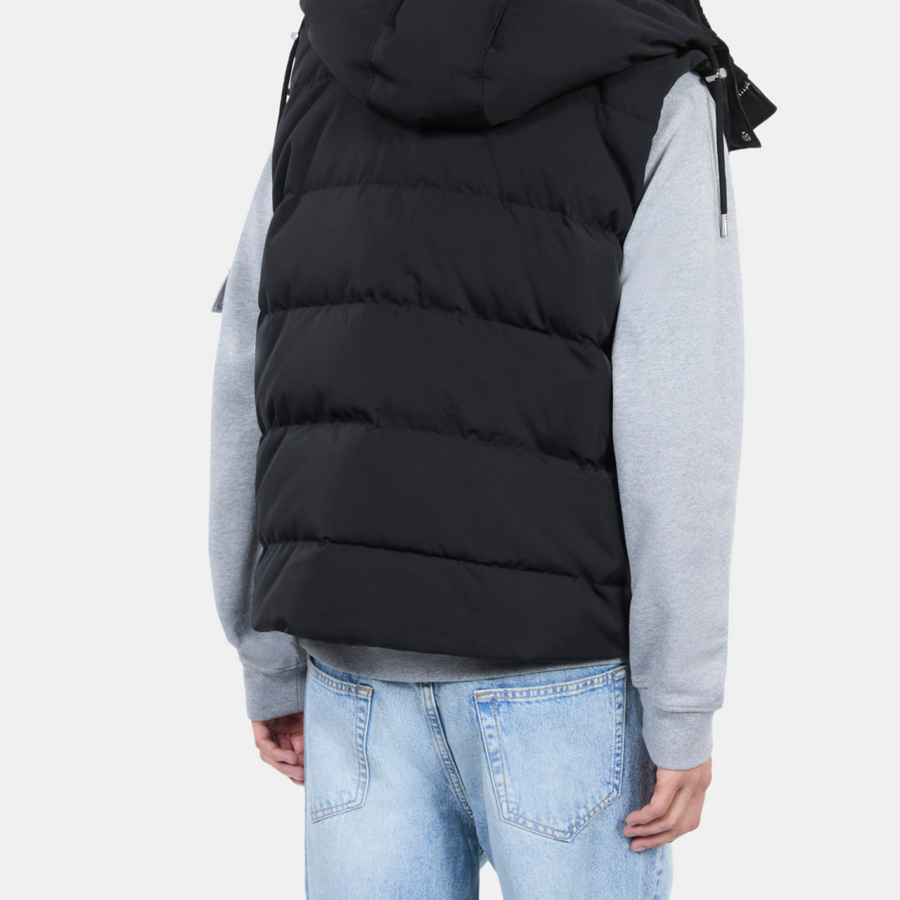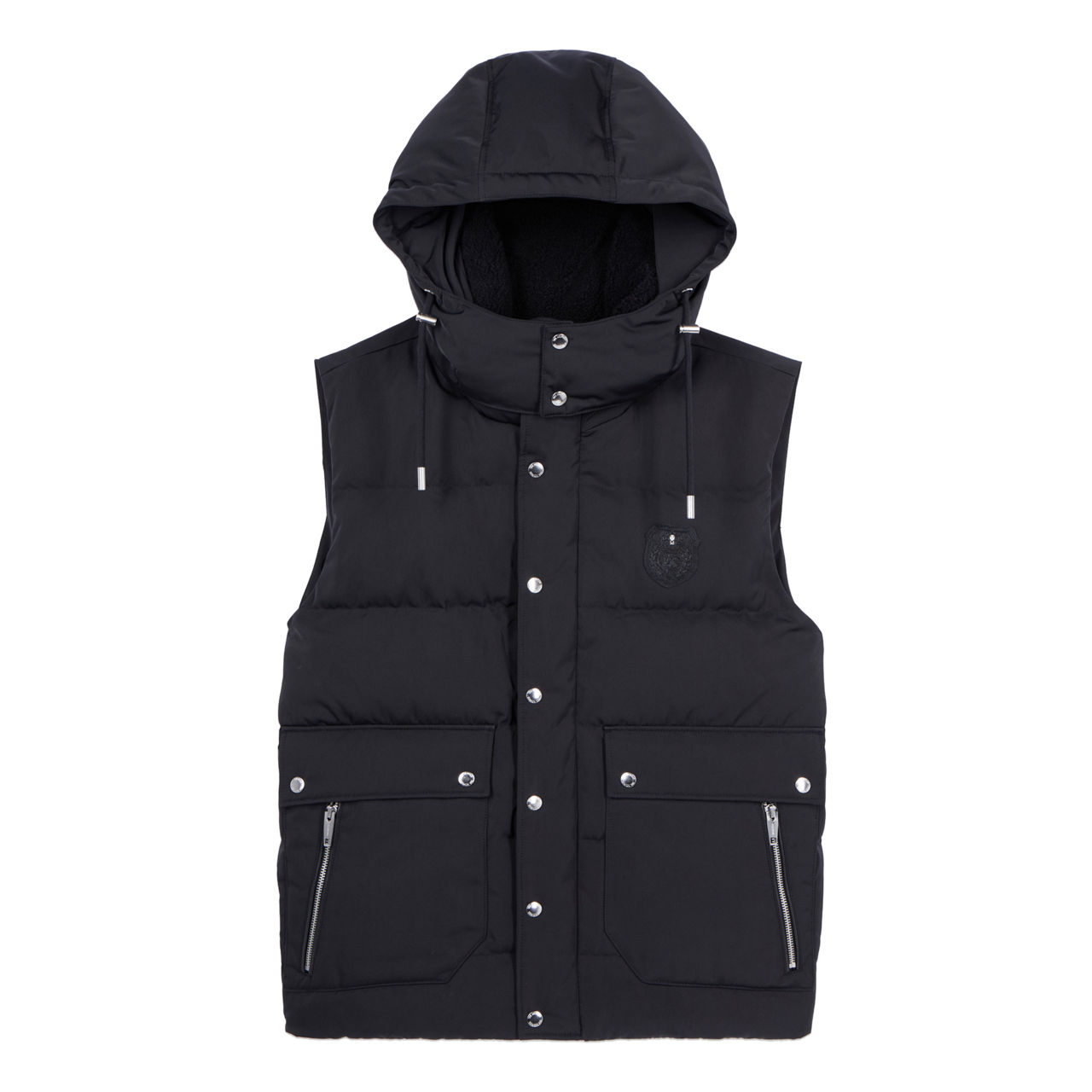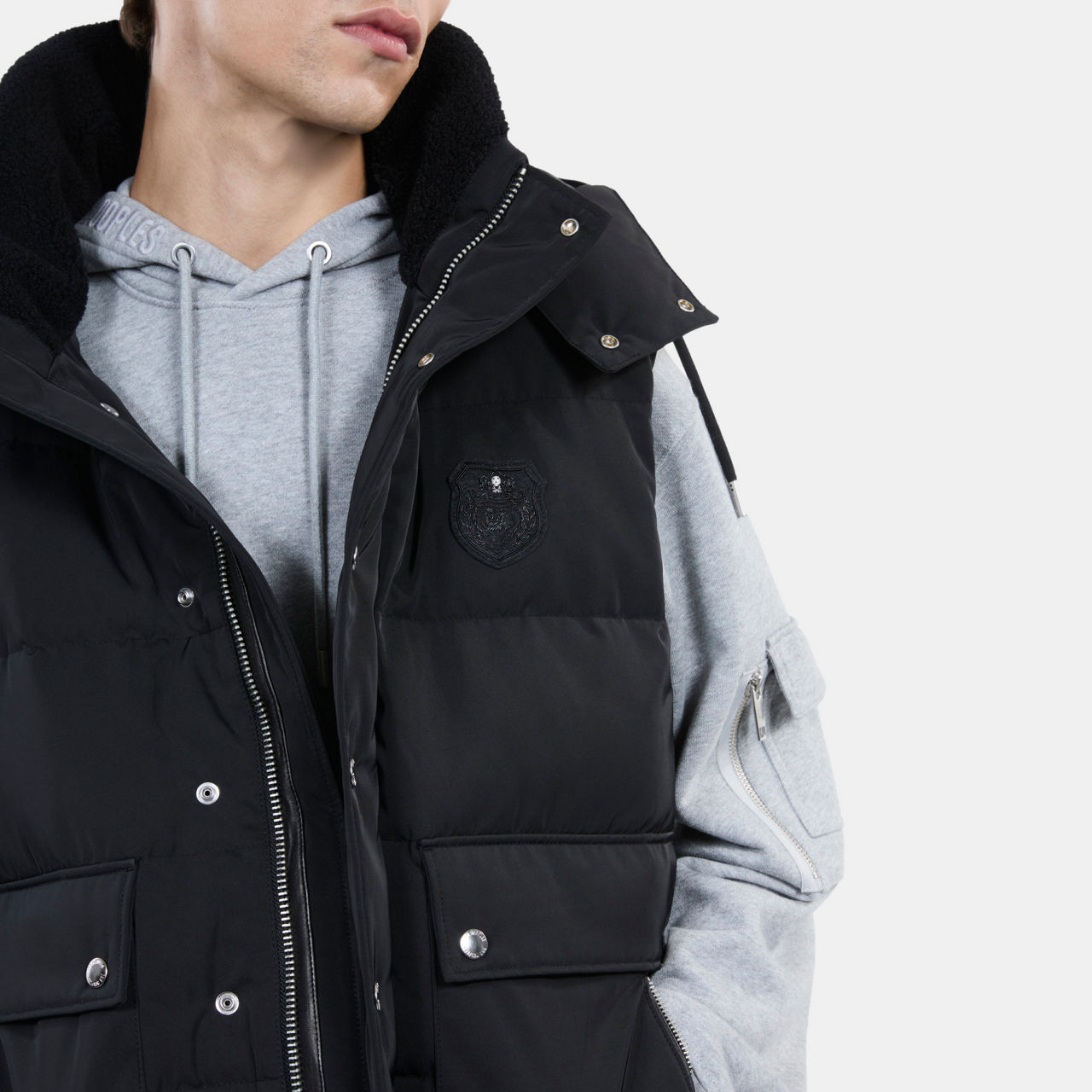 - Straight cut, hood with drawstring fastening, sleeveless, press stud fastenings, flap patch pockets, zipped pockets, logo patch, funnel neckline