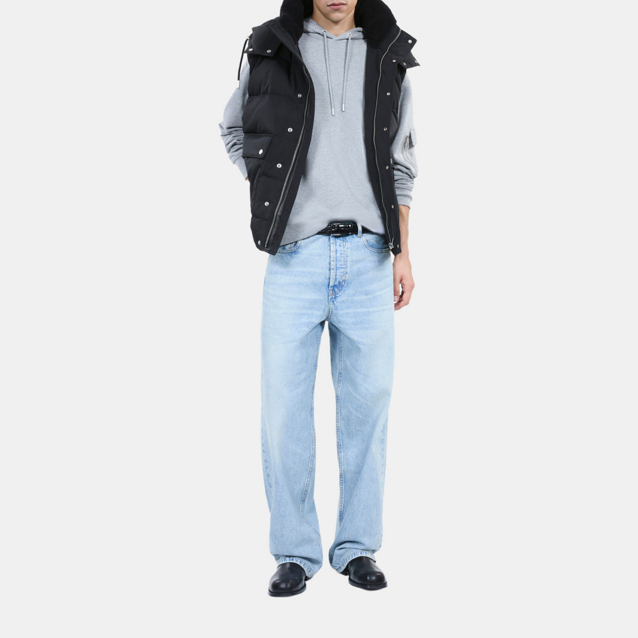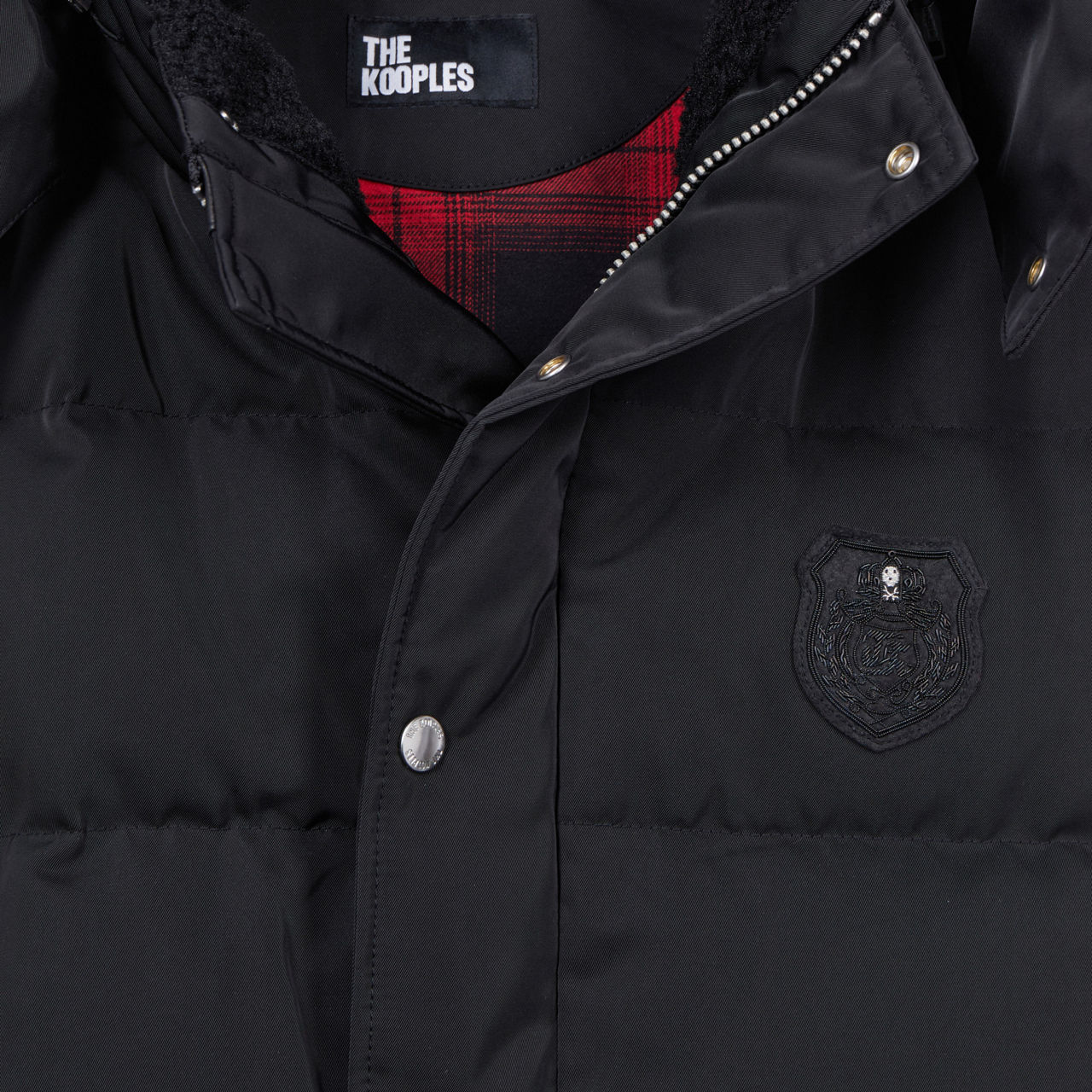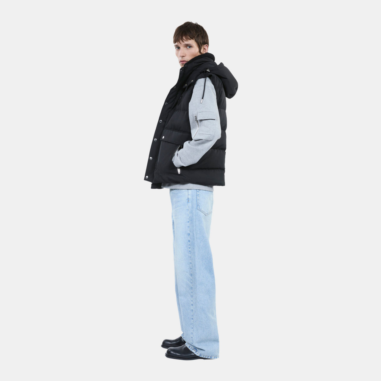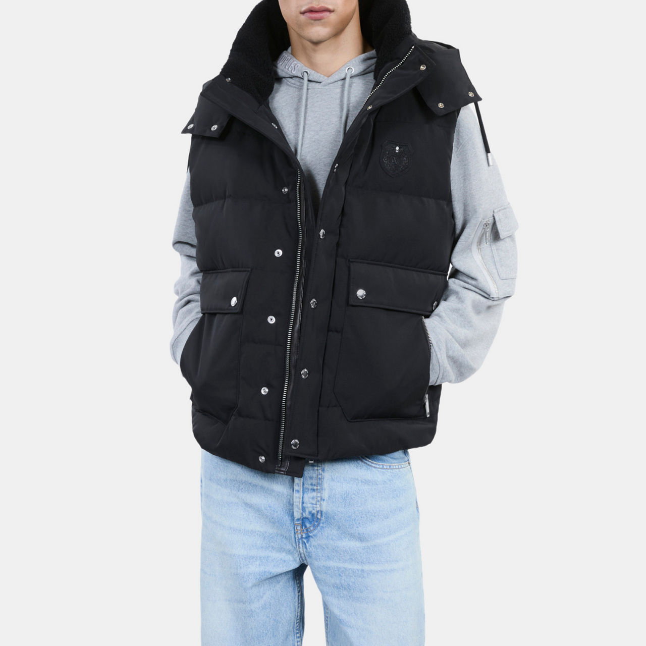 - Straight cut, hood with drawstring fastening, sleeveless, press stud fastenings, flap patch pockets, zipped pockets, logo patch, funnel neckline