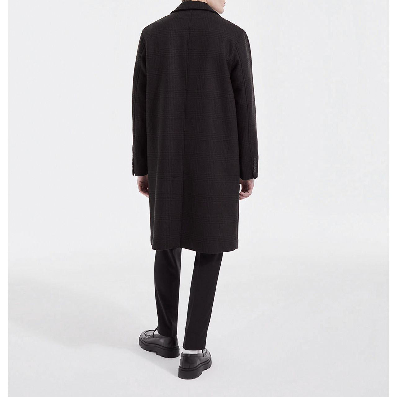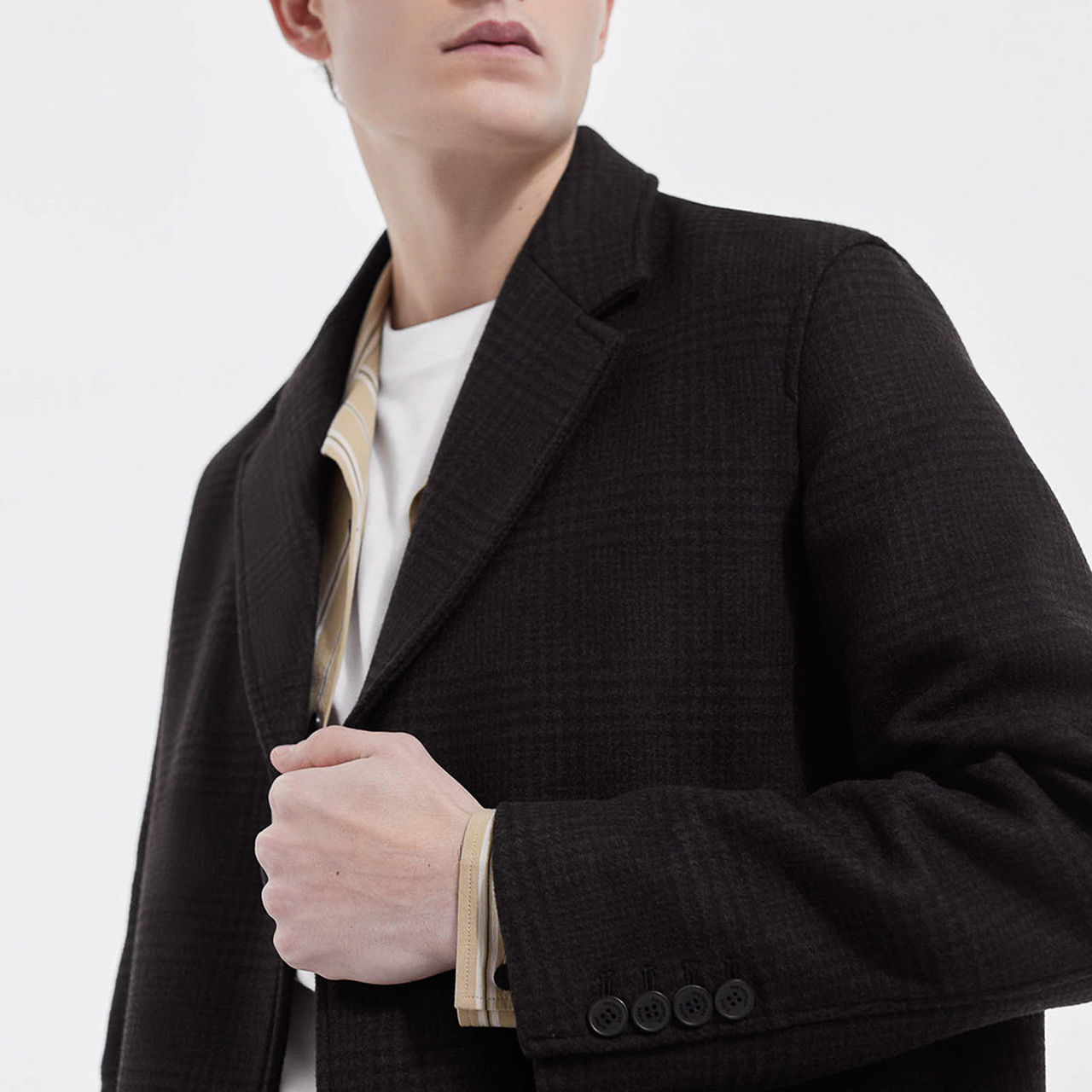 - Double face material, long cut, oversized collar, long sleeves, two piped side pockets, three-button fastening, all-over check print.