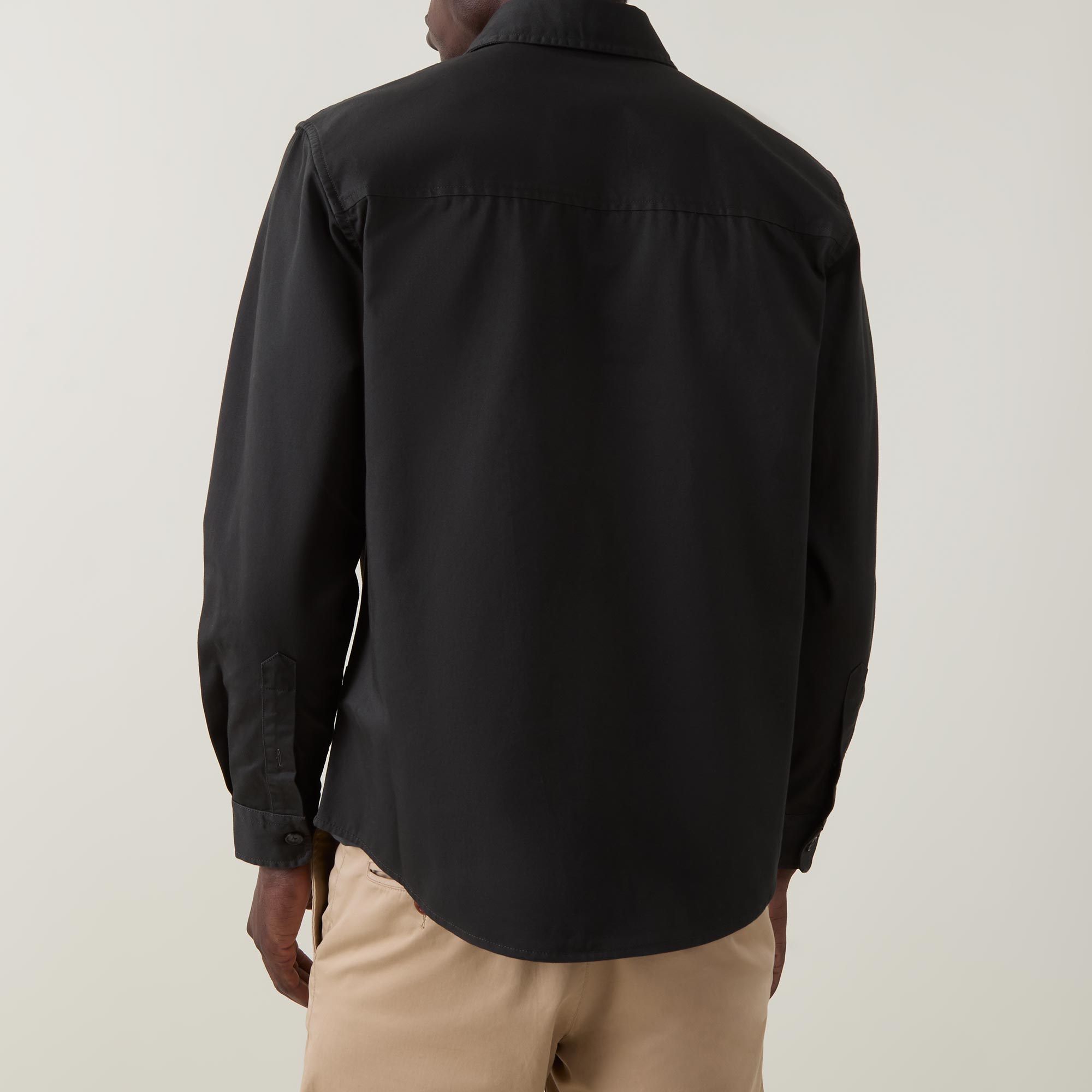- Long sleeves, pointed collar, logo patch, curved hemline, button fastenings