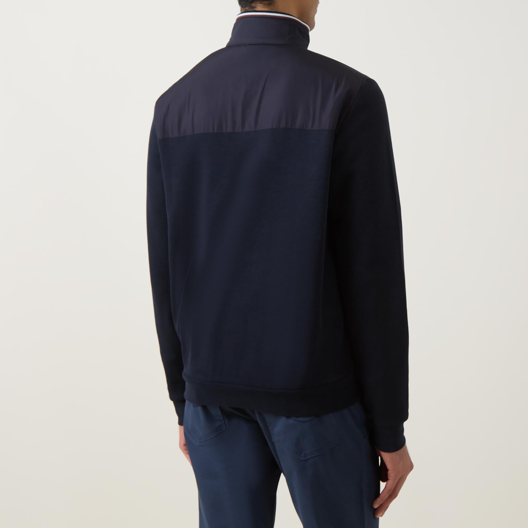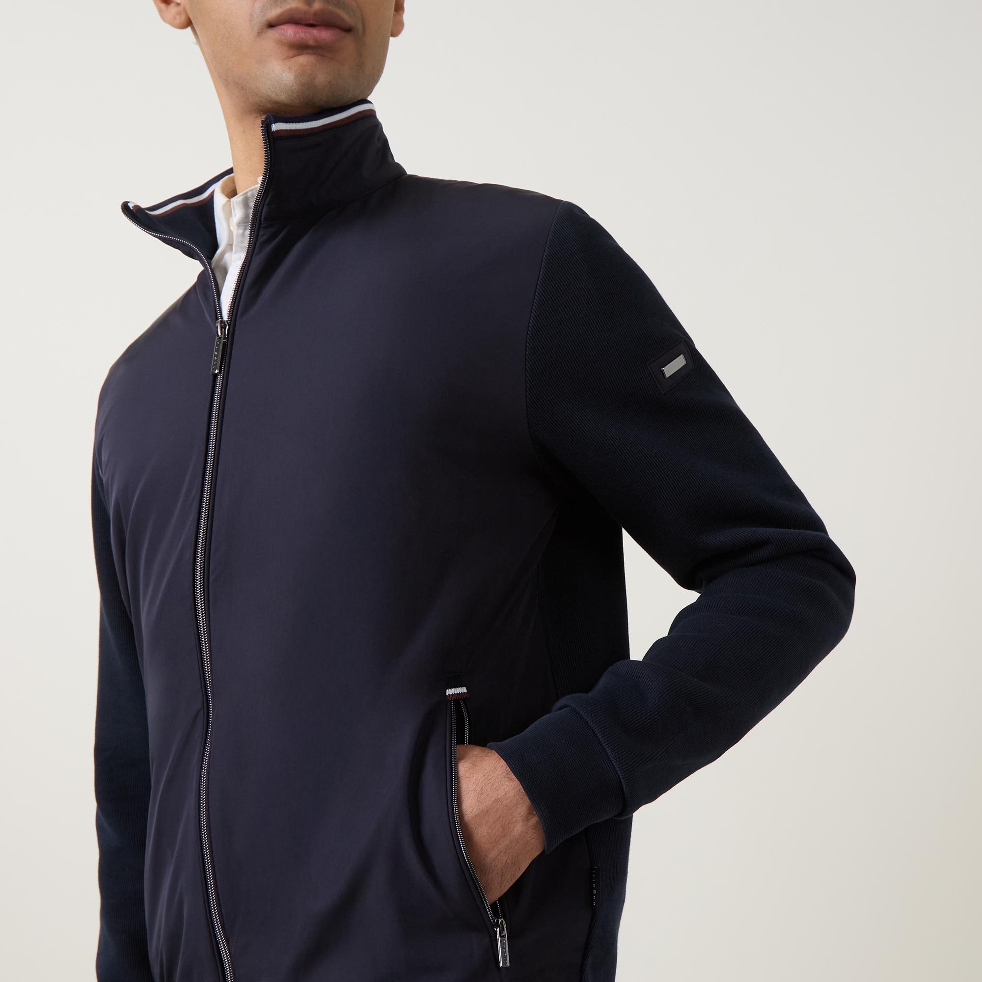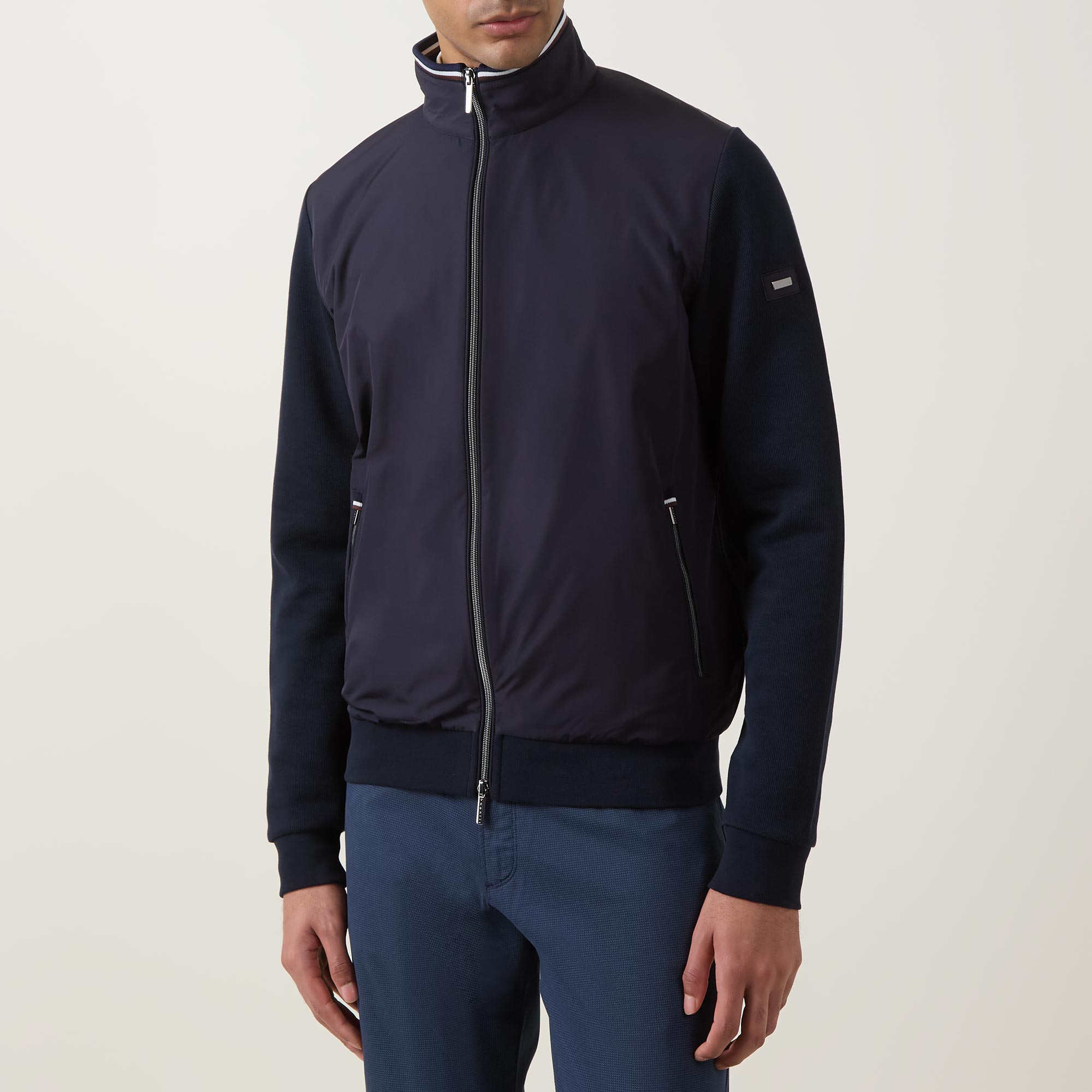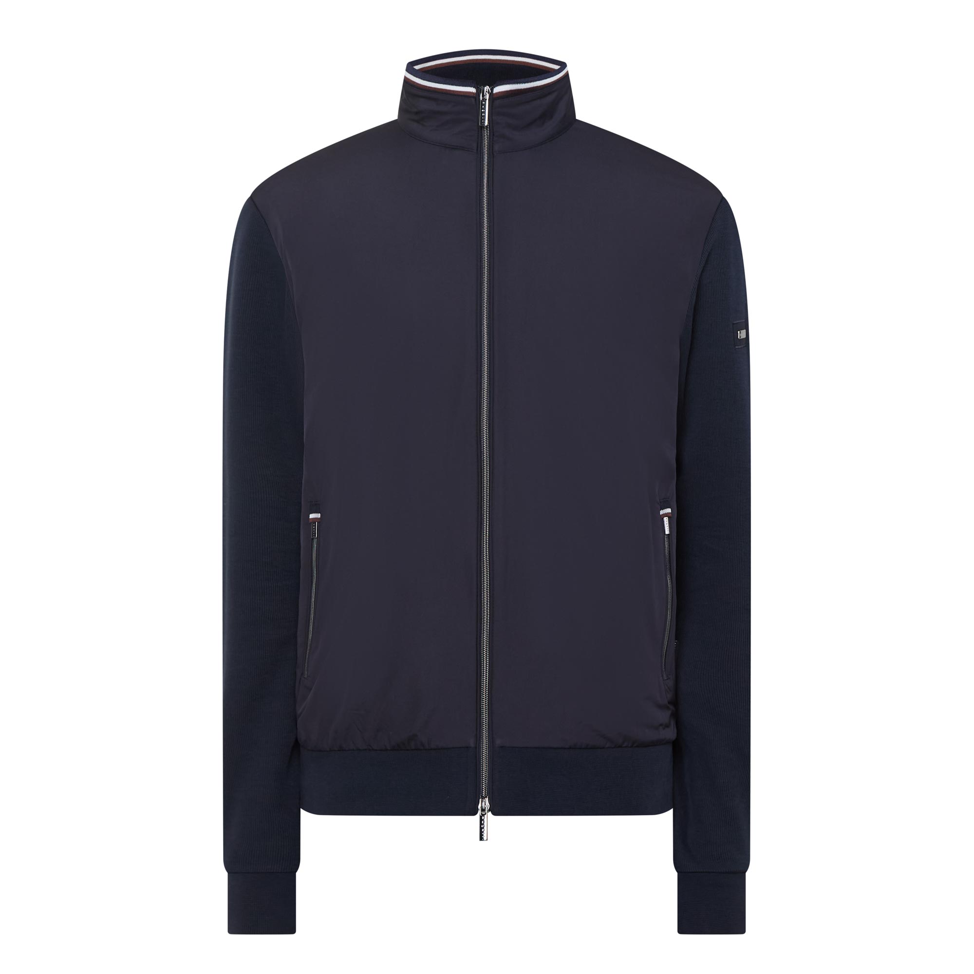 - Standing collar, two-way zip fastening, zipped side entry pockets, logo tab detail, hybrid style with coated bodice and knit sleeves and back panel