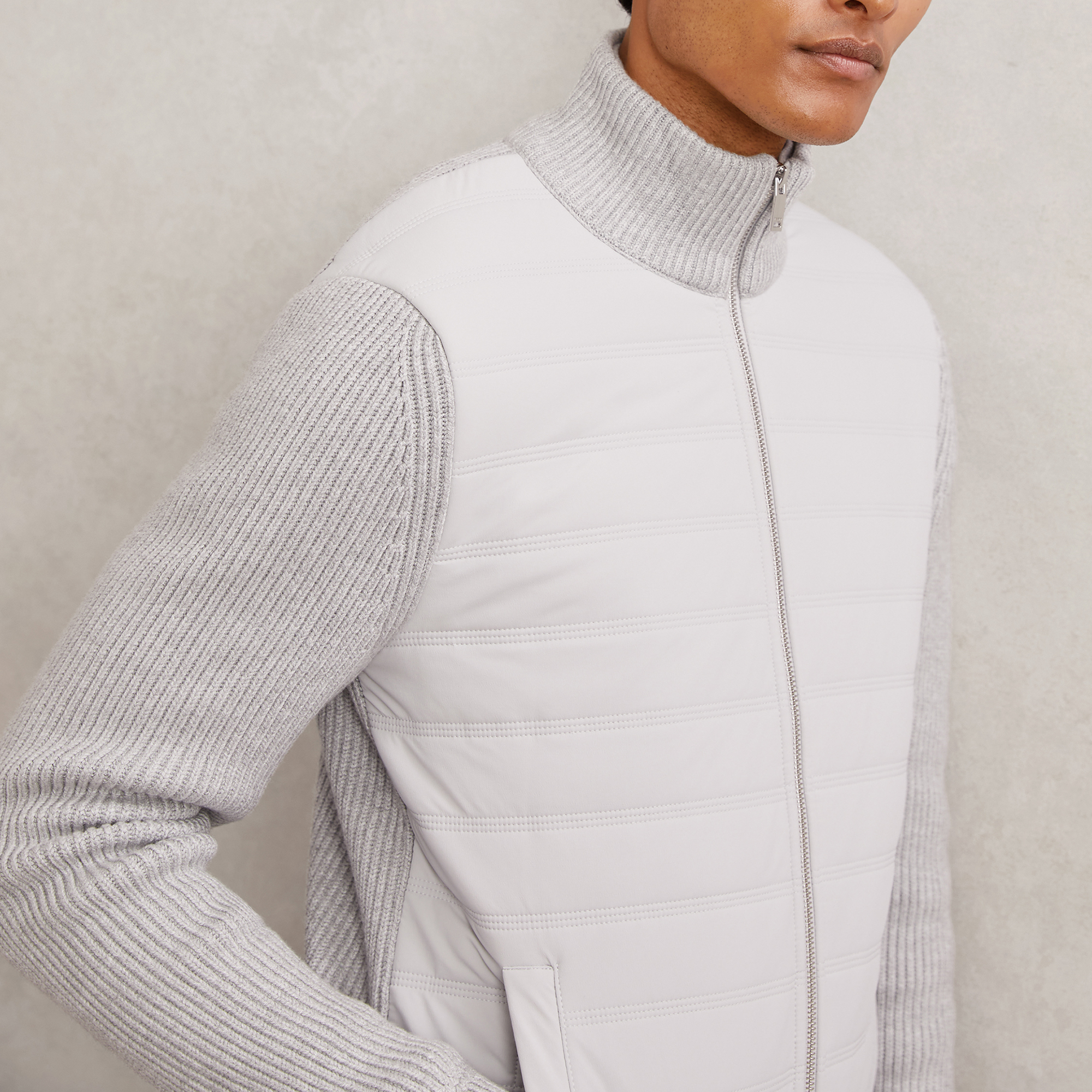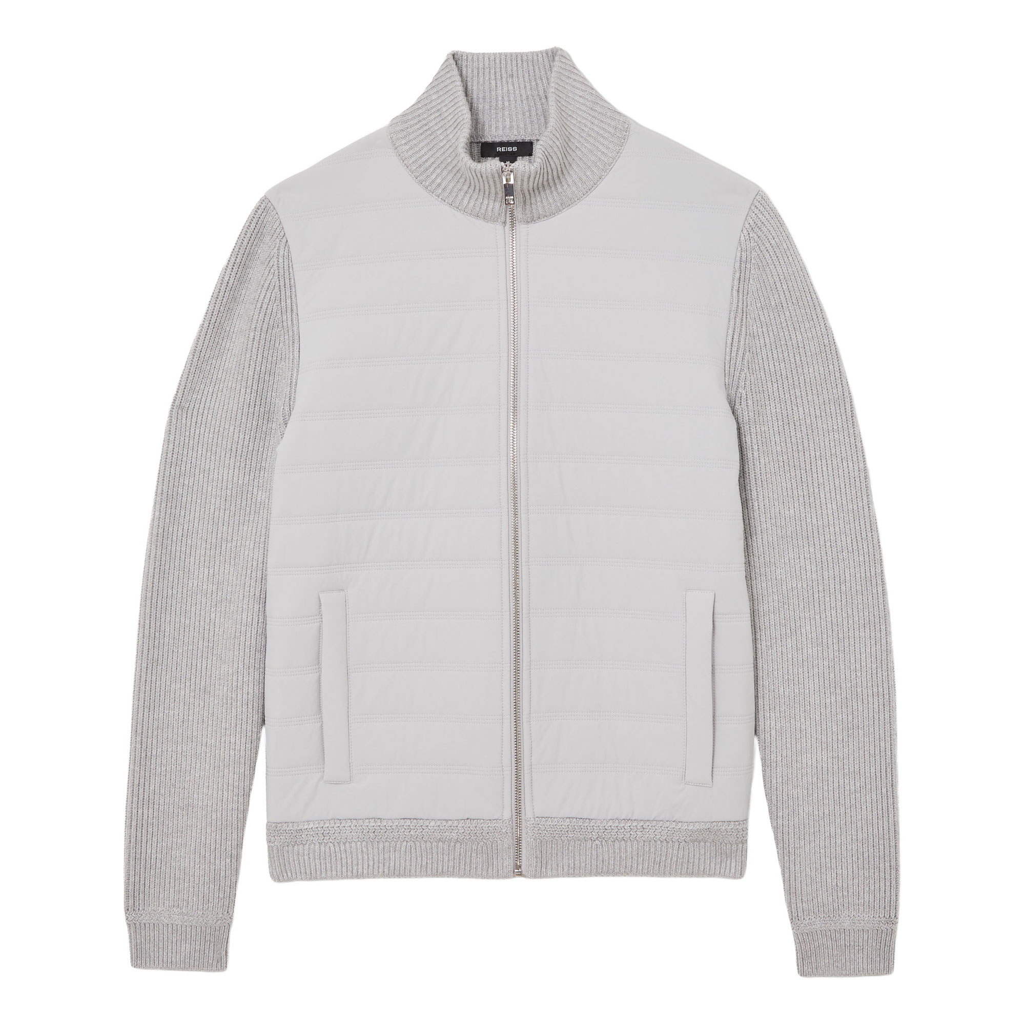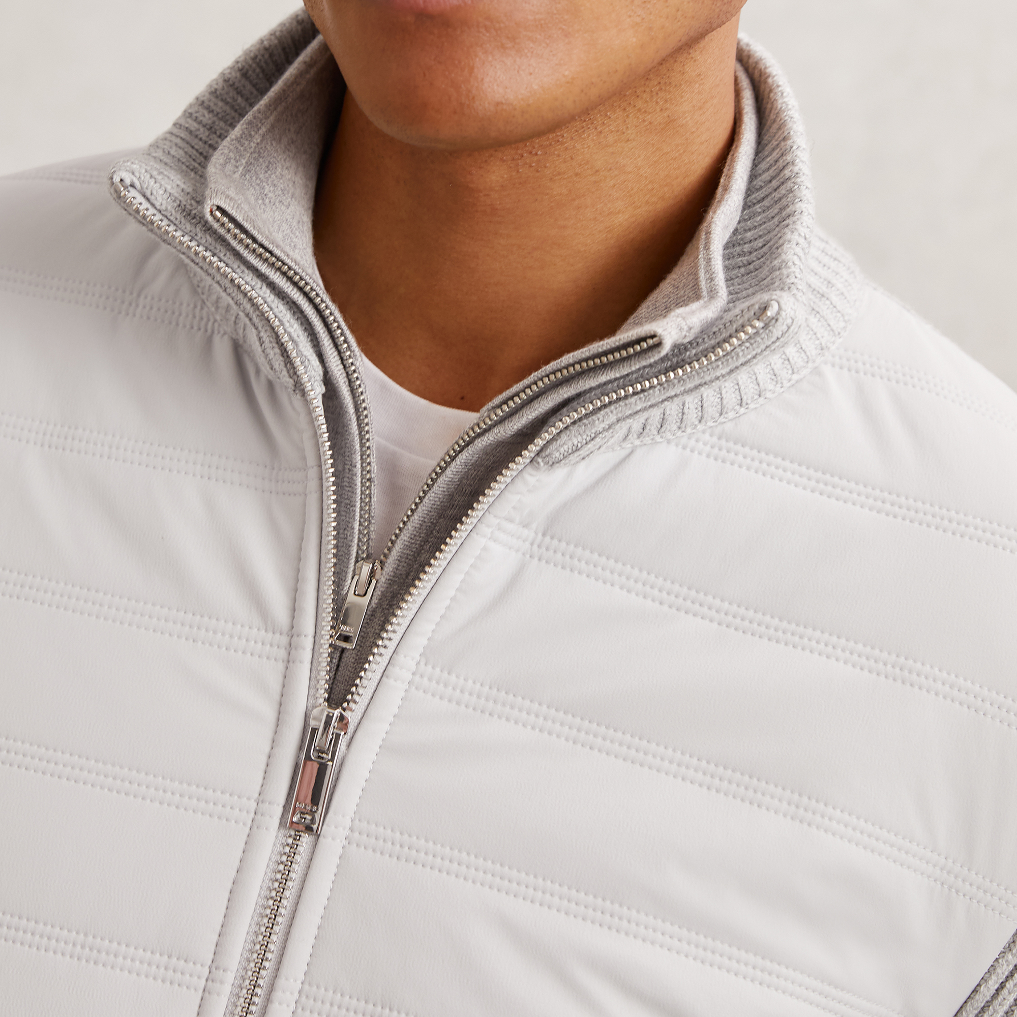 - Quilted front panels with soft rib-knit construction, funnel neck, side slip pockets, front zip