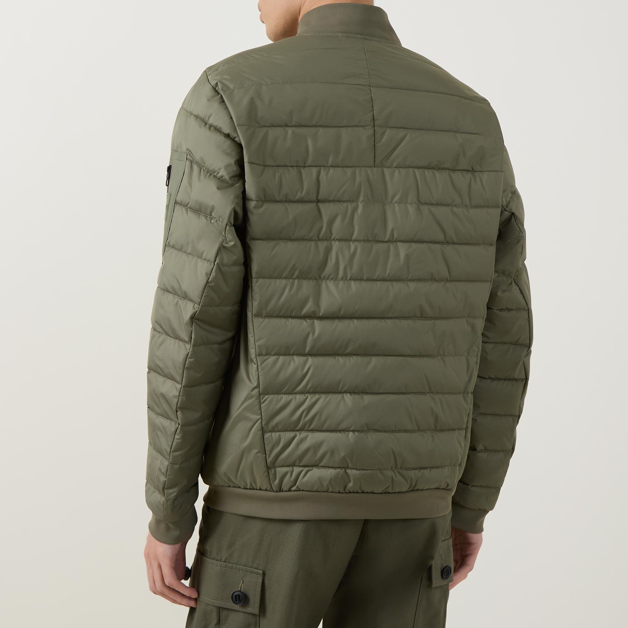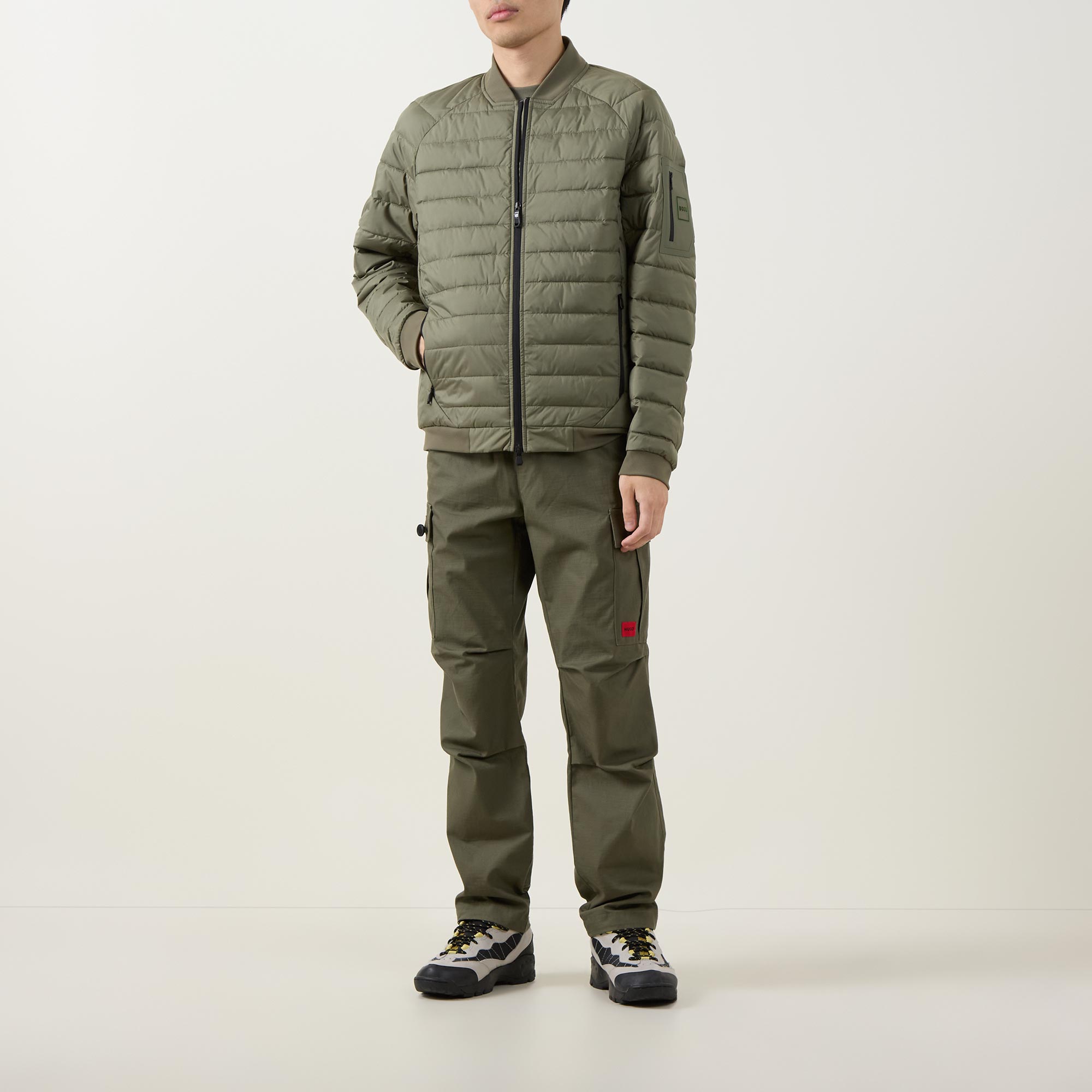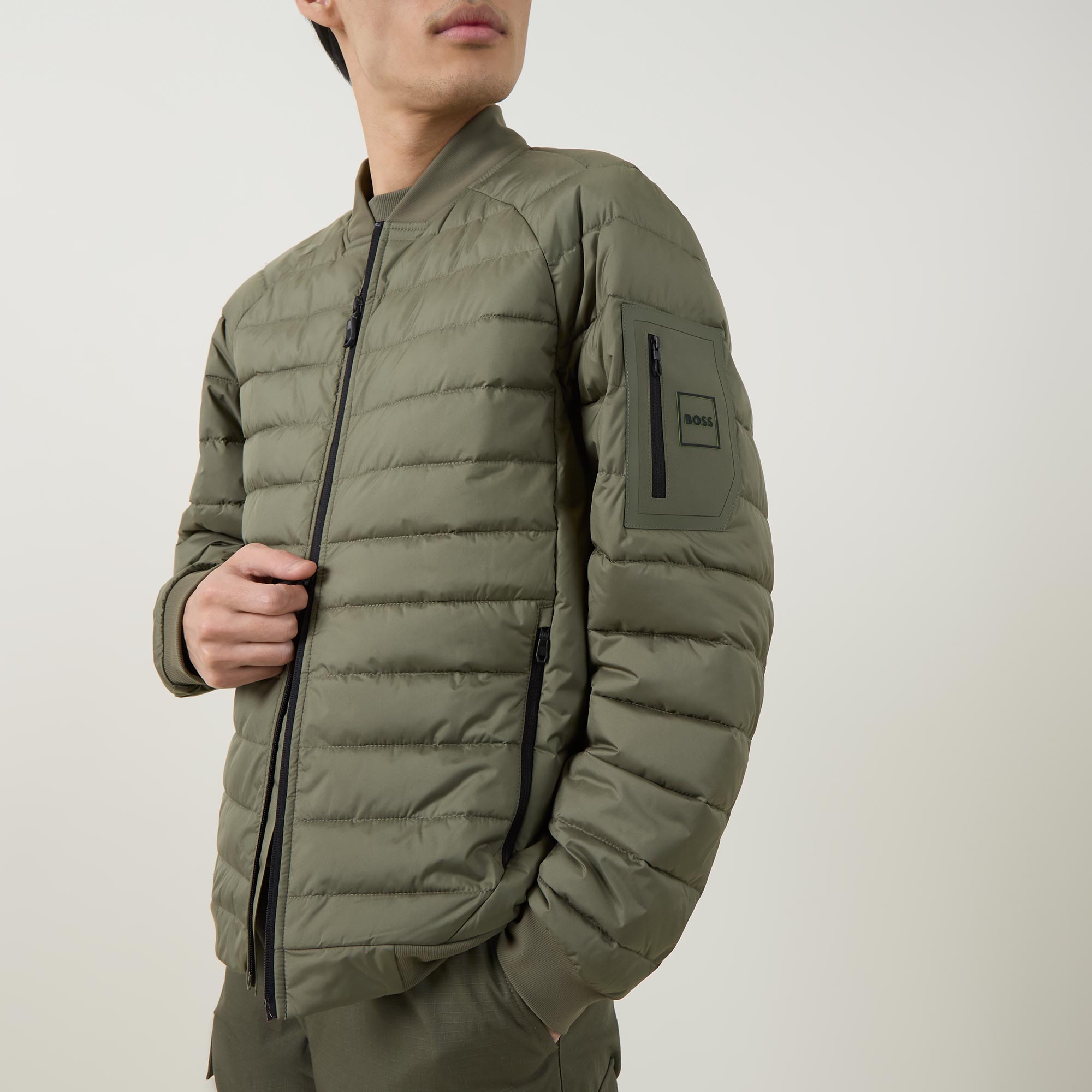 - Bomber collar, long sleeves, one sleeve pocket with zip fastening, two-way front zip fastening, two vertical pockets with zip fastenings, straight hem, ribbed trims, logo badge, quilted design, padded