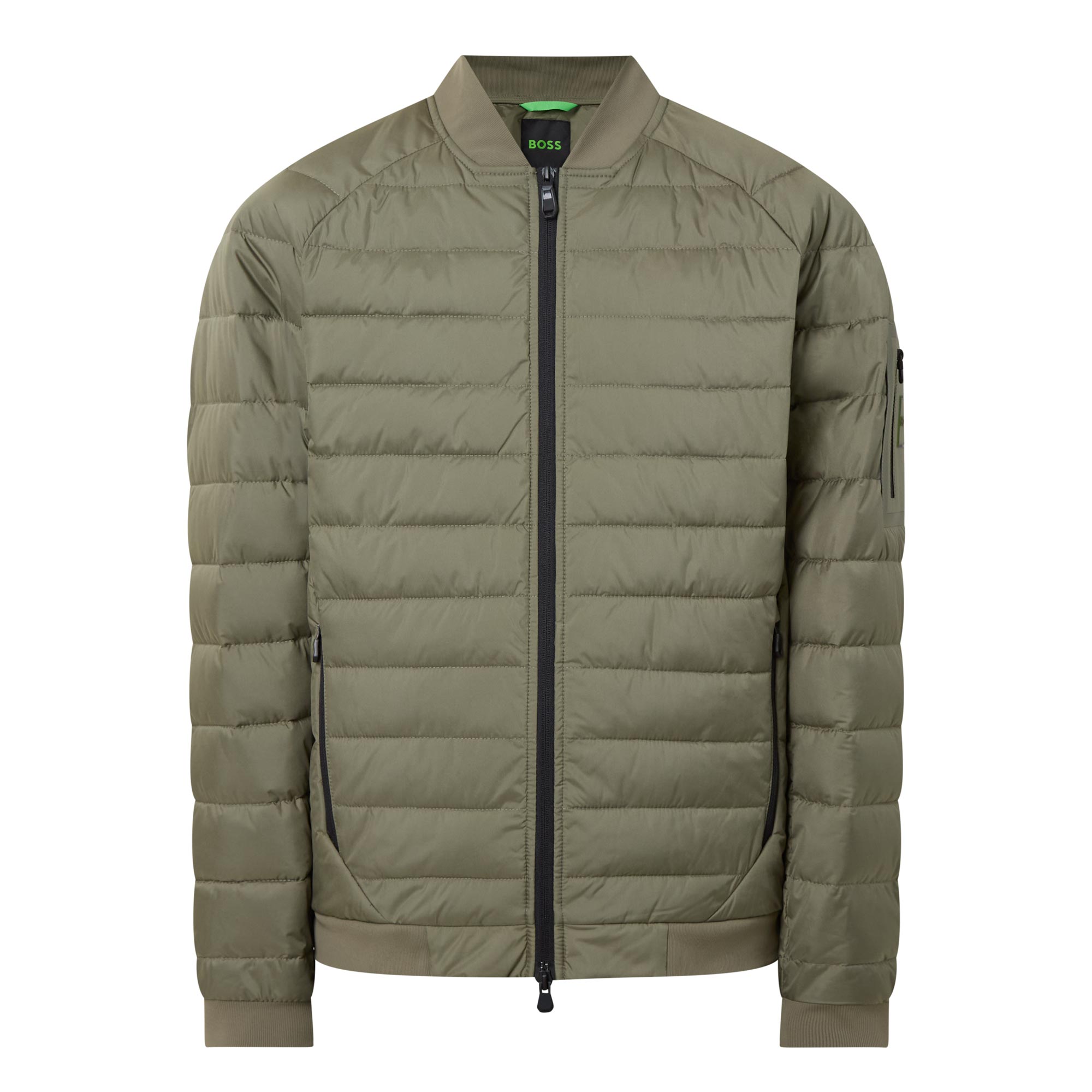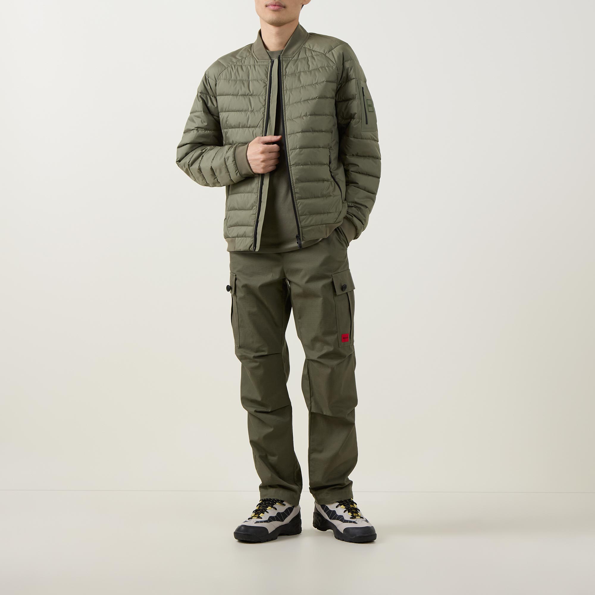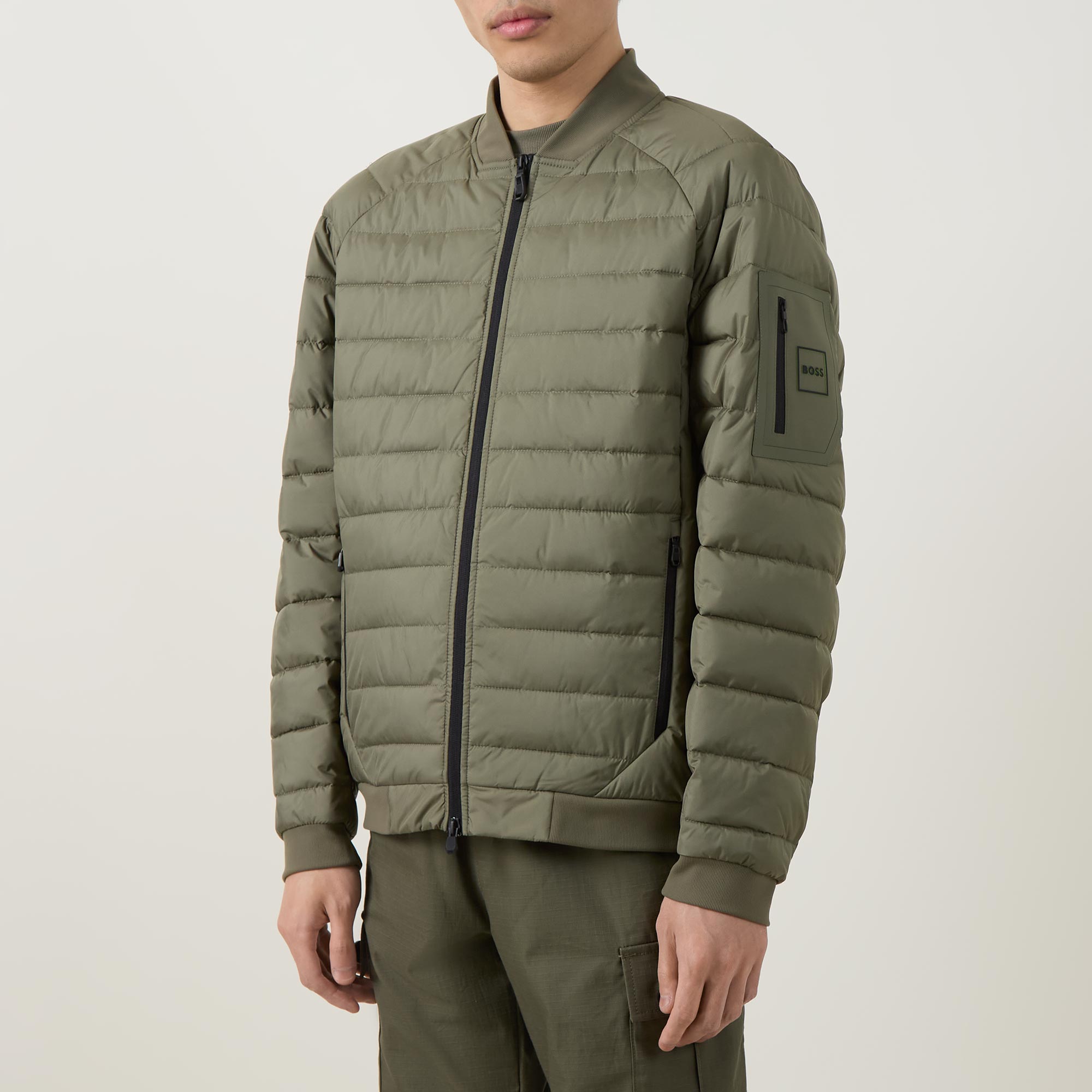 - Bomber collar, long sleeves, one sleeve pocket with zip fastening, two-way front zip fastening, two vertical pockets with zip fastenings, straight hem, ribbed trims, logo badge, quilted design, padded