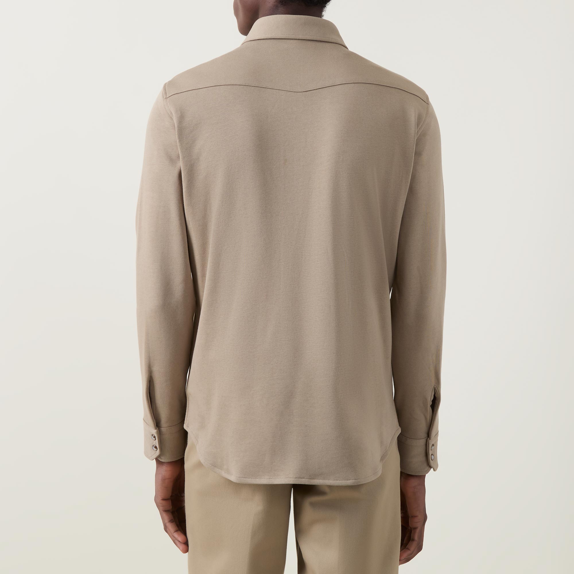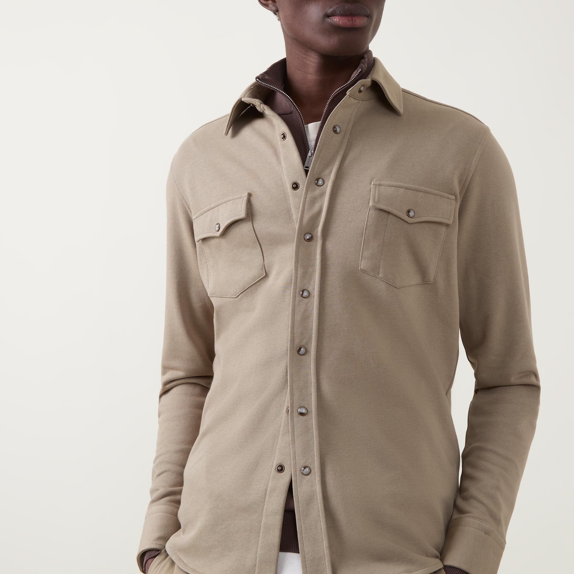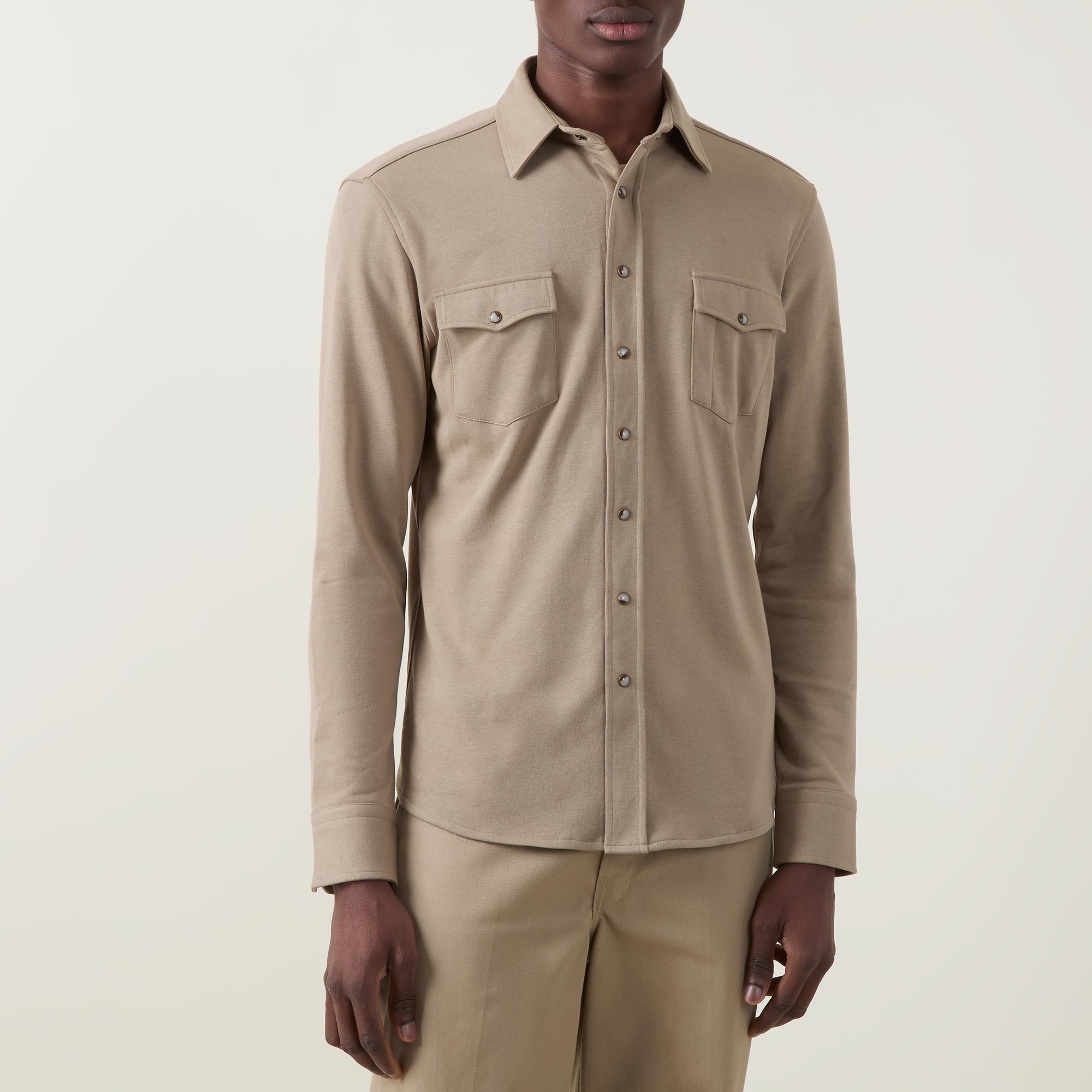 • Pointed collar, long sleeves, chest pockets, curved hemline, snap buttons