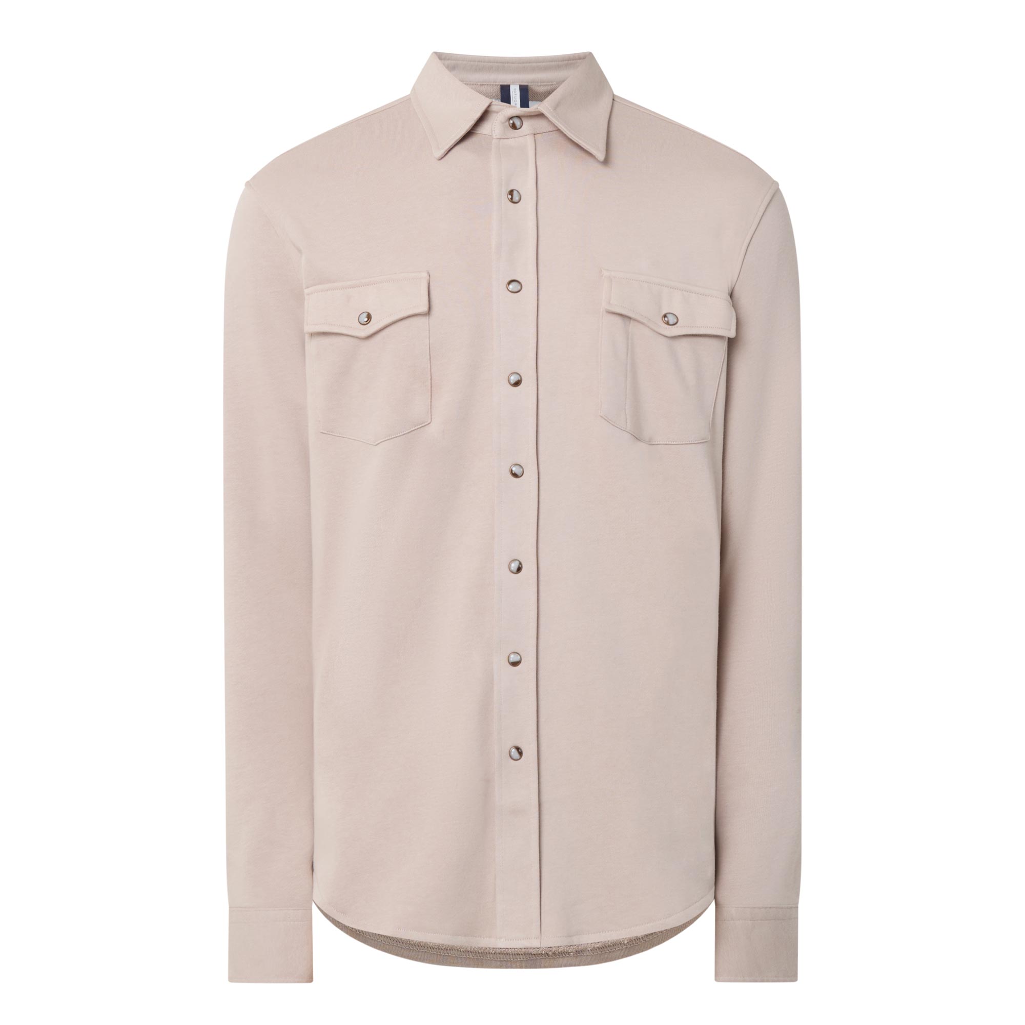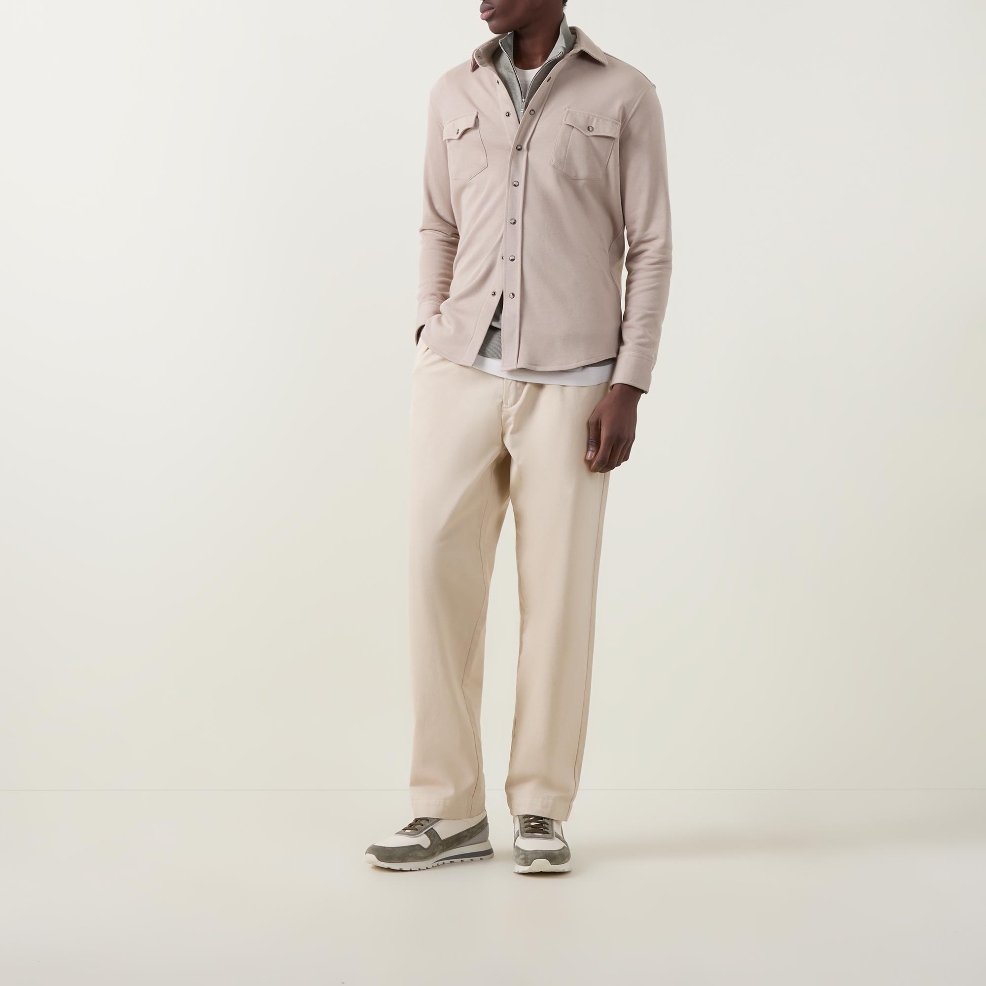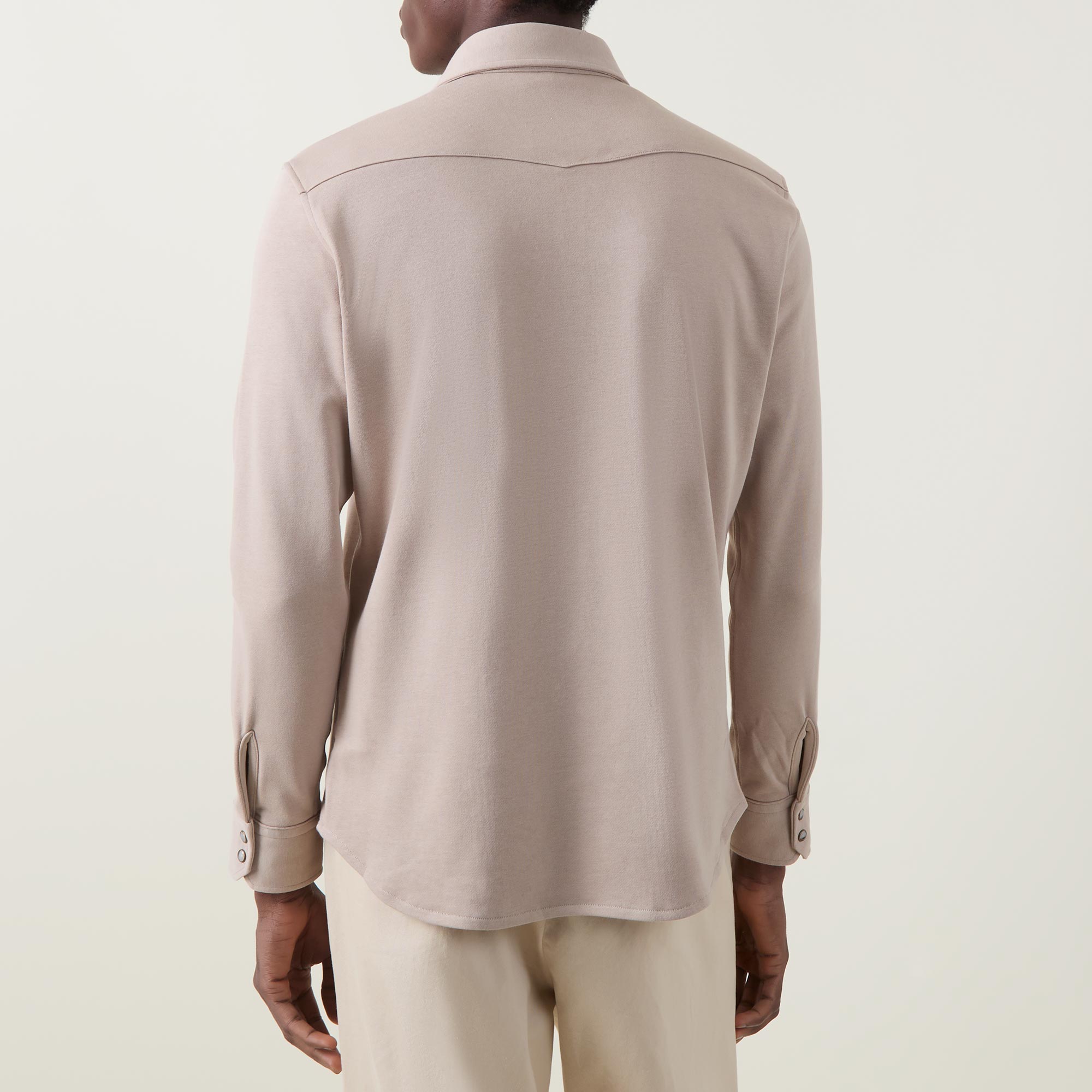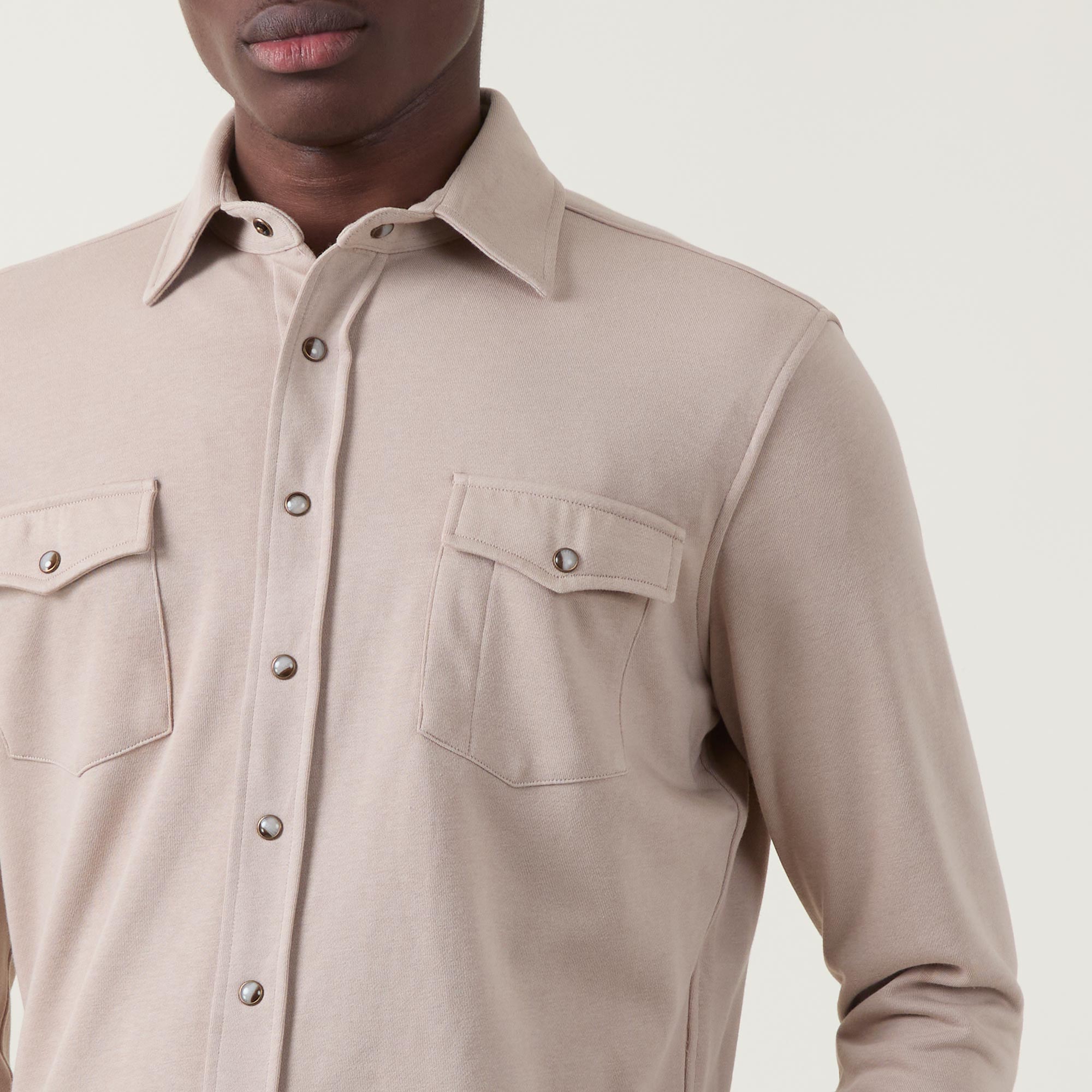 • Pointed collar, long sleeves, chest pockets, curved hemline, snap buttons