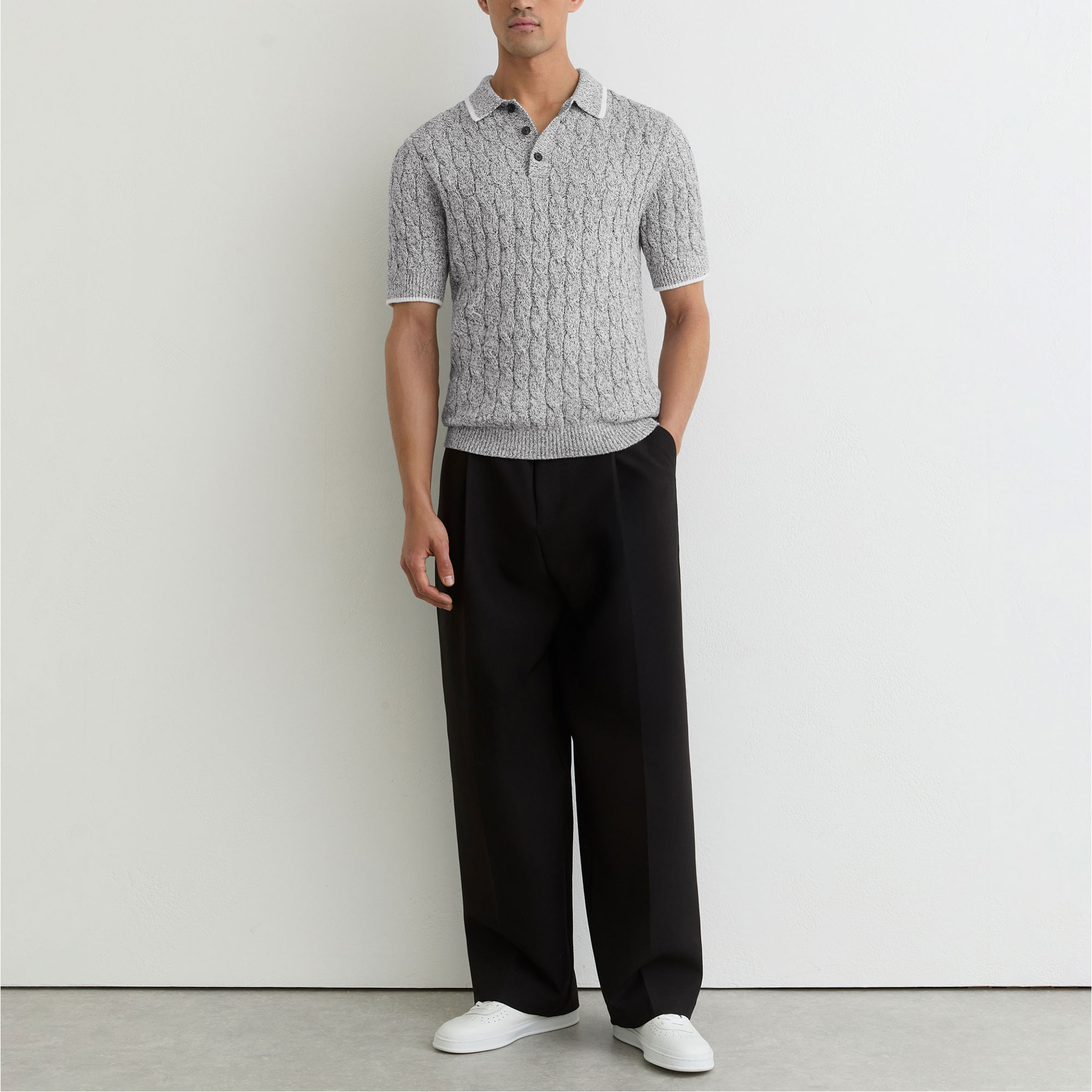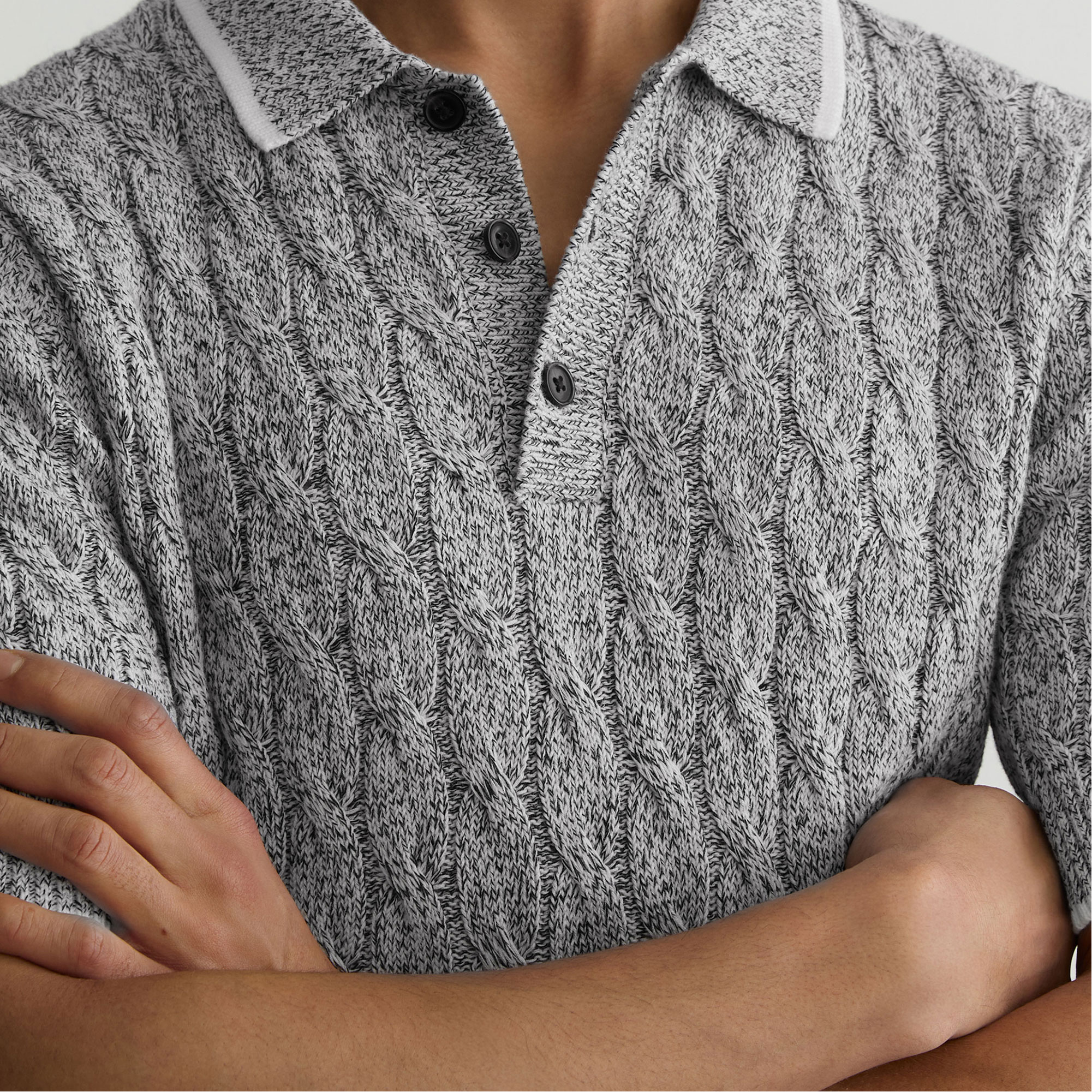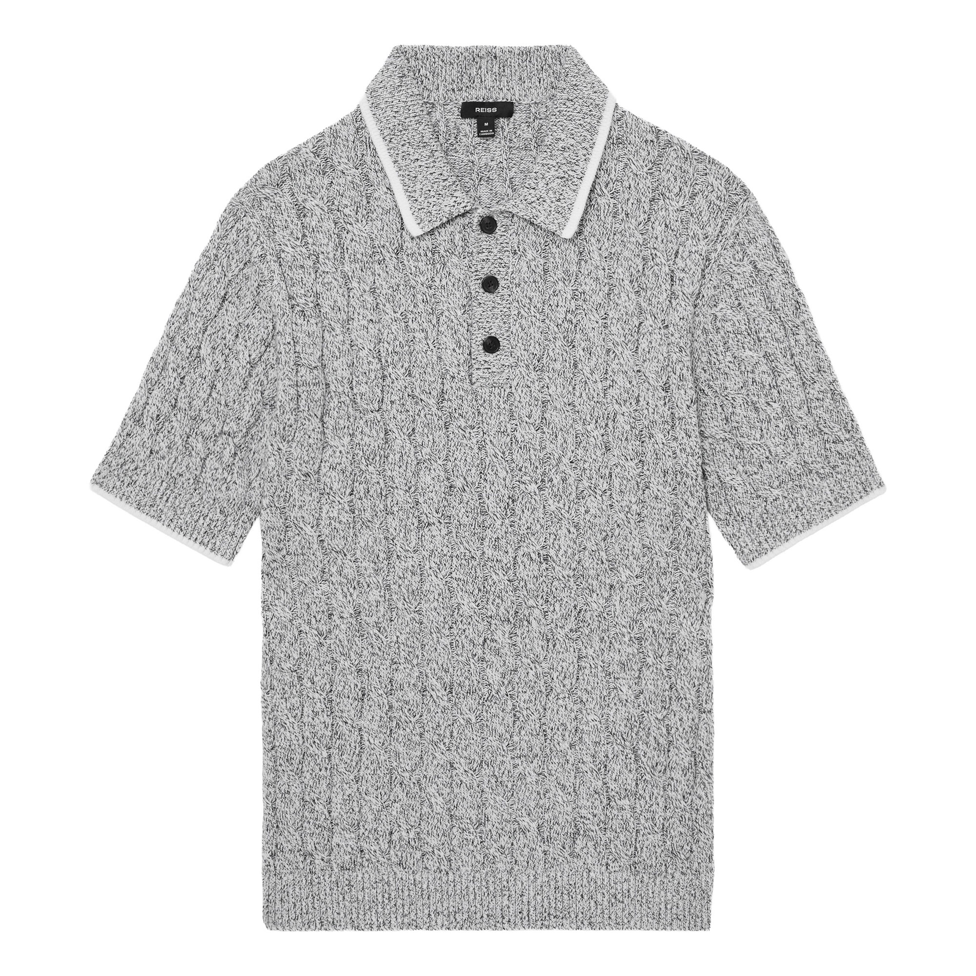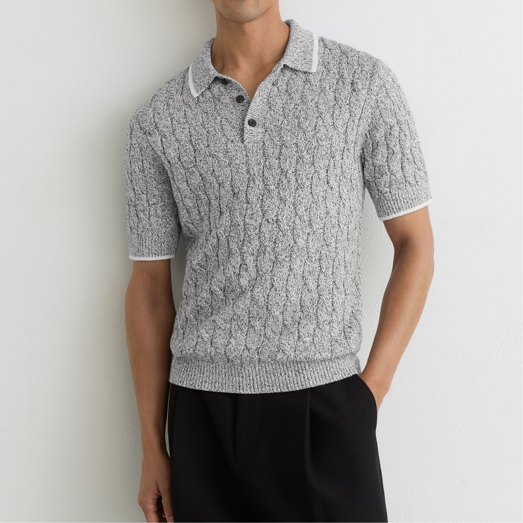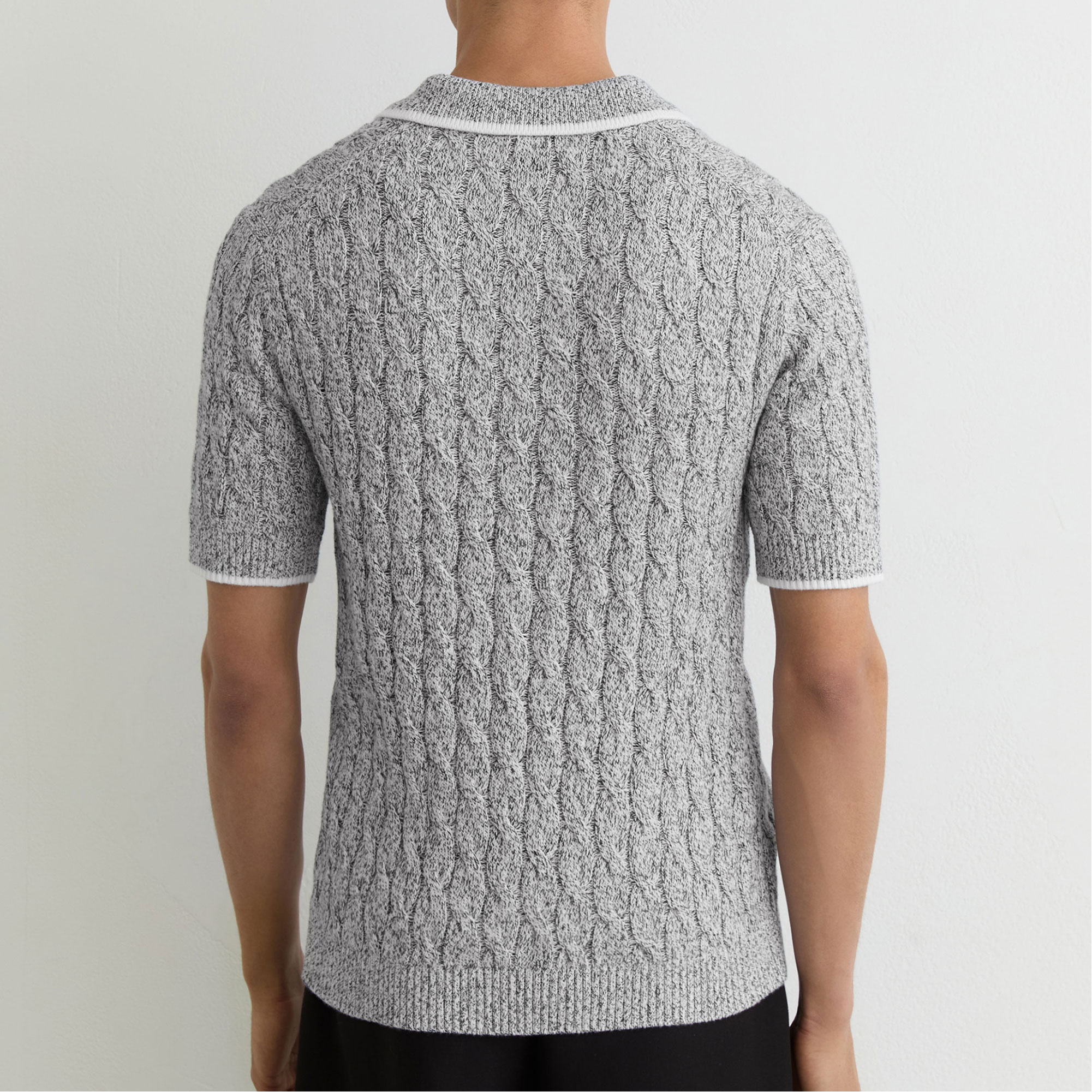 - Cable-knitted style, contrast tipping, half-button placket, horn-effect buttons, zip fastening, short sleeves, polo collar