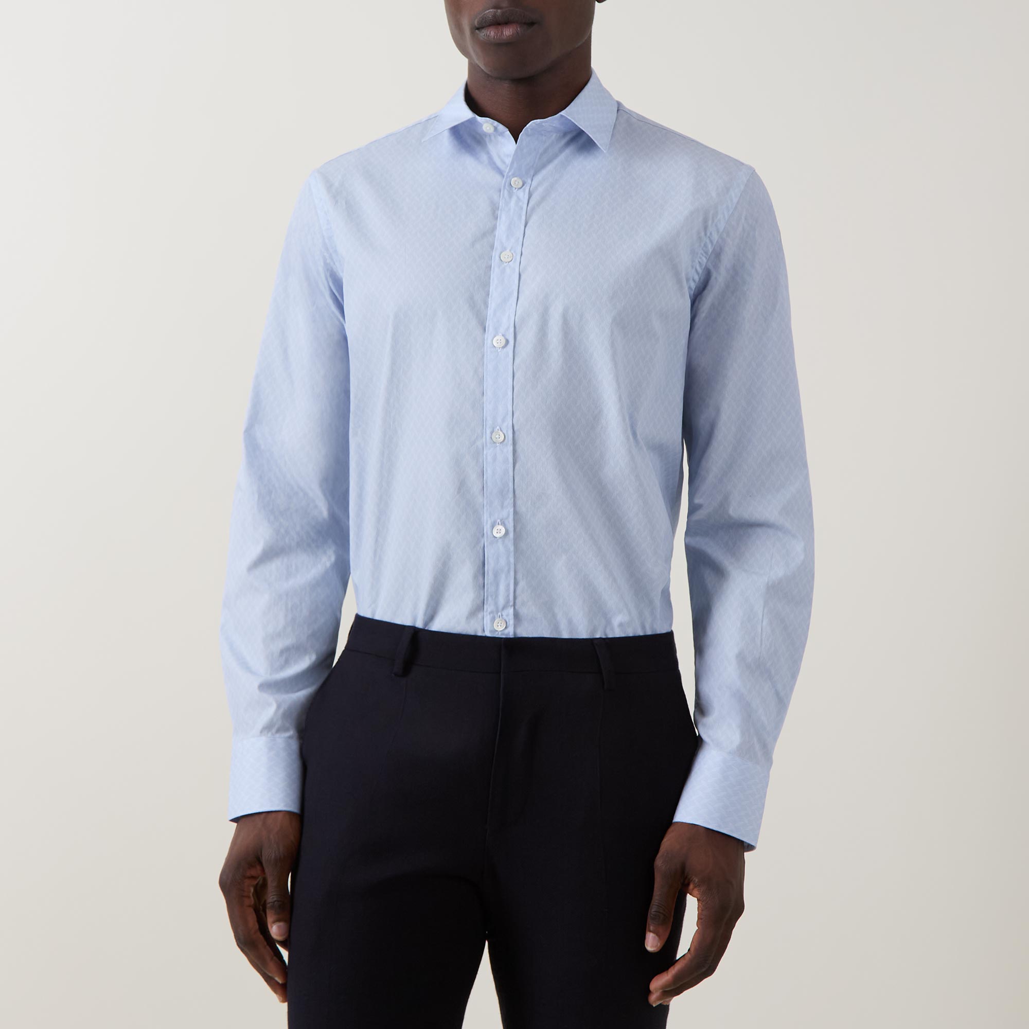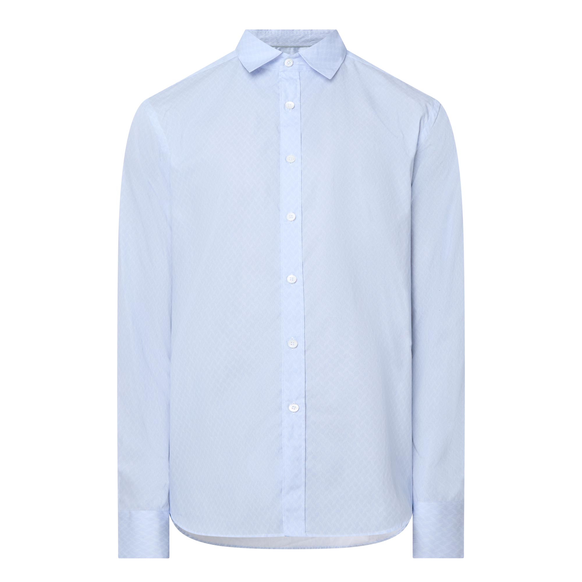 • Cut-away collar, long sleeves, single-cuff, curved hemline, tonal geometric print, button fastening