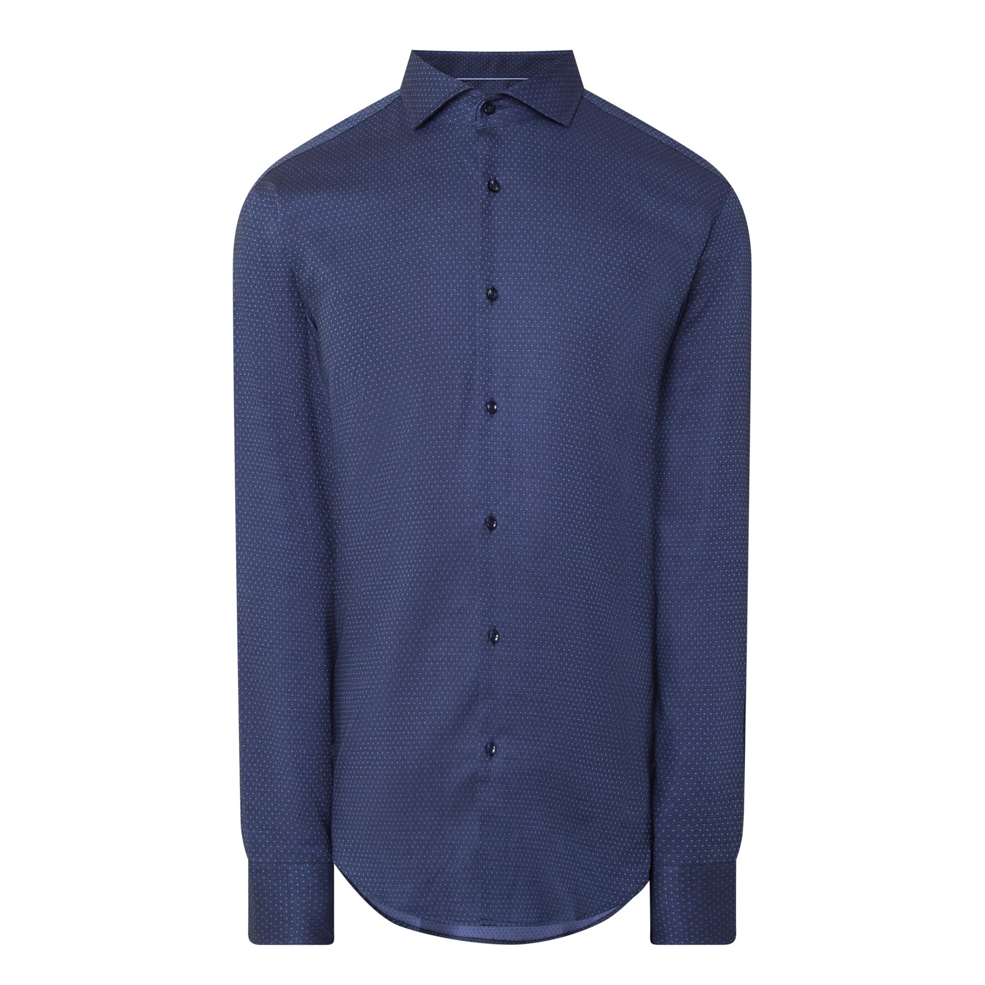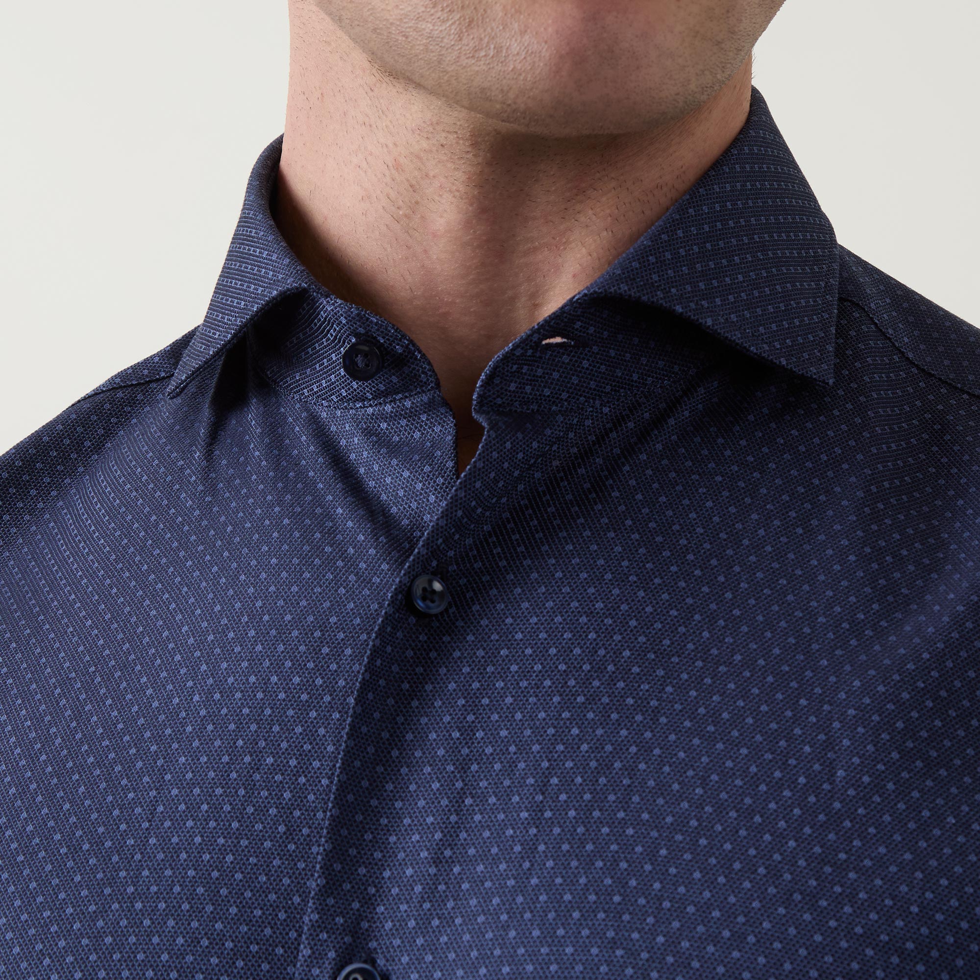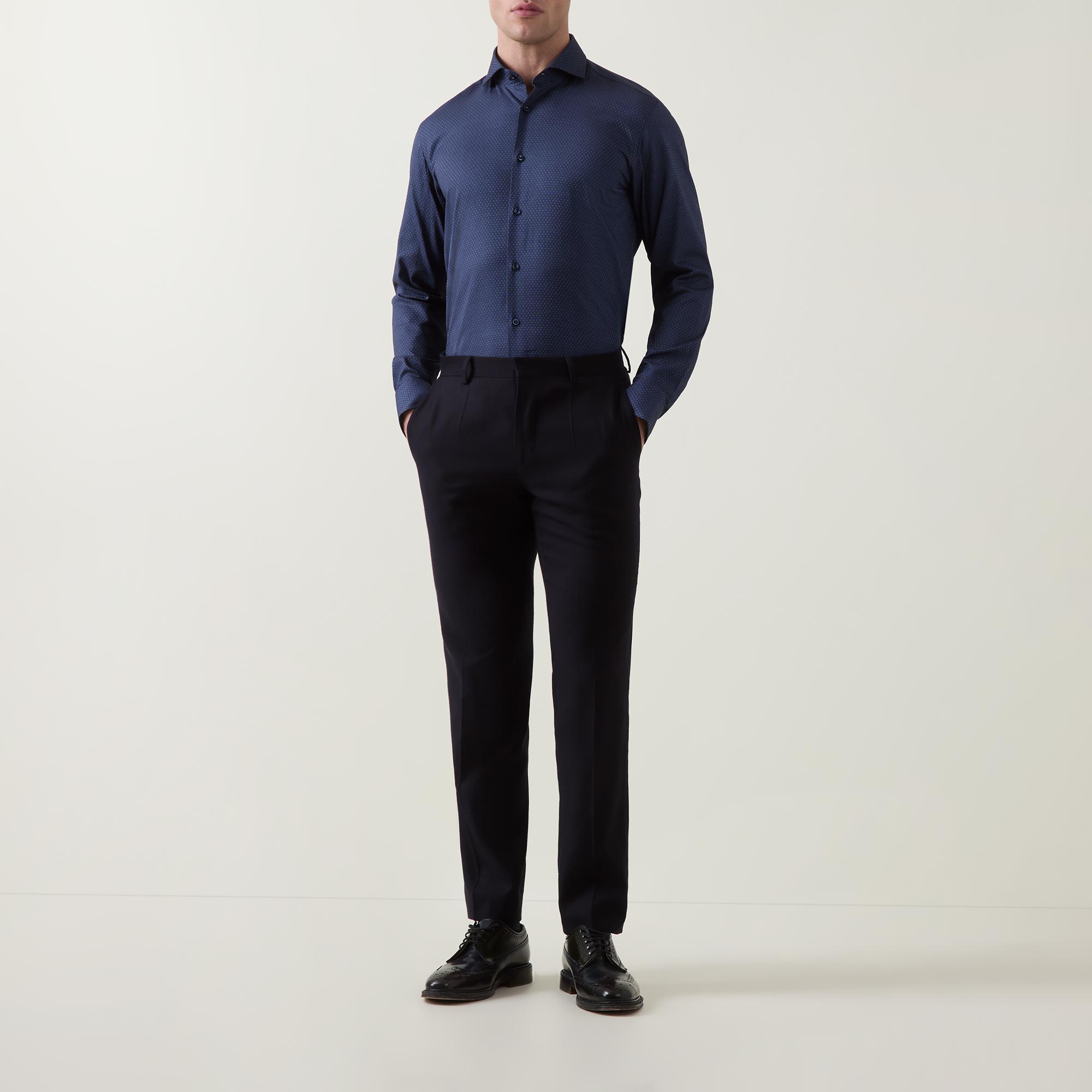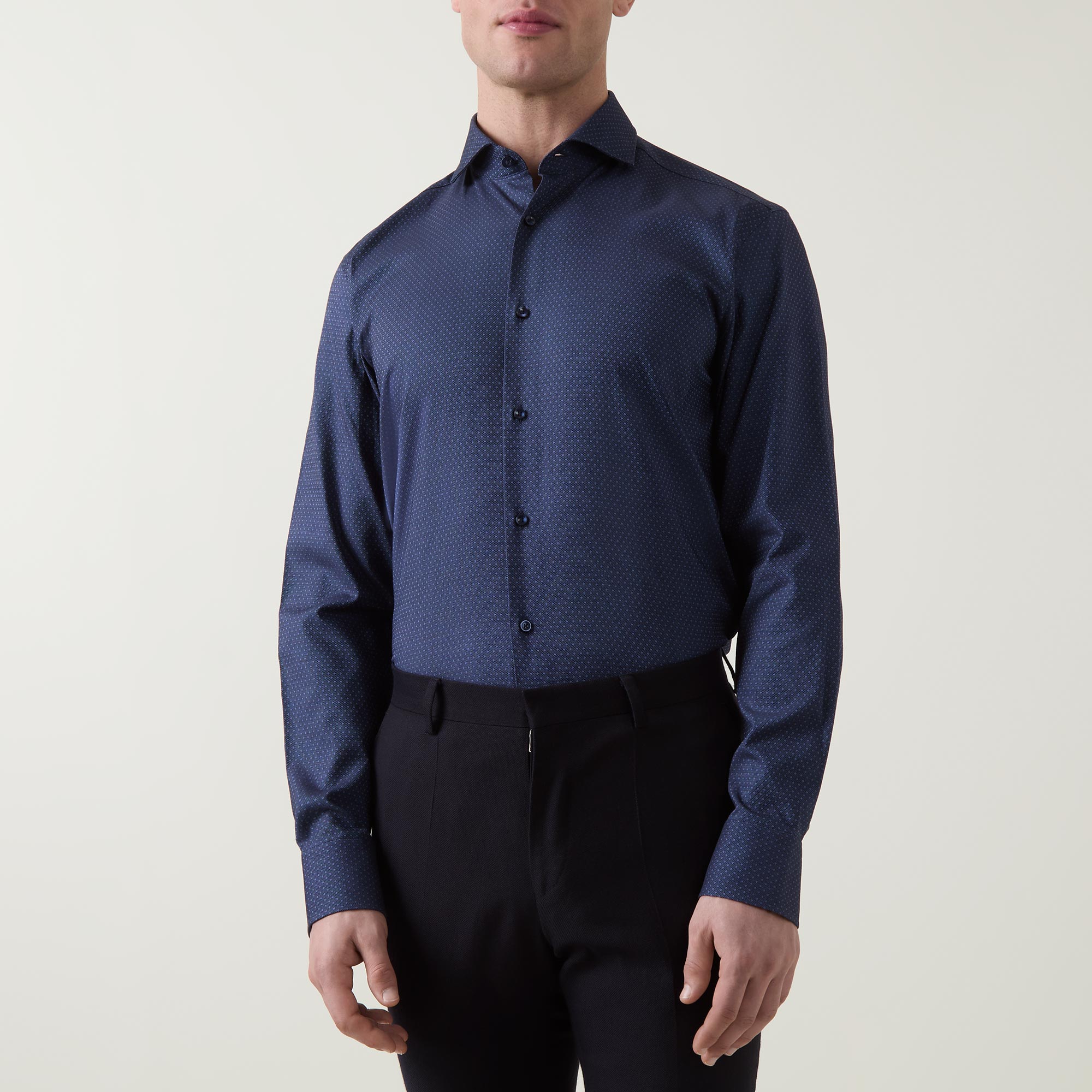 - Spread collar, long sleeves, buttoned cuffs, front button fastening, curved hem, tonal stitching, geometric print pattern, subtle sheen finish