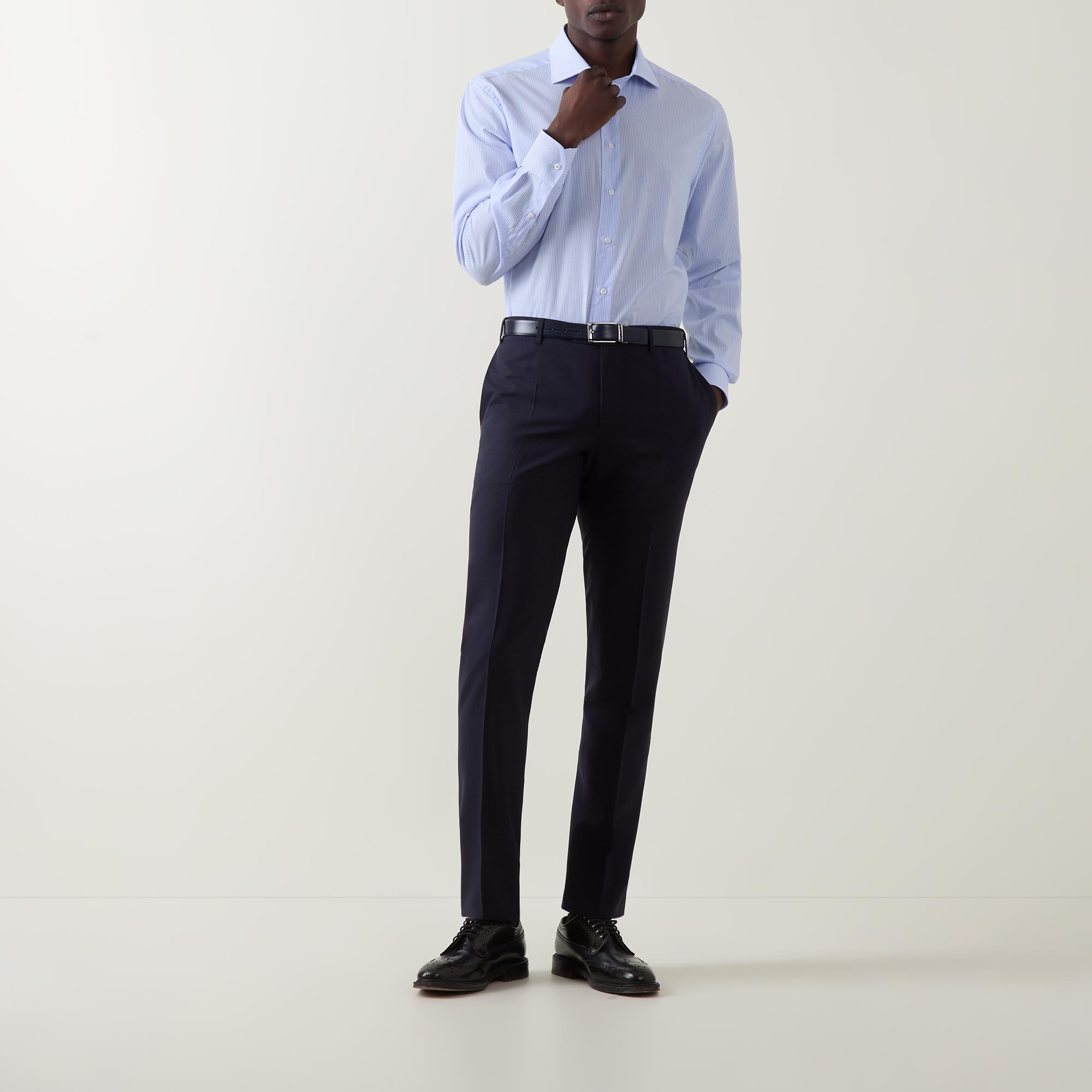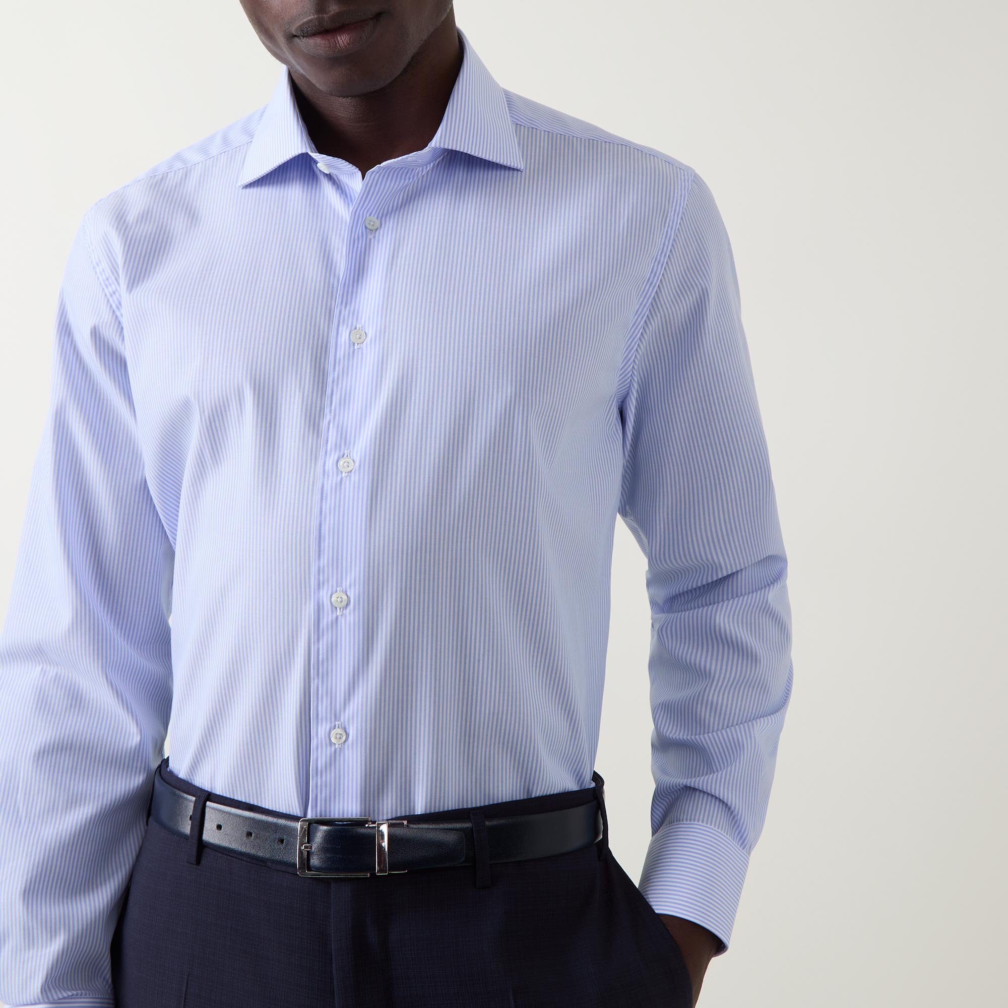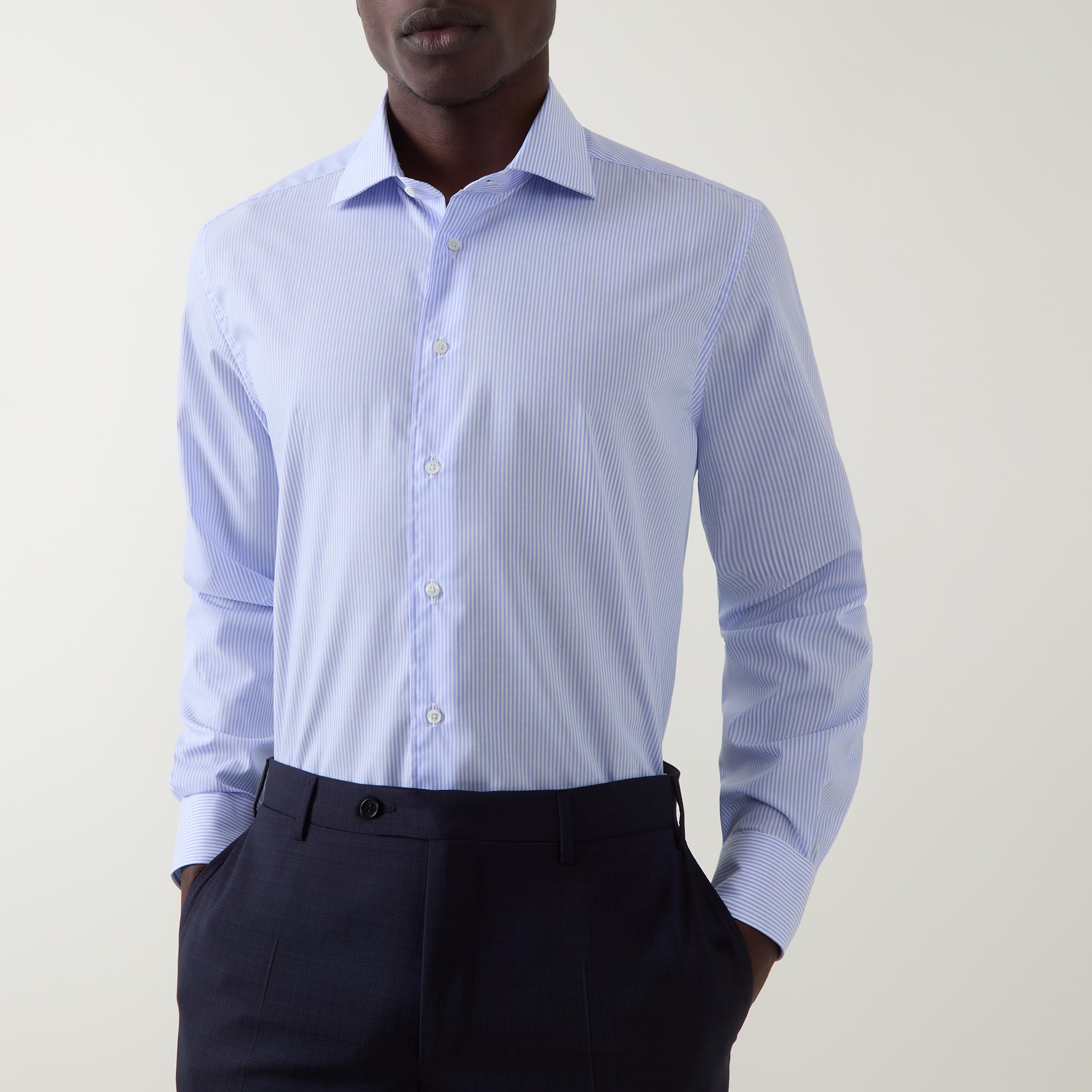 • Point collar, long sleeves, button fastening, single-button cuffs, pinstripe pattern, curved hemline, tonal stitching, smooth fabric