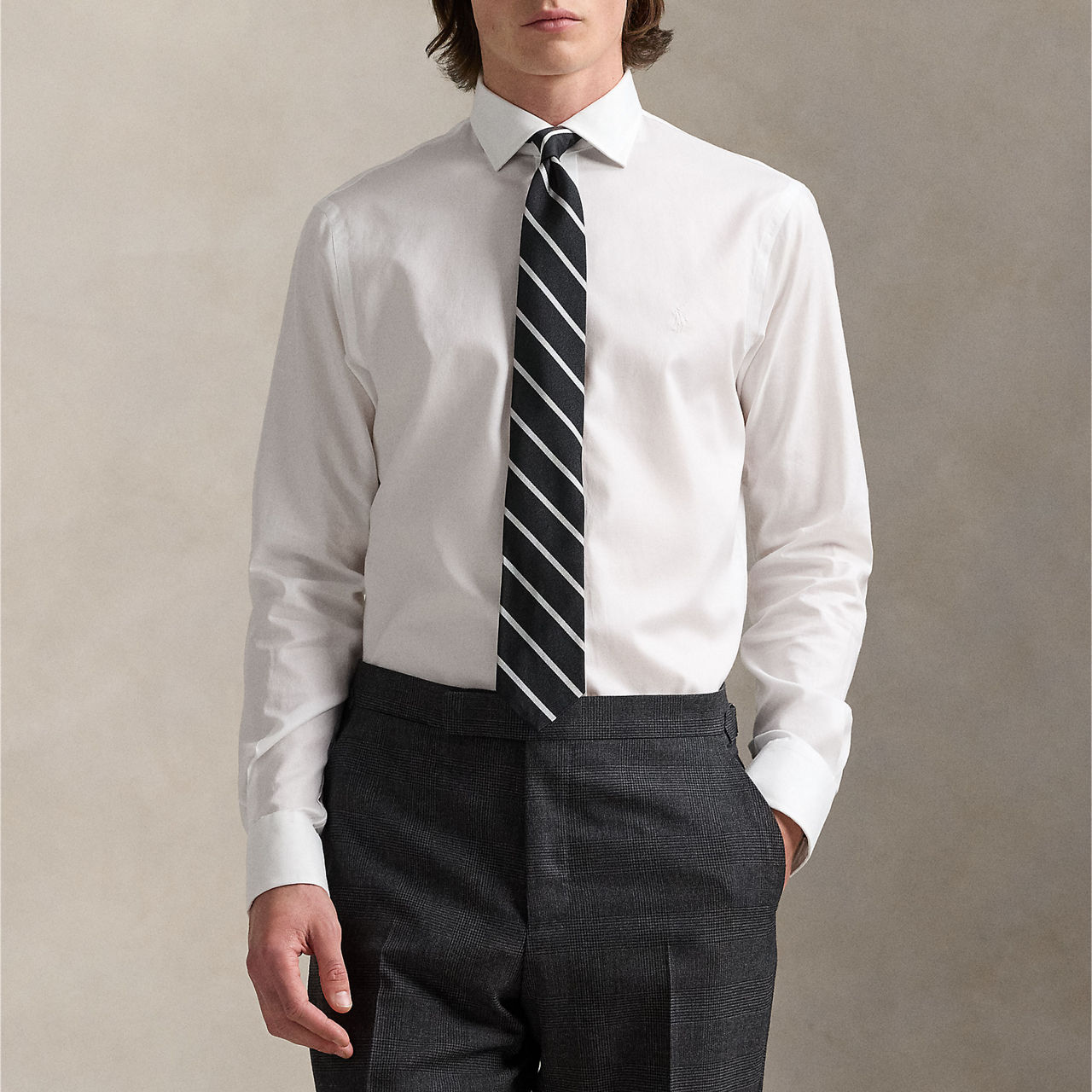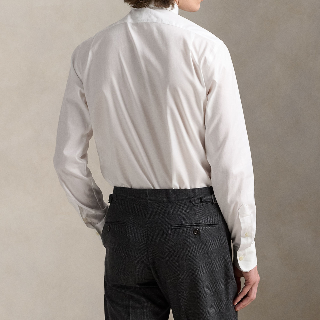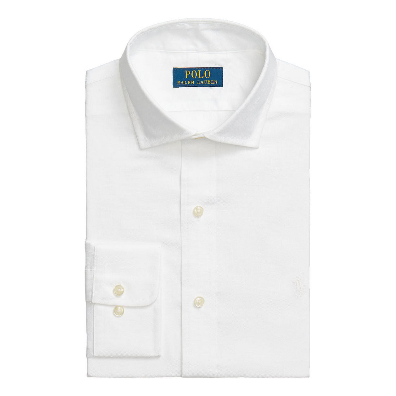 - Stretch-fused fabric, PUREPRESS™ technology, durable press finish with wrinkle resistance, tailored through the waist, medium-spread collar, buttoned placket, long sleeves, buttoned barrel cuffs, split pleated back yoke, signature embroidered Pony logo