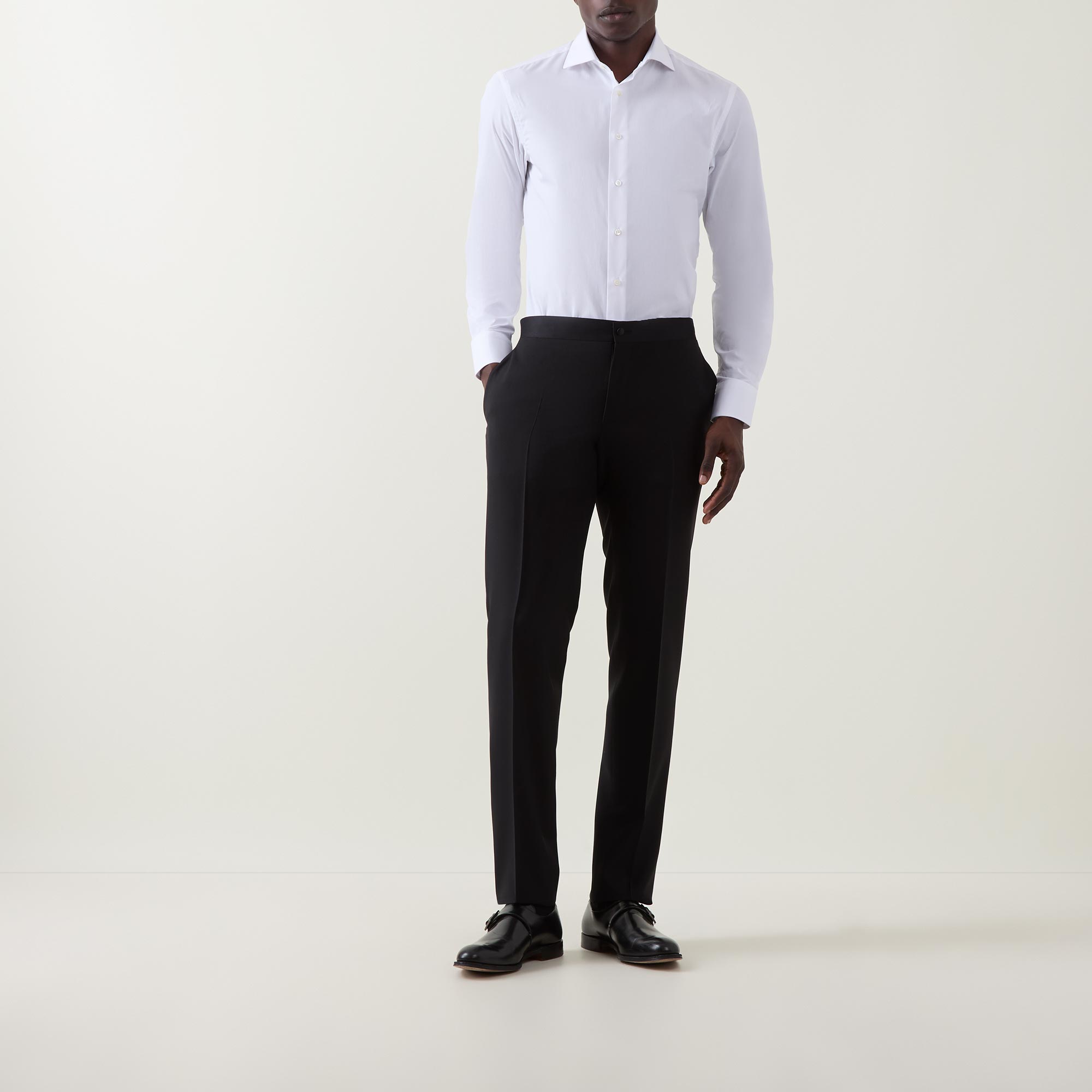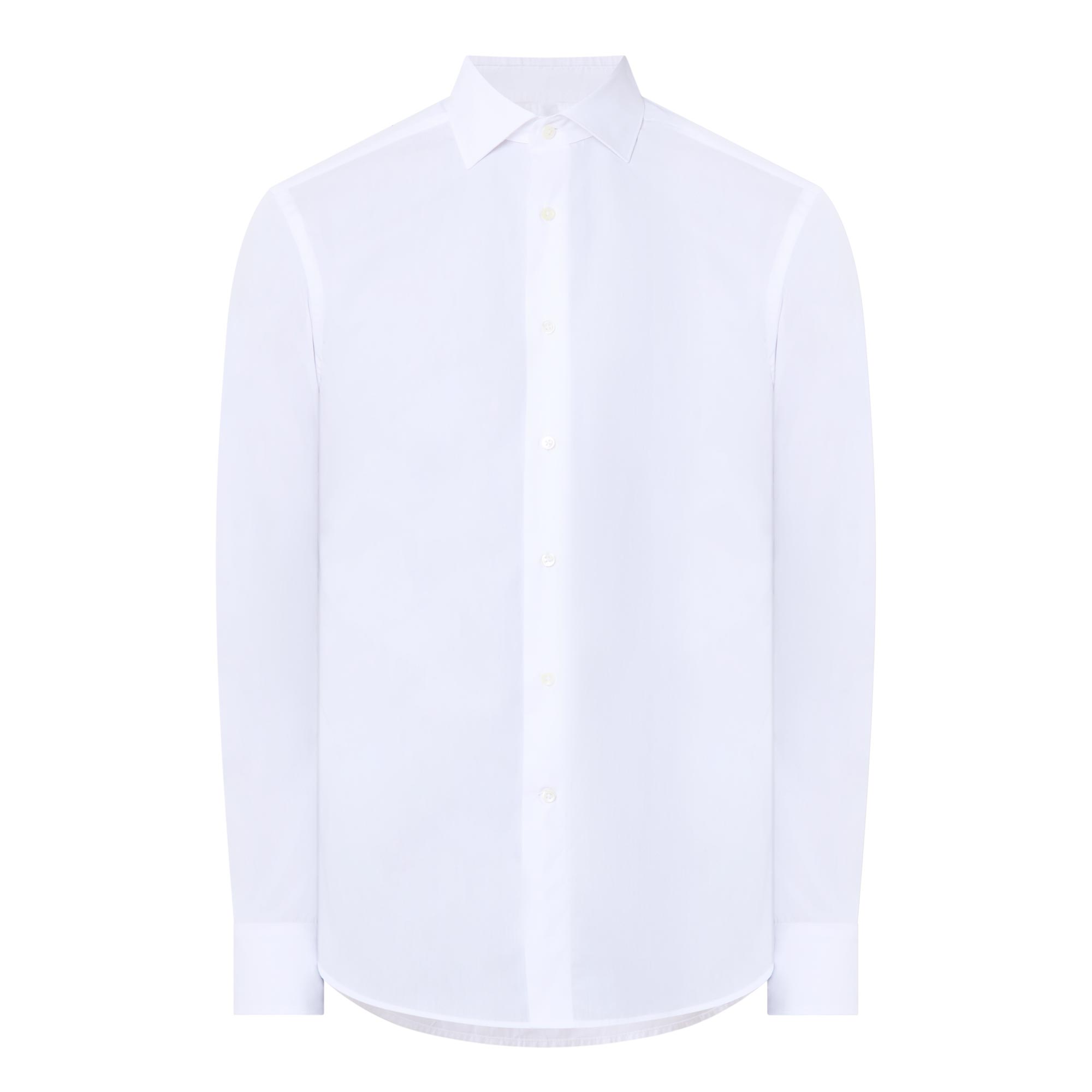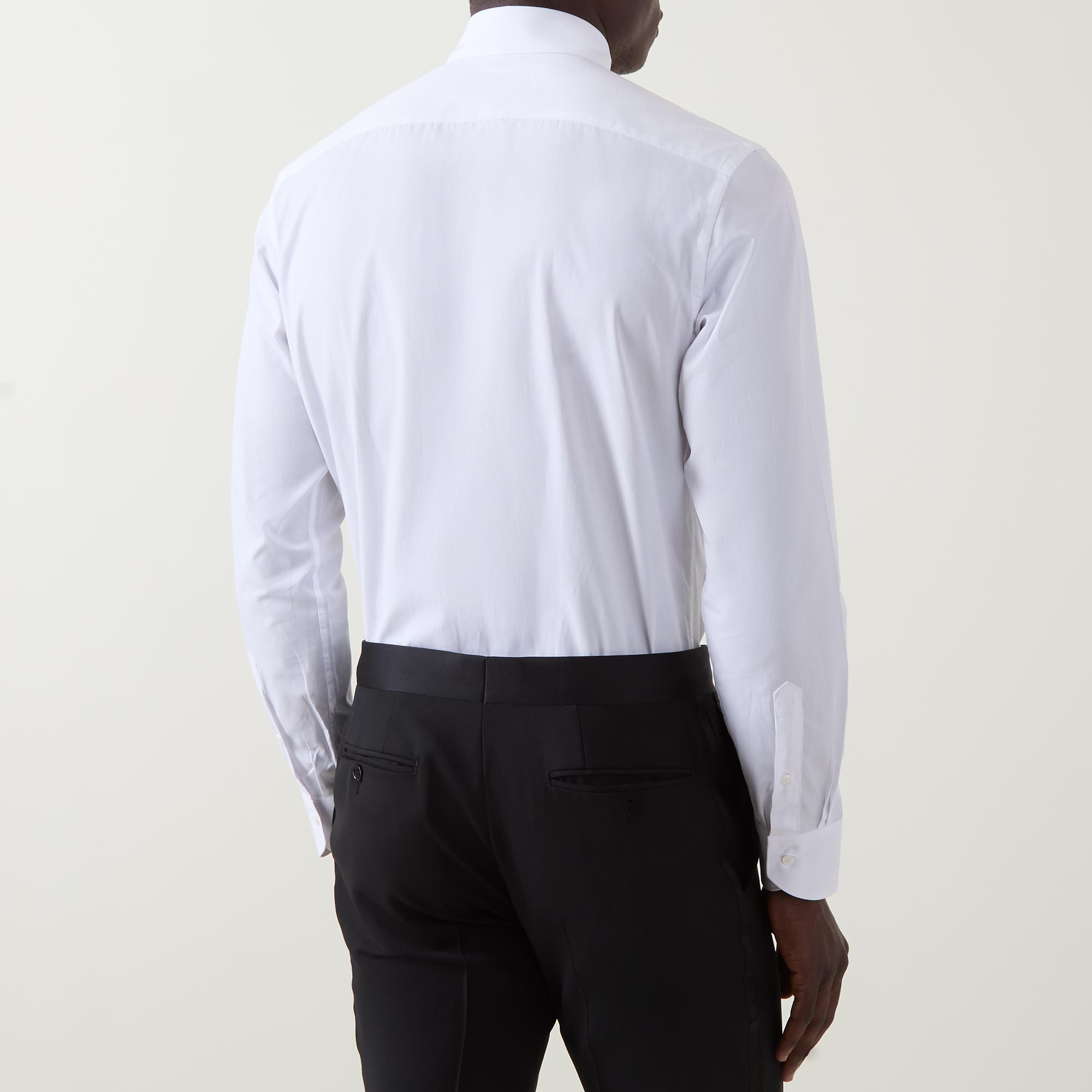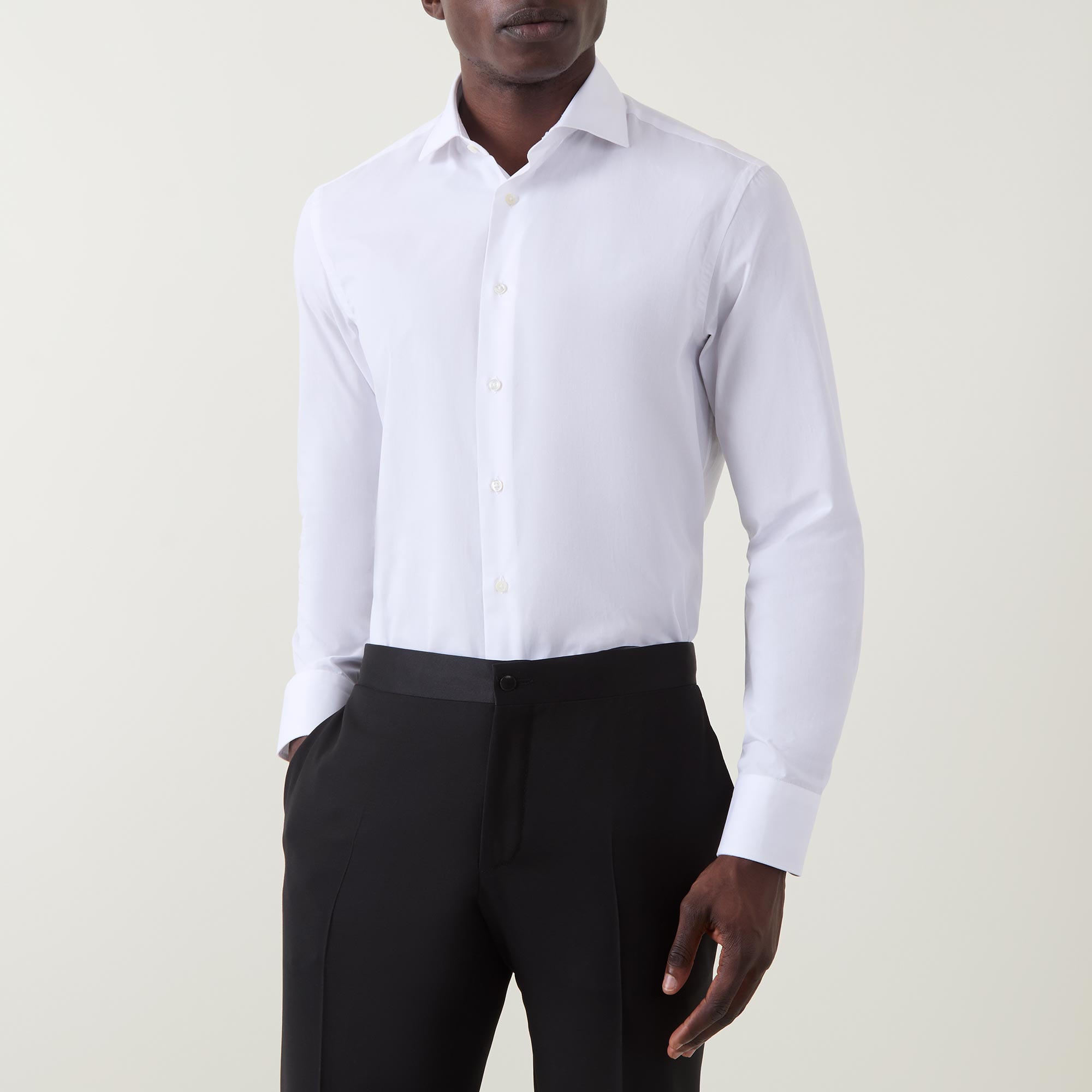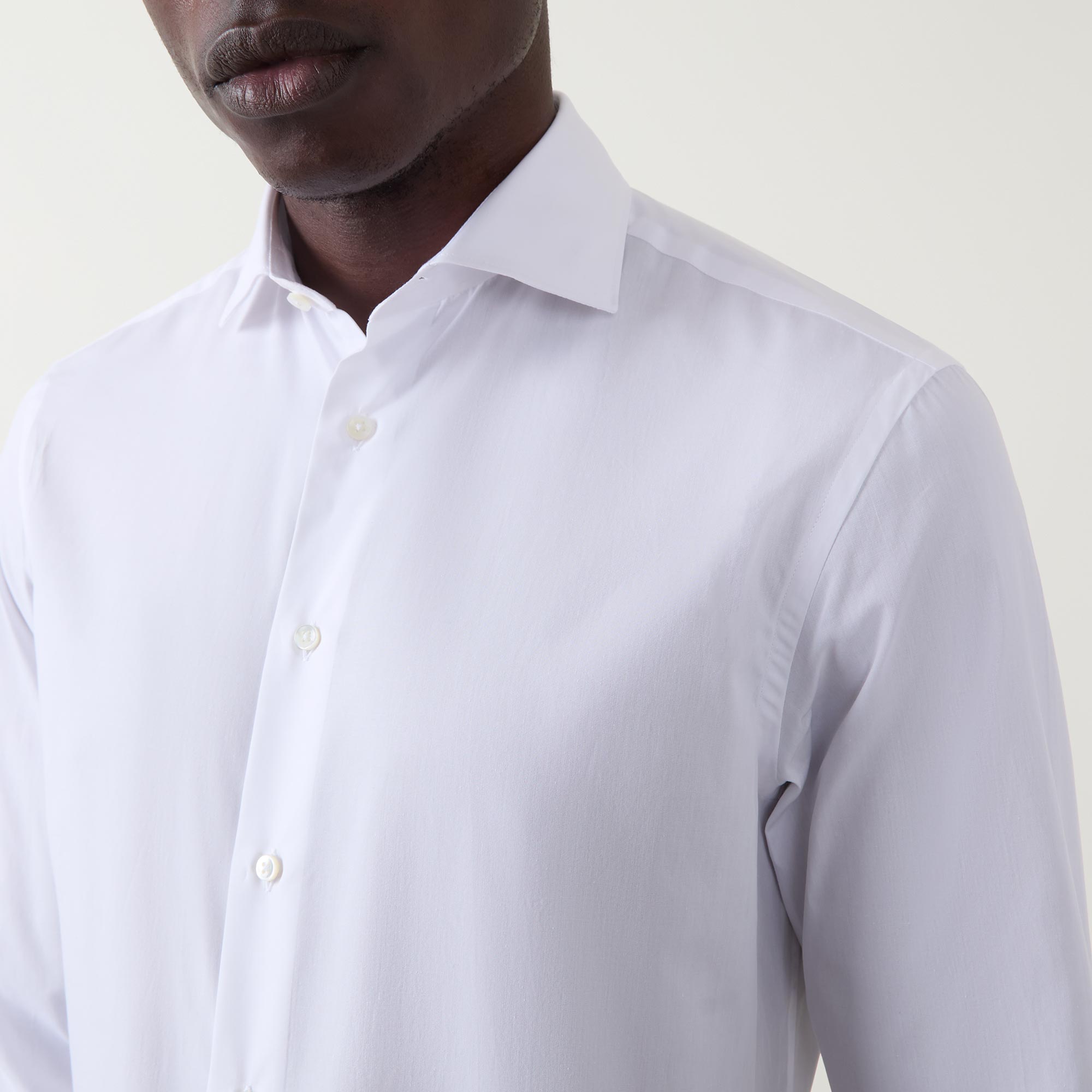 • Pointed collar, long sleeves, single cuffs, curved hemline, button fastenings