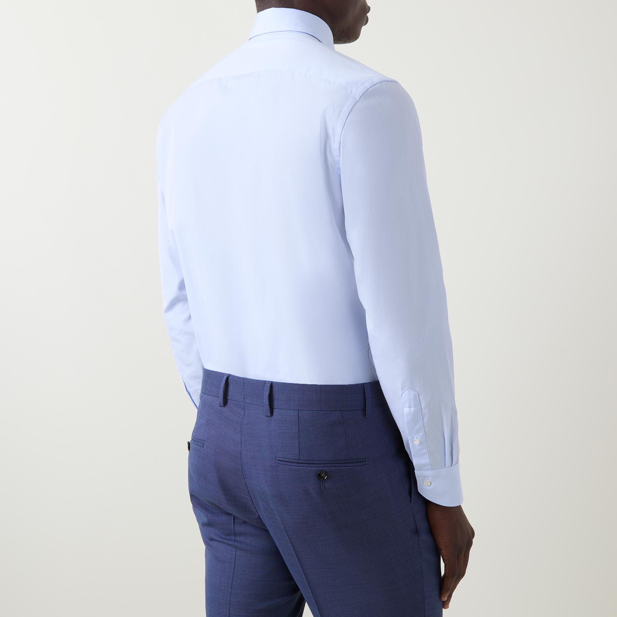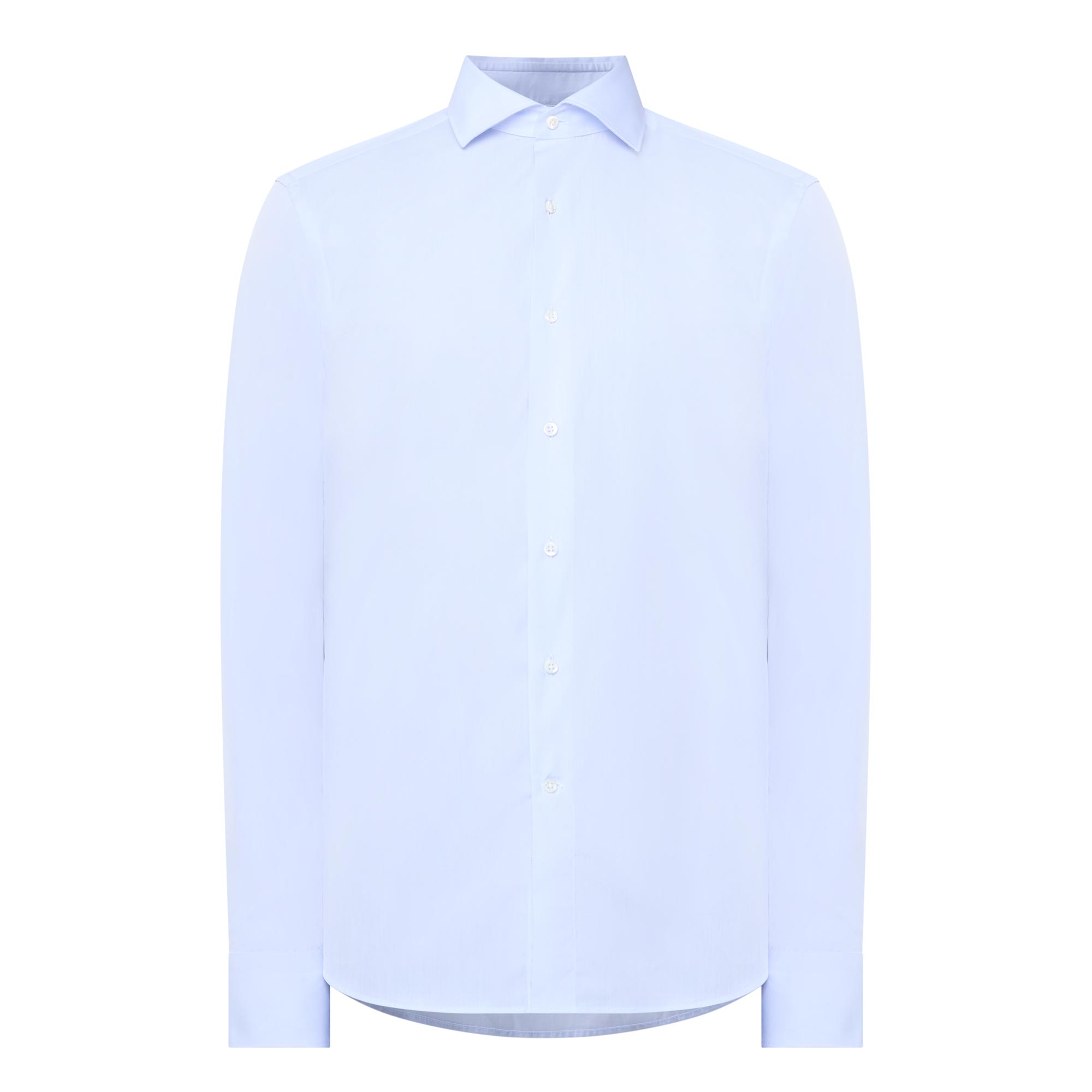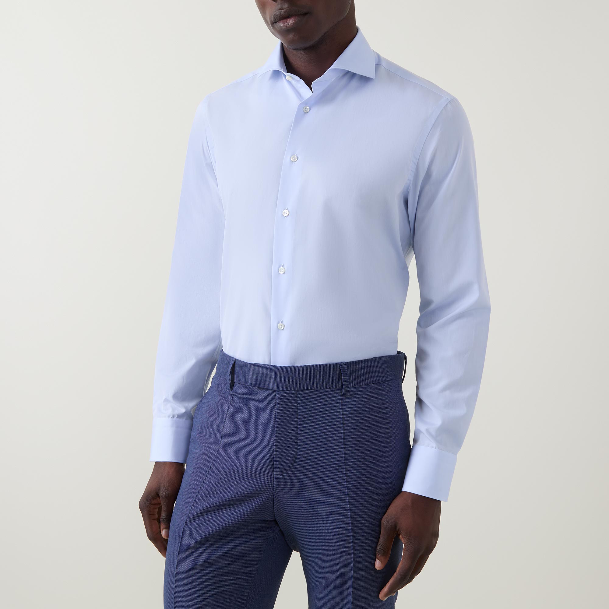 • Pointed collar, long sleeves, single cuffs, curved hemline, button fastenings