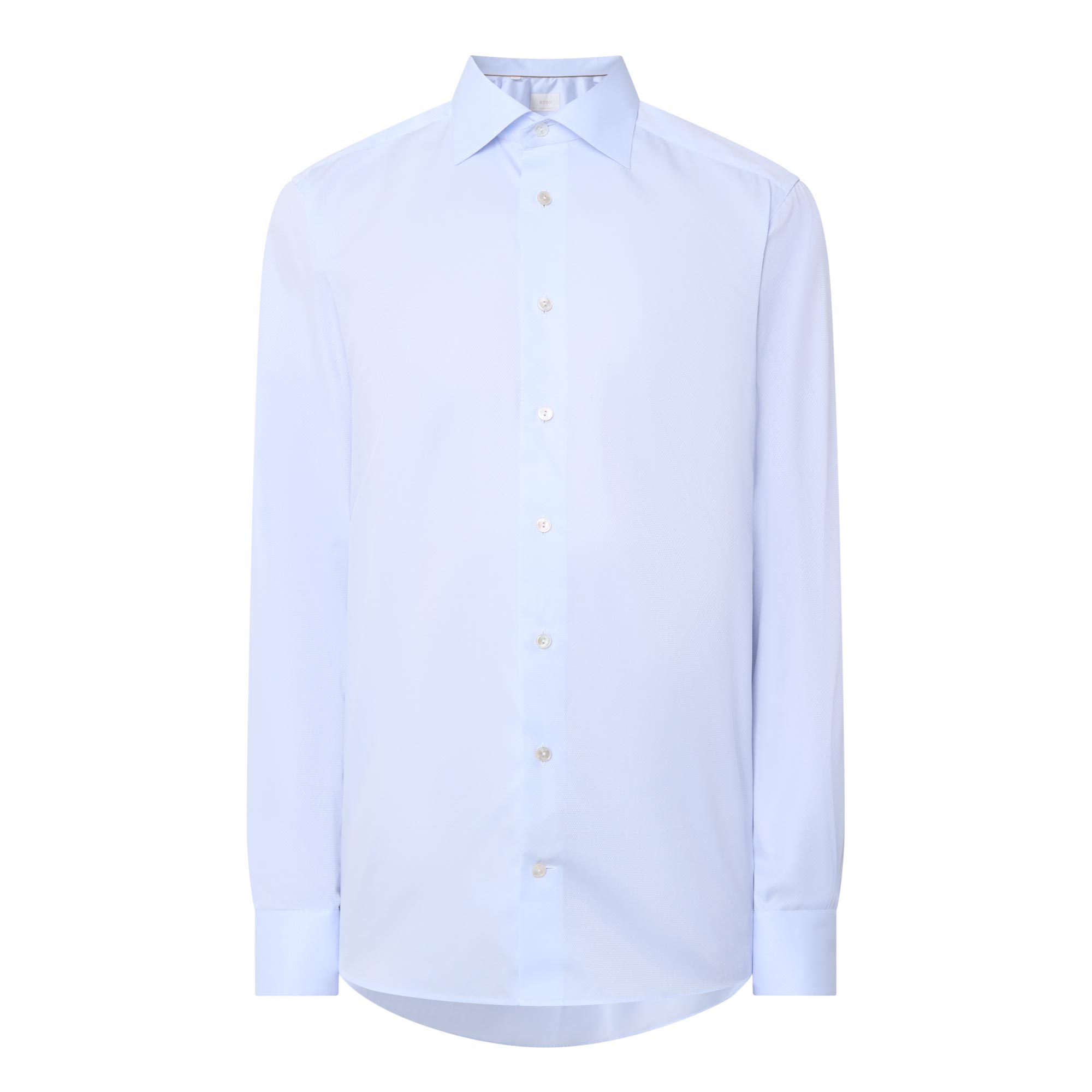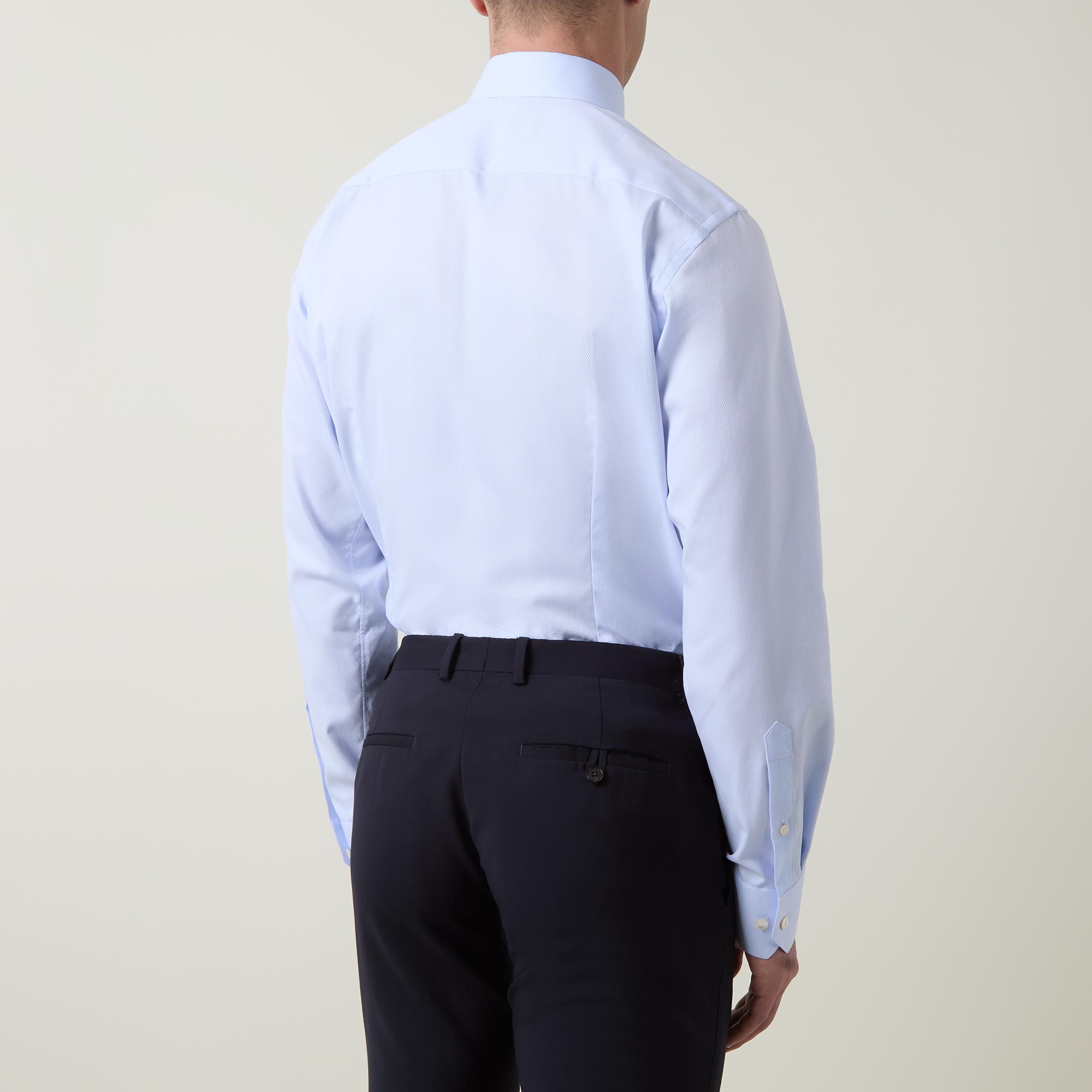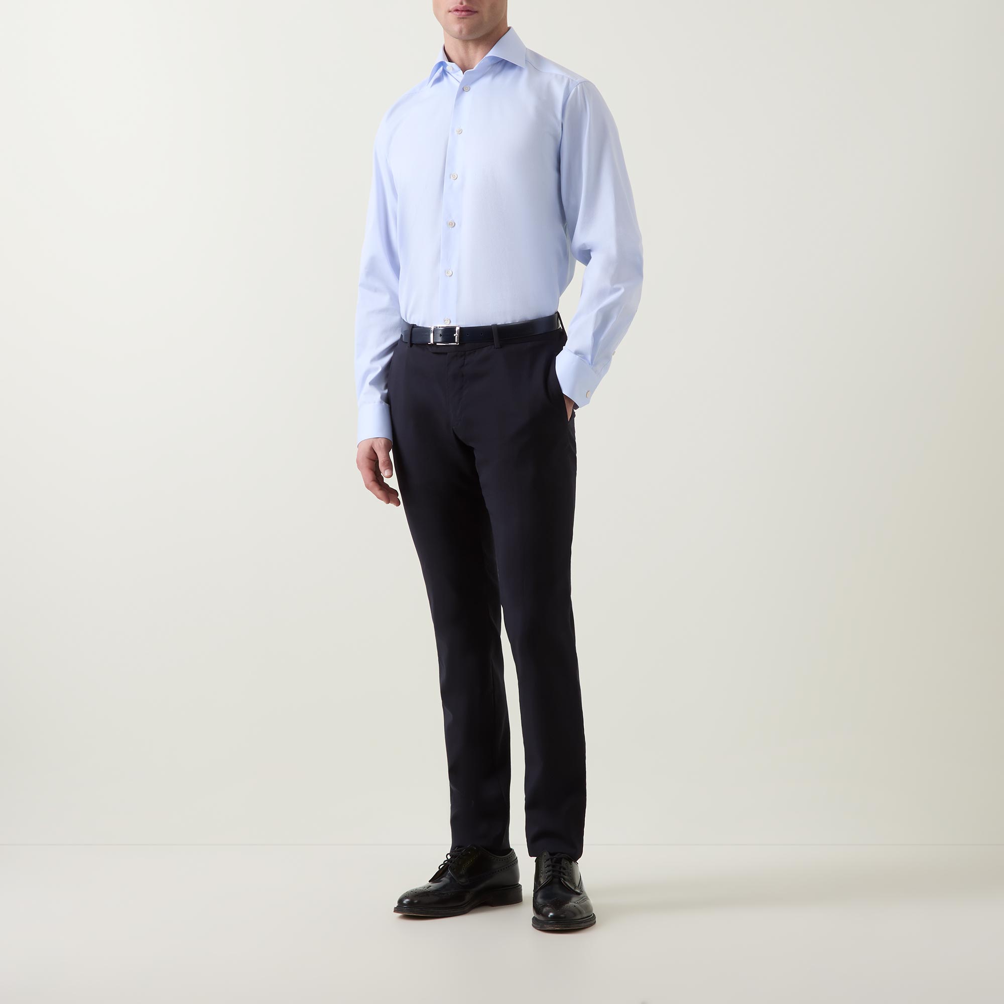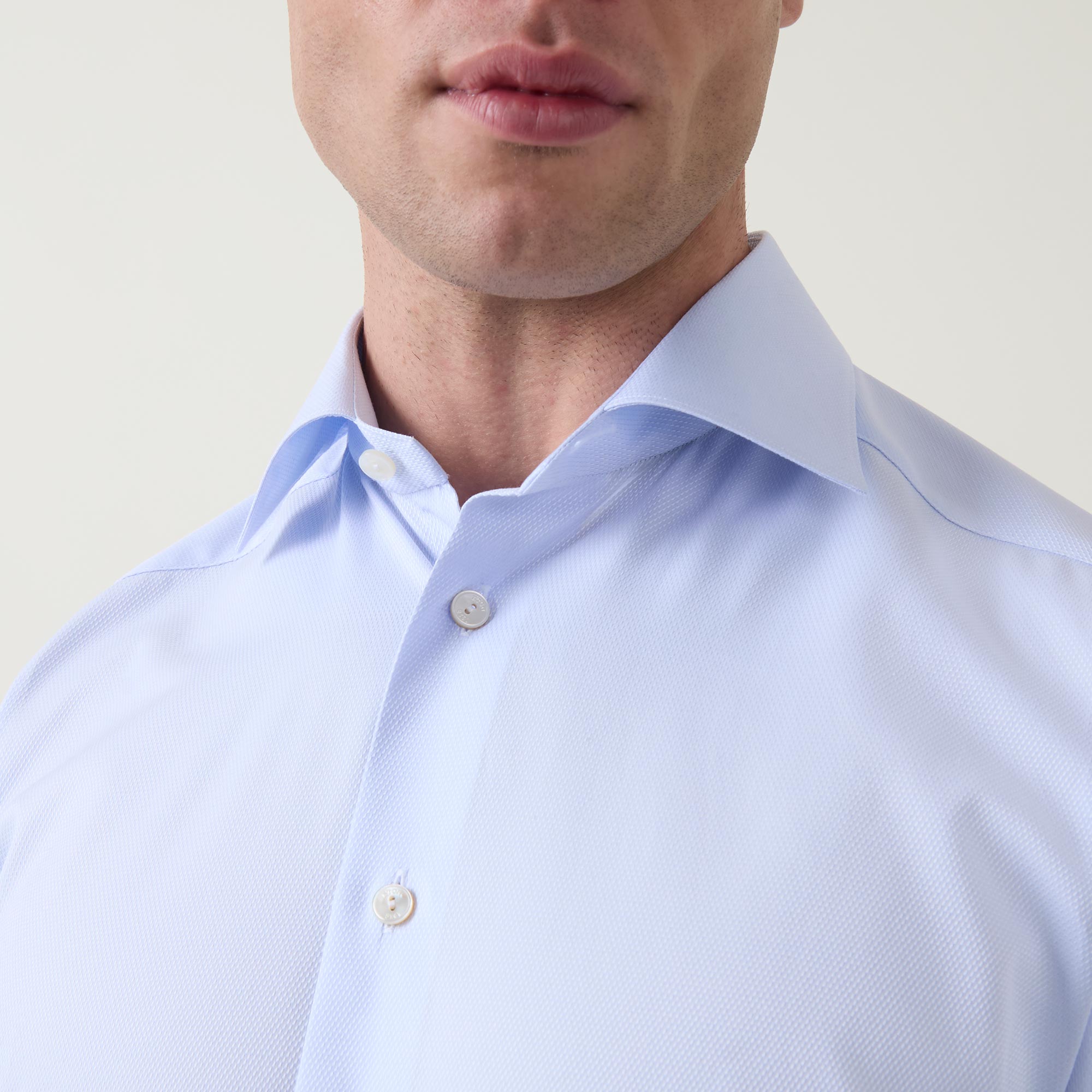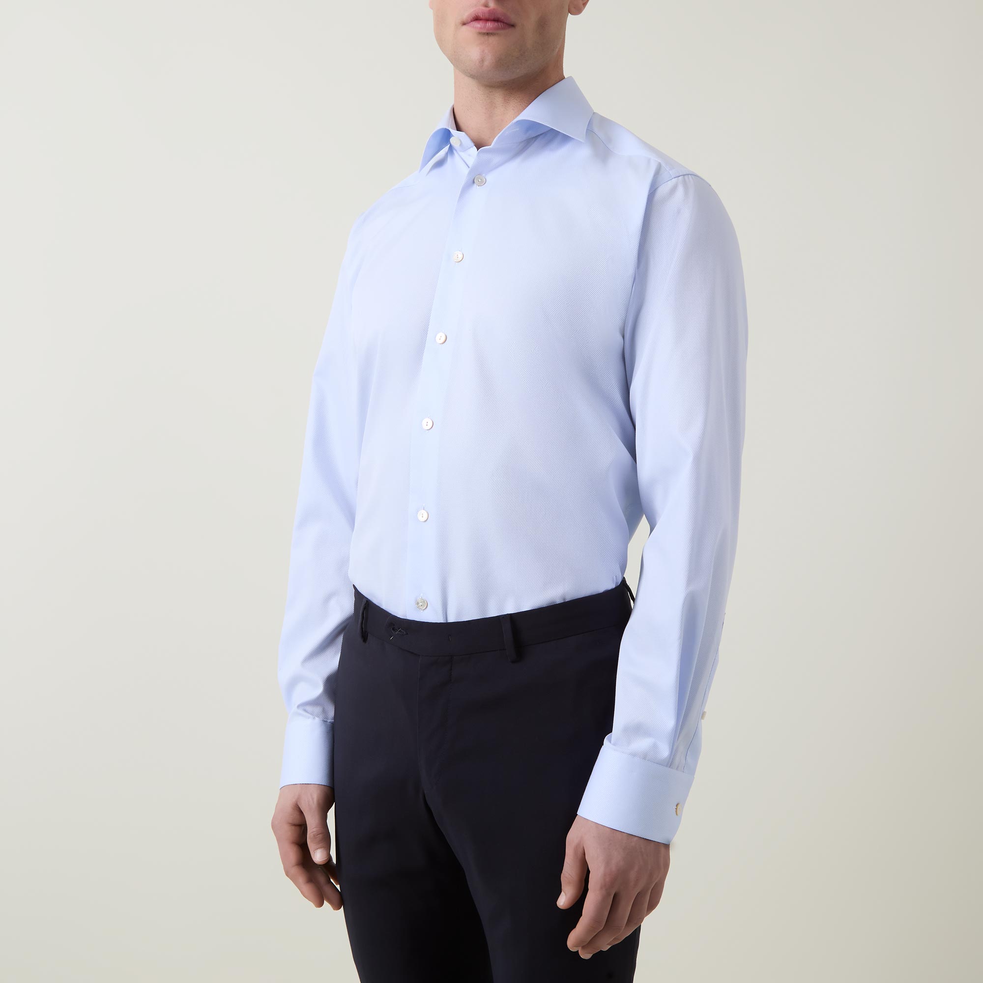 • Cut-away collar, button fastening, long sleeves, single-cuff, curved hemline, lightly textured weave, French seams