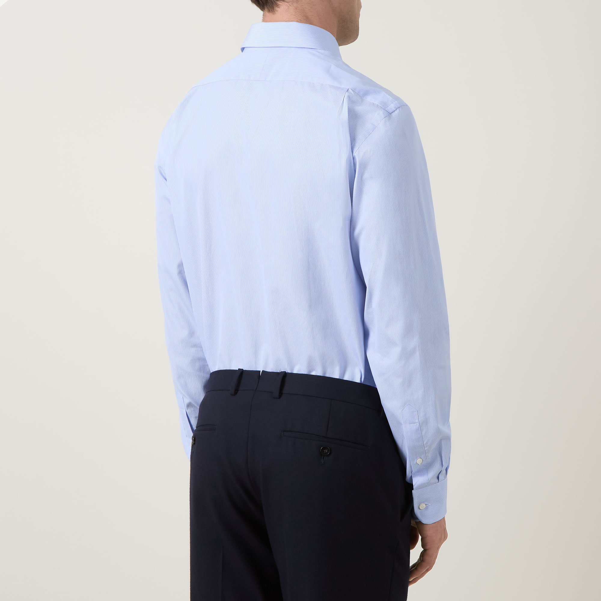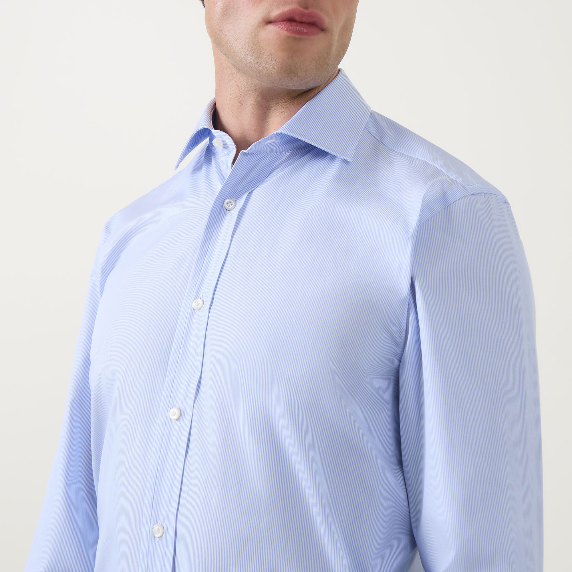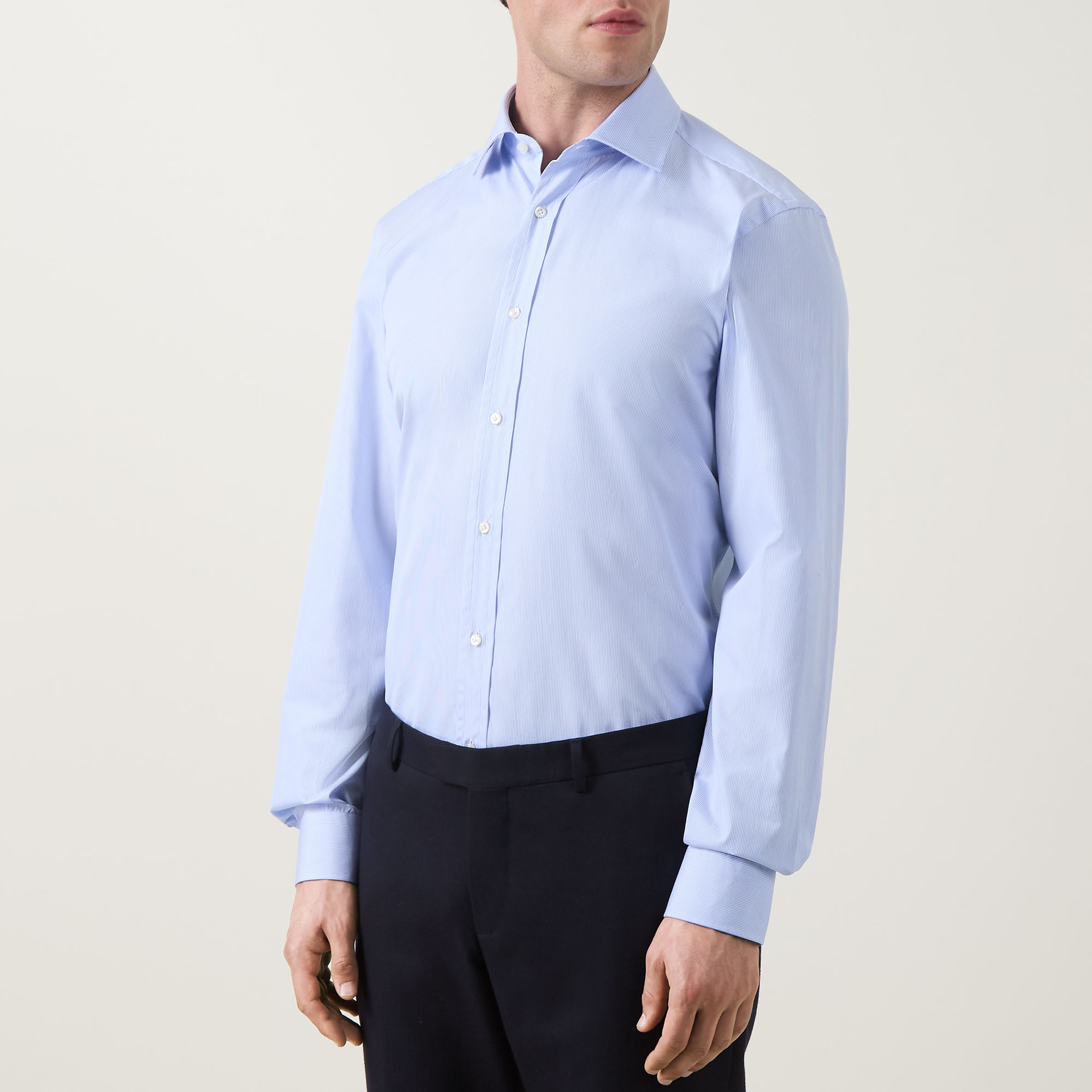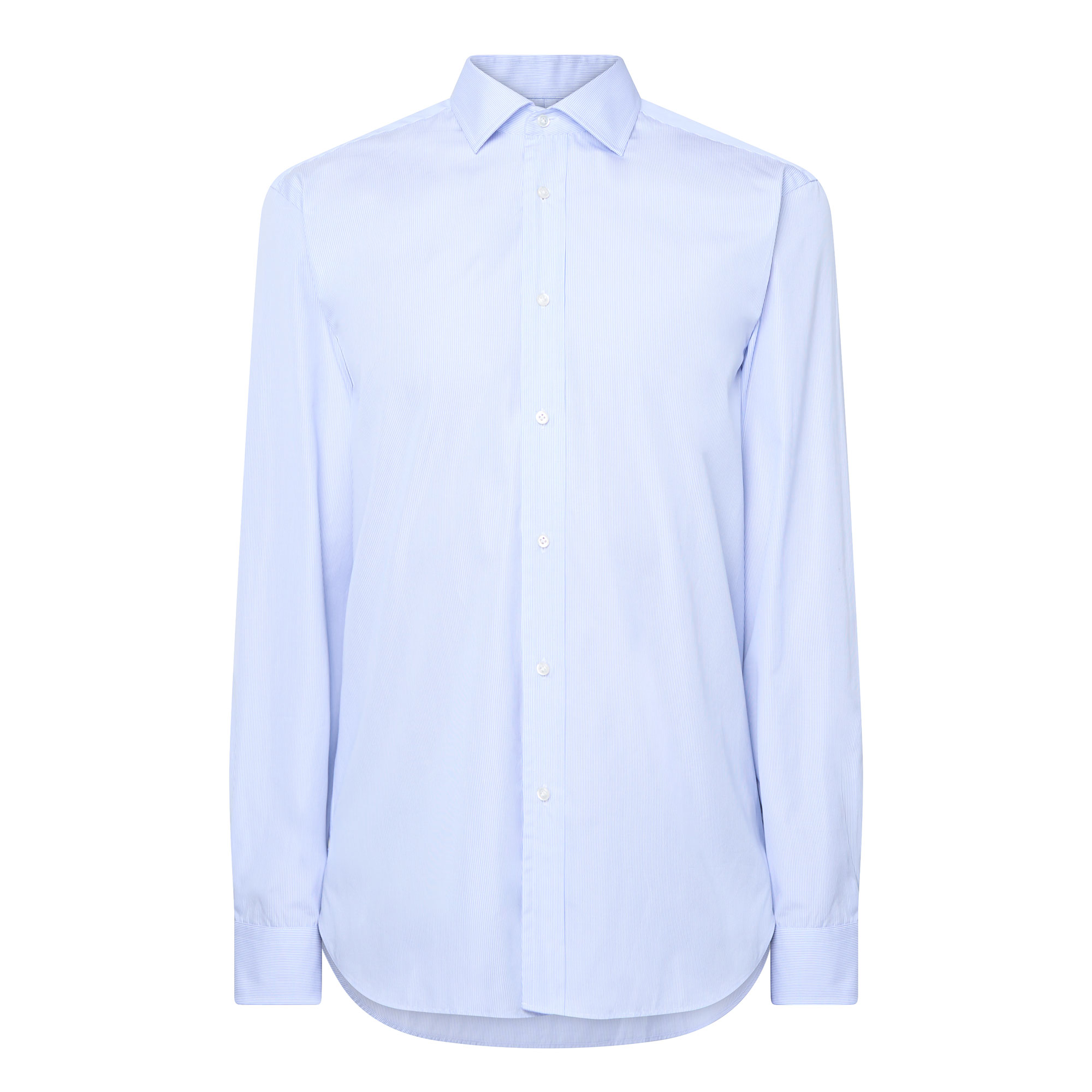 - Semi-spread collar, long sleeves, rounded button cuffs, front button fastening, curved hem, tonal stitching