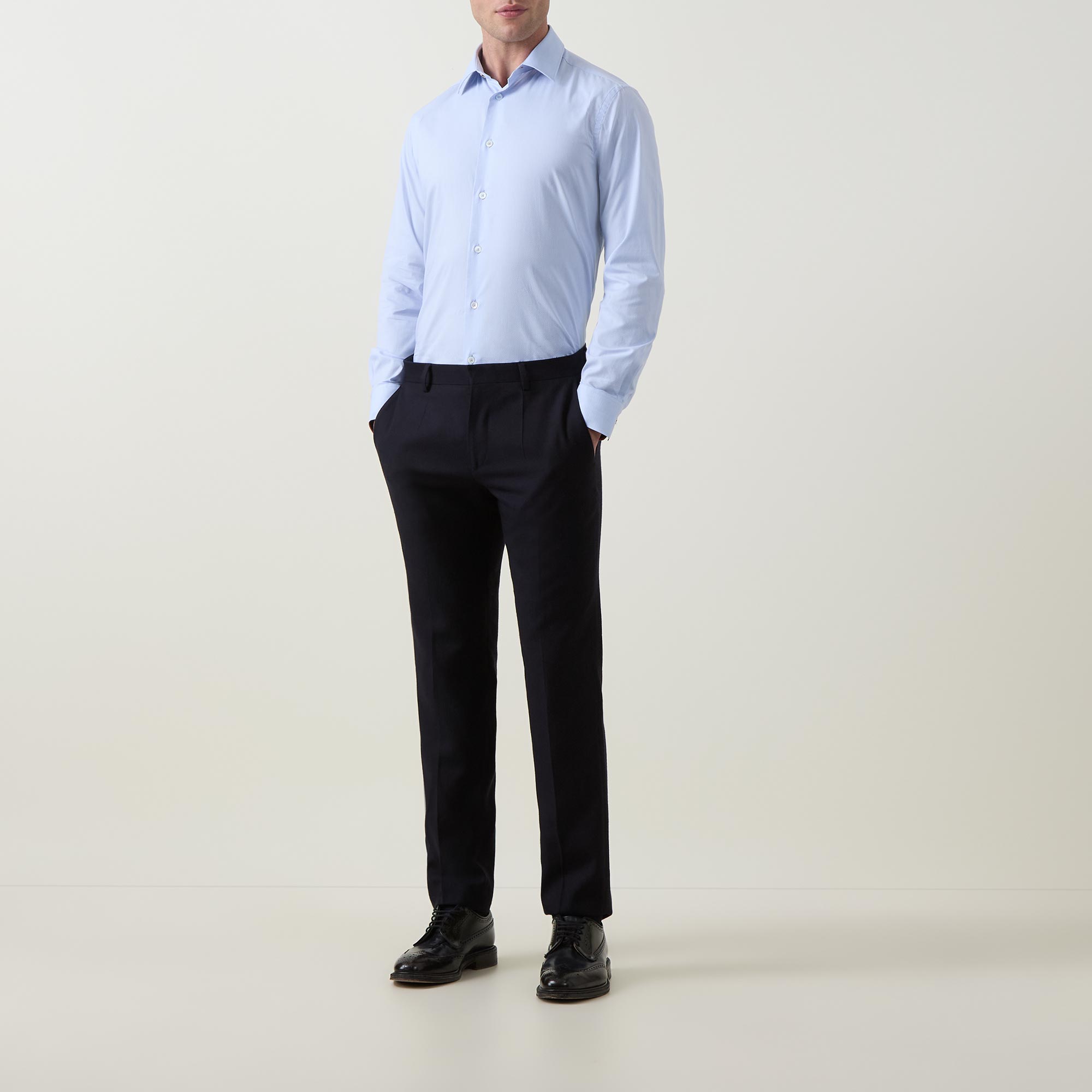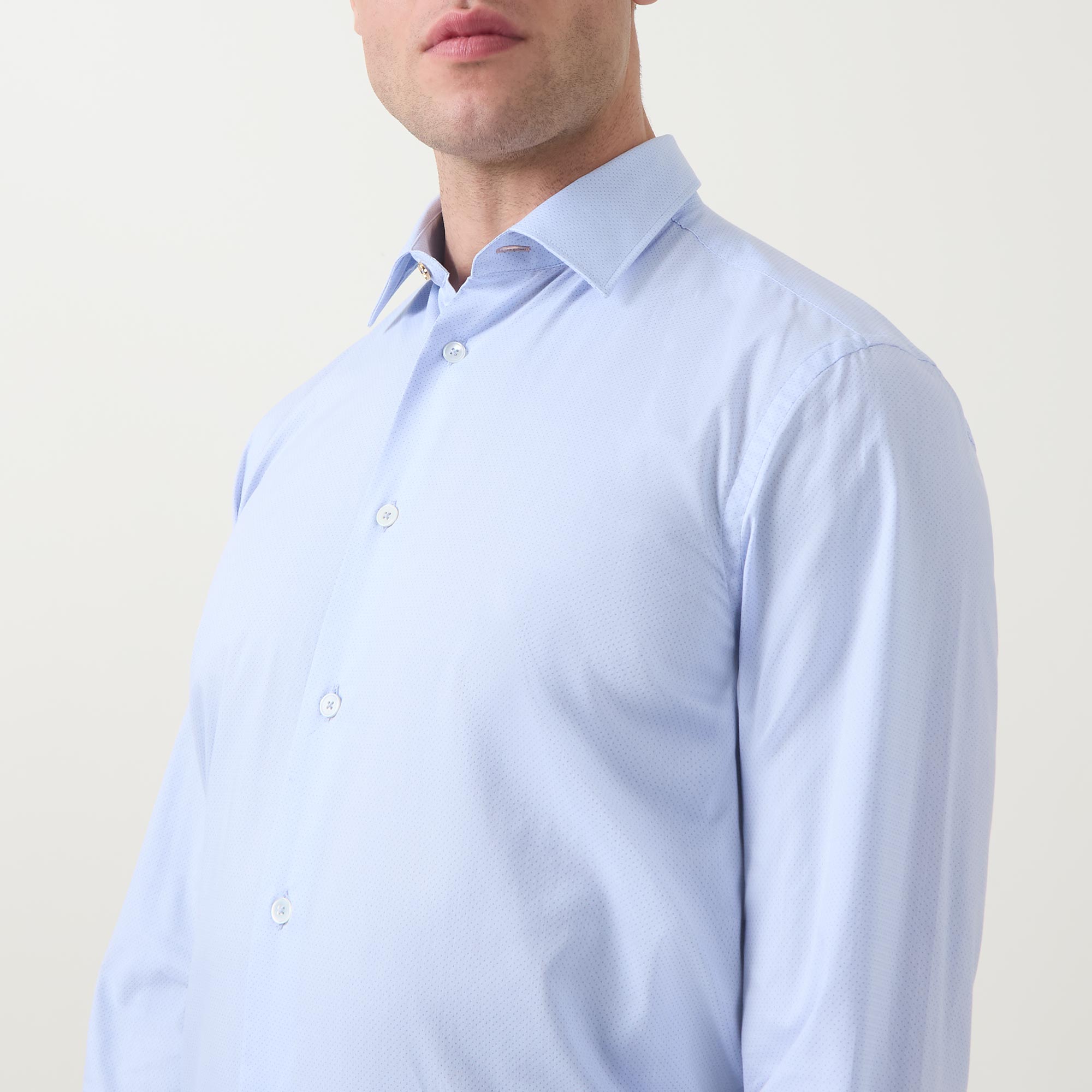 • Point collar, long sleeves, front button placket, tonal stitching, single-button cuffs, darting to the back, curved hemline, smooth fabric
