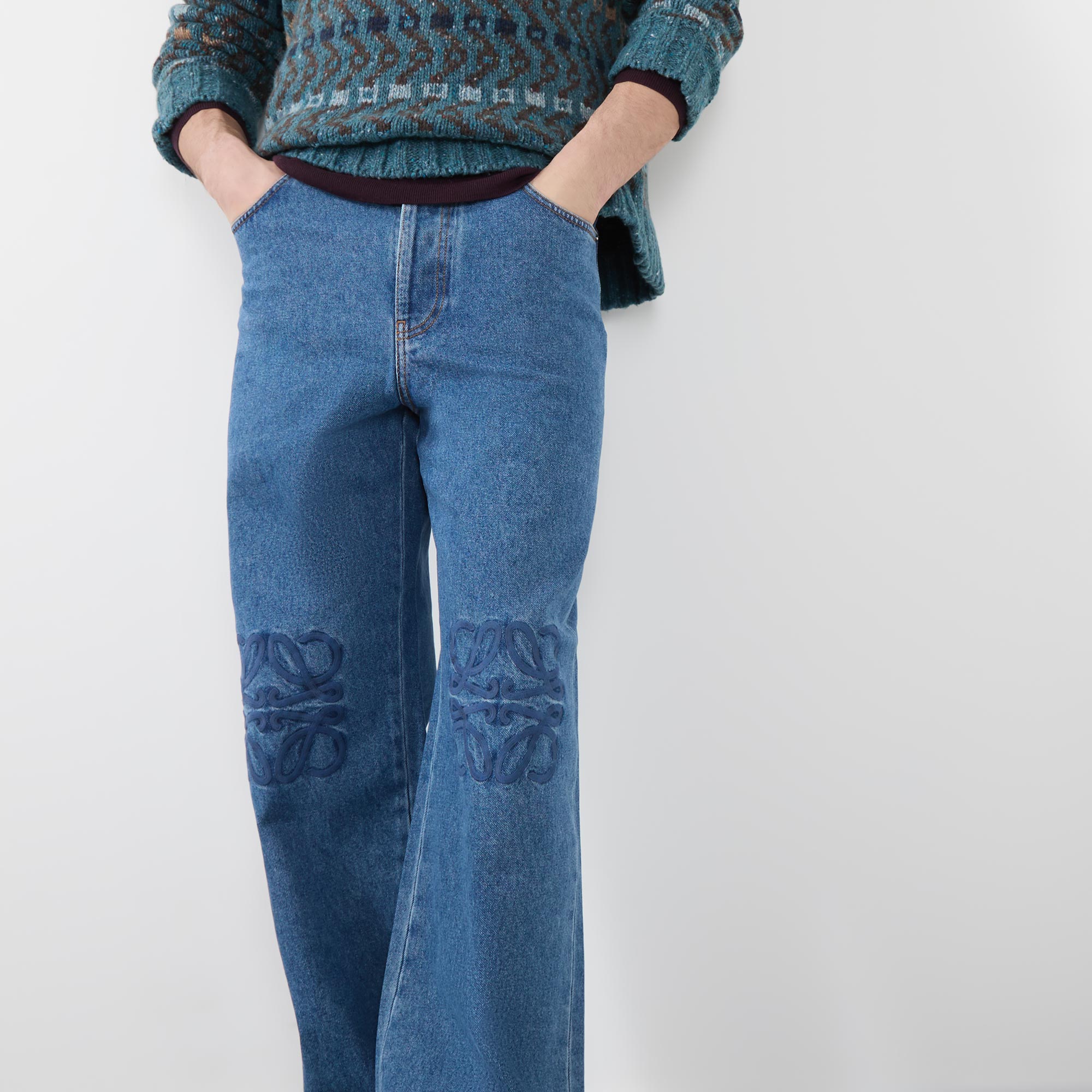 - Mid rise, straight leg, baggy silhouette, belt loops, concealed fly and button fastening, five-pocket styling, clean hems, embroidered Anagram logo detailing at the knees, tobacco stitching, logo patch, mid wash finish