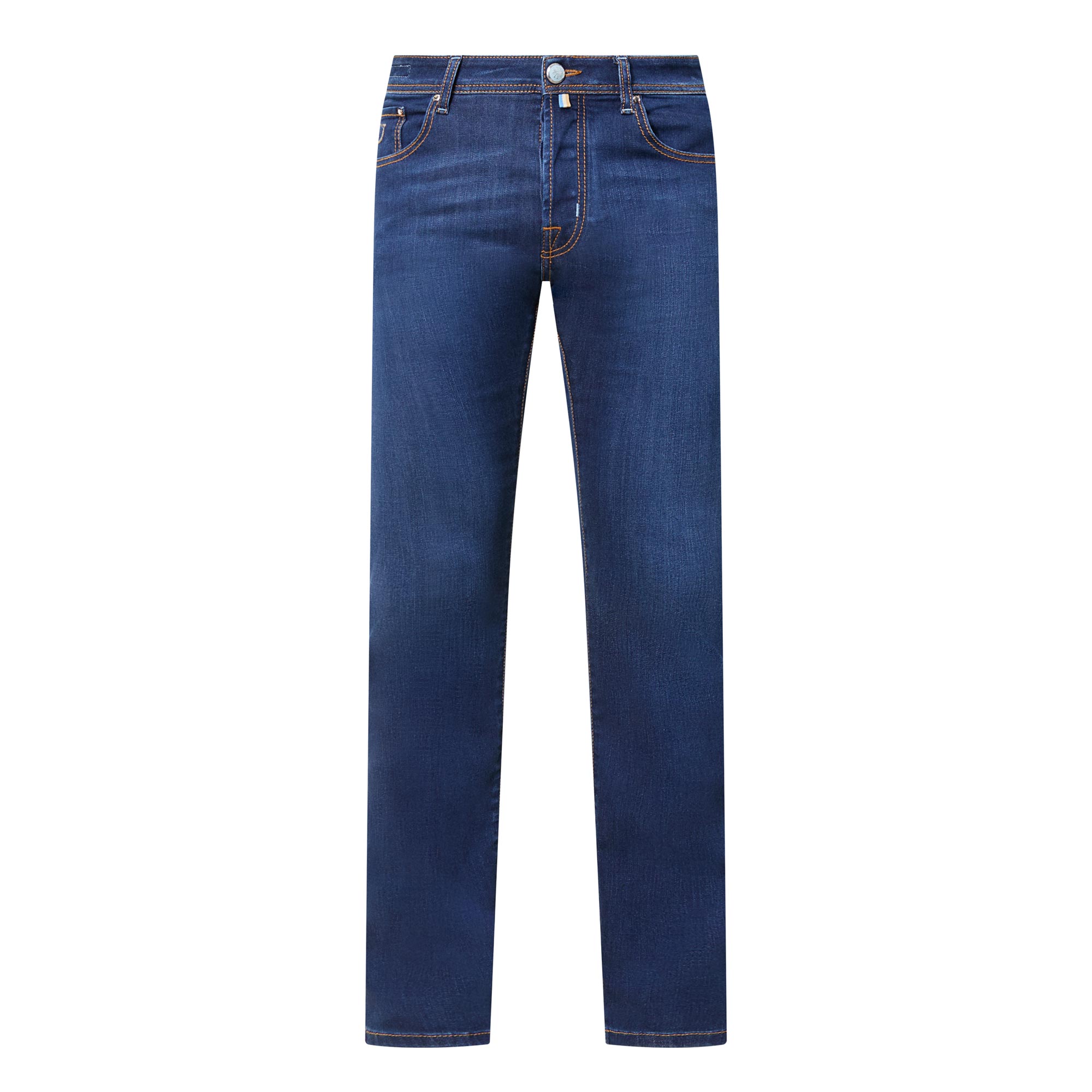 • Zip-fly and button fastening, belt loops, five-pocket design, clean hems, tobacco stitching, rear logo patch, mid-rise, slim-cut leg, mid wash finish