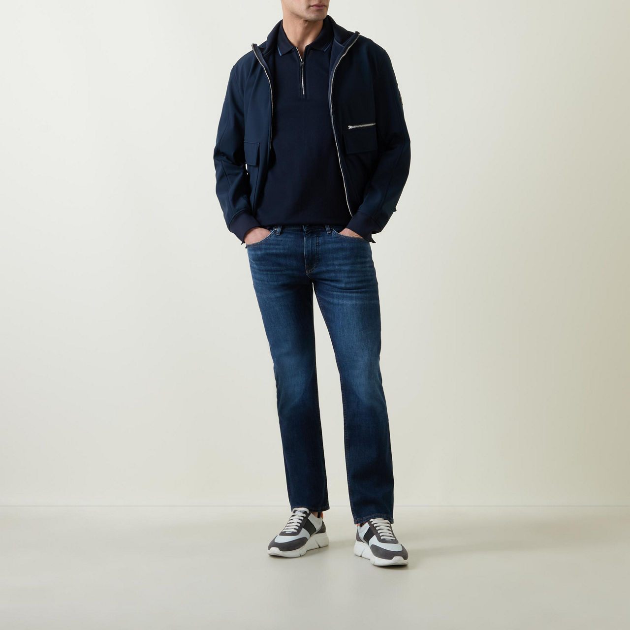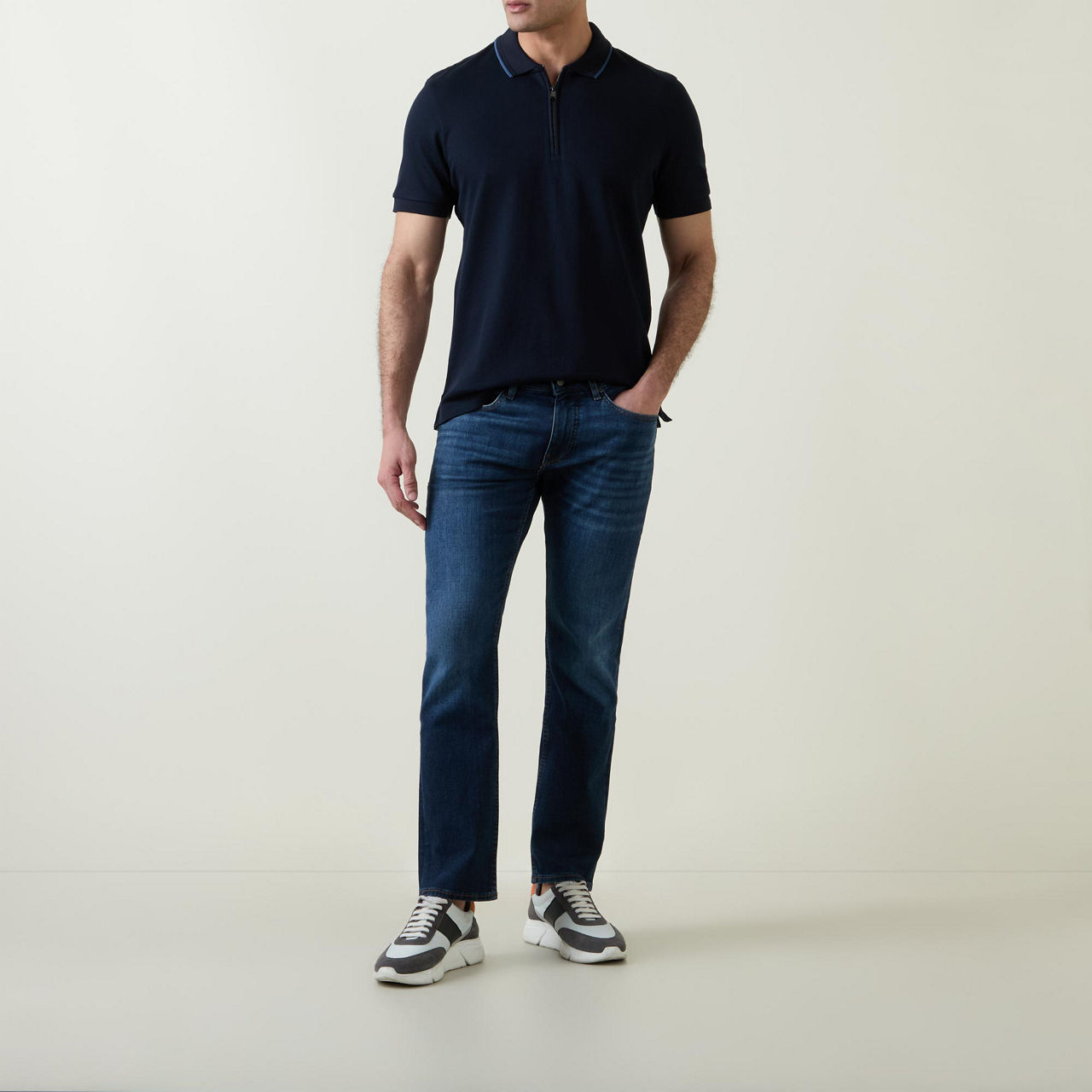 - Mid-rise, slim-leg, belt loops, zip fly with button fastening, five-pocket styling, clean hems, signature trim detailing, rear logo patch