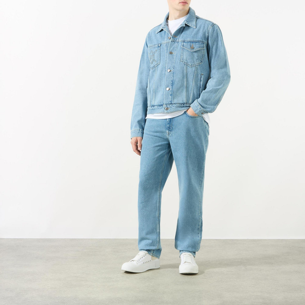 - Zip-fly and button fastening, belt loops, five-pocket design, logo patch, contrast stitching, whiskering and faded details, smooth denim finish