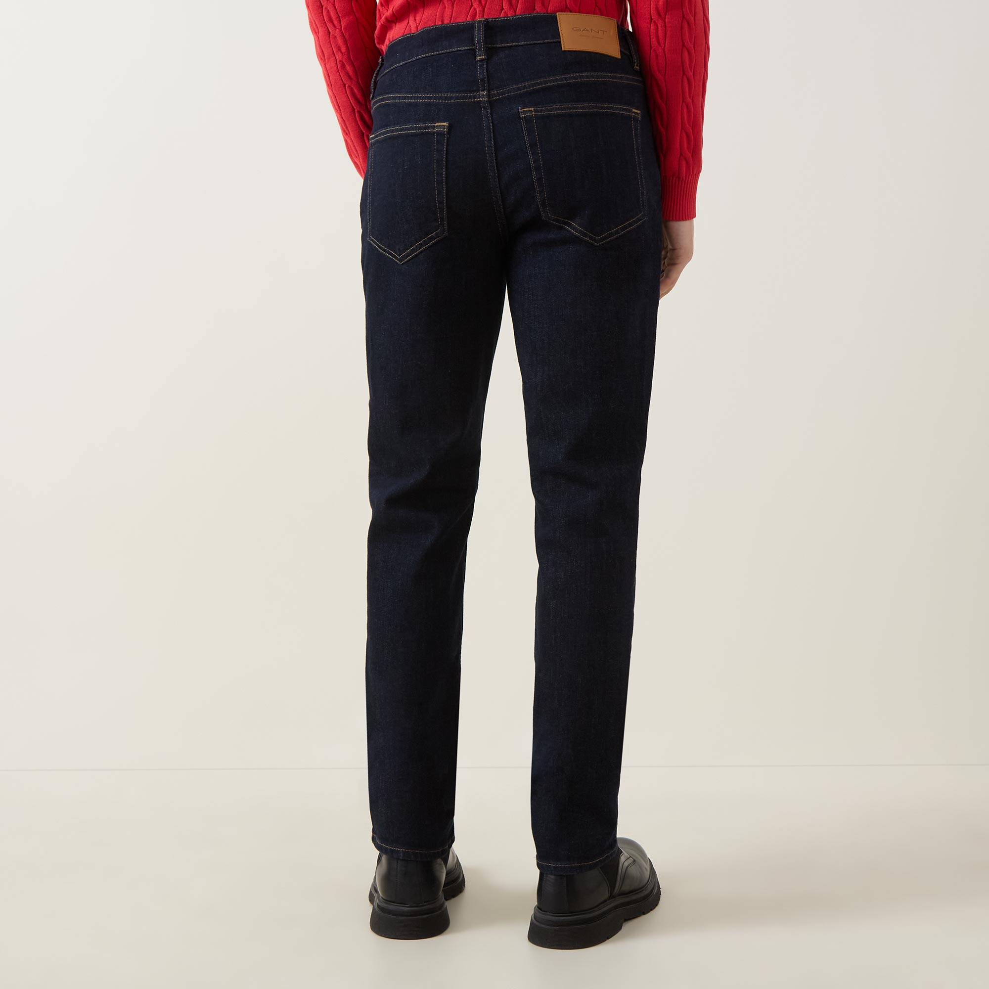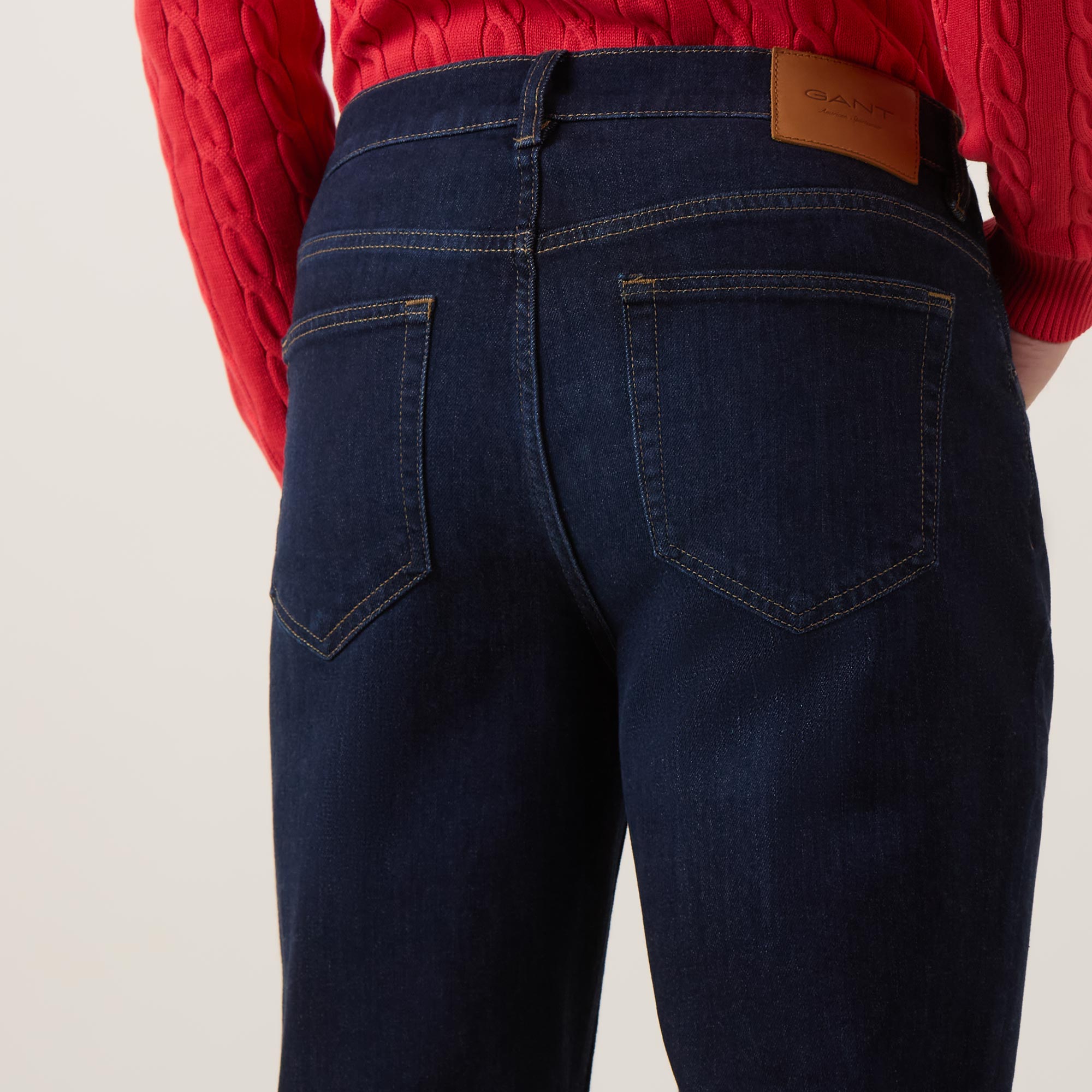 - Zip-fly and button fastening, belt loops, five-pocket design, contrast tobacco stitching, rear logo patch, whiskering, mid-rise, slim-cut leg, smooth denim finish