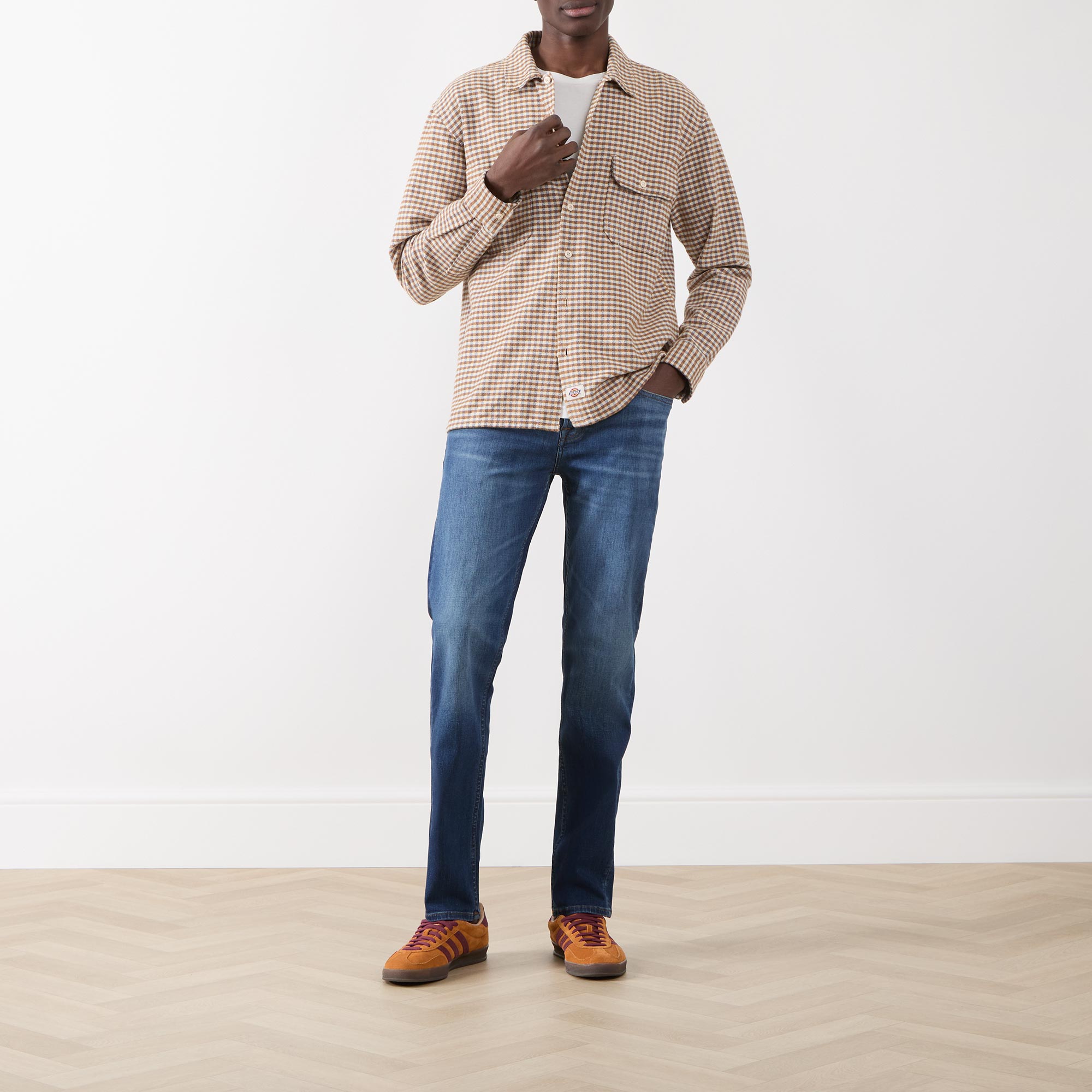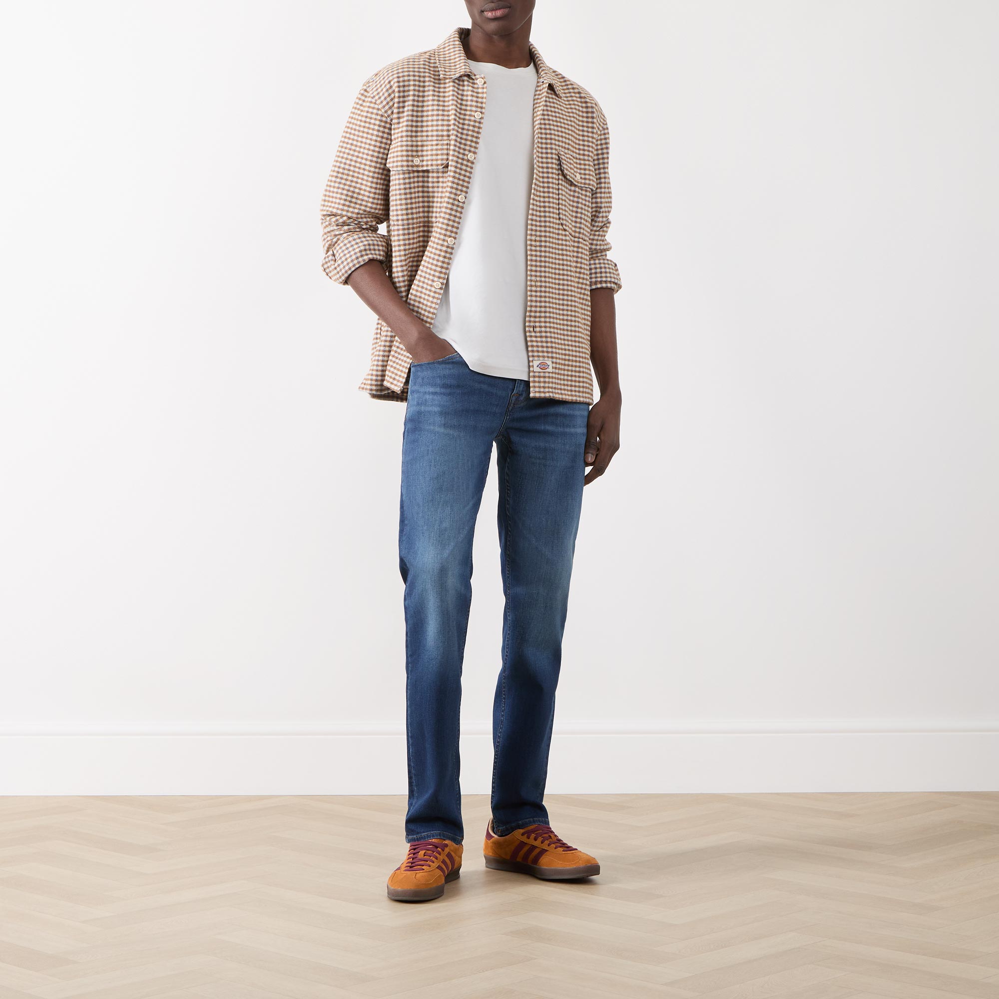 - Button and fly zip fastening, belt loops, slim legs, five-pocket style, logo badge, whiskering and faded details