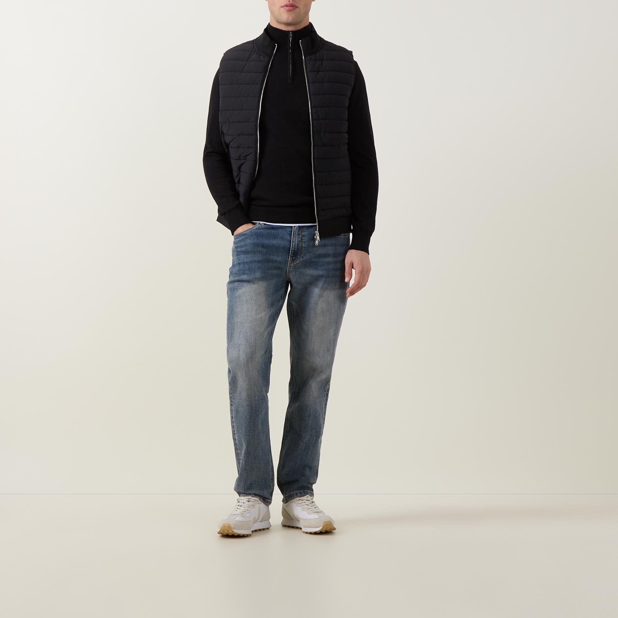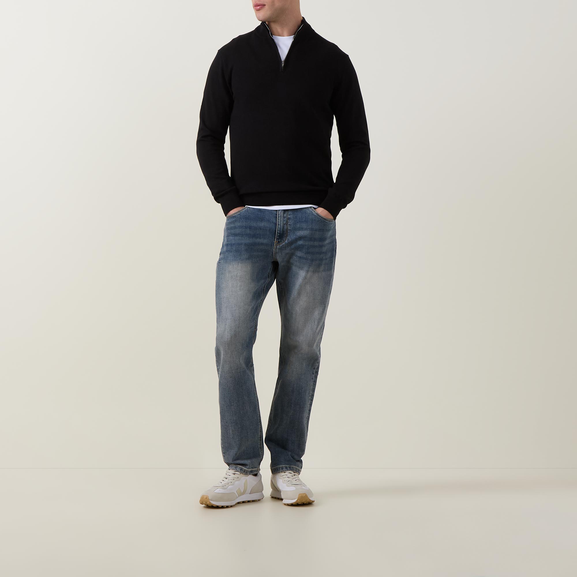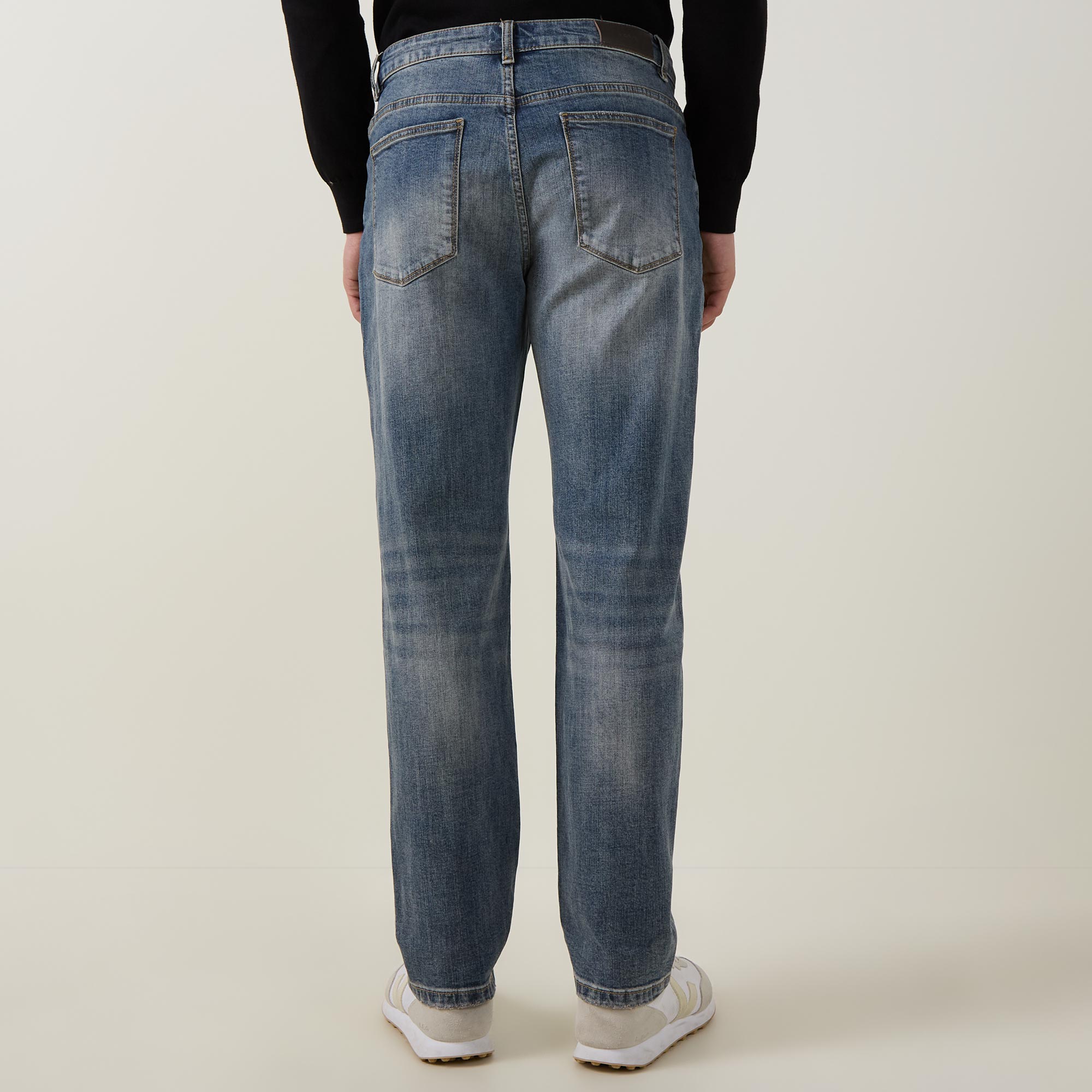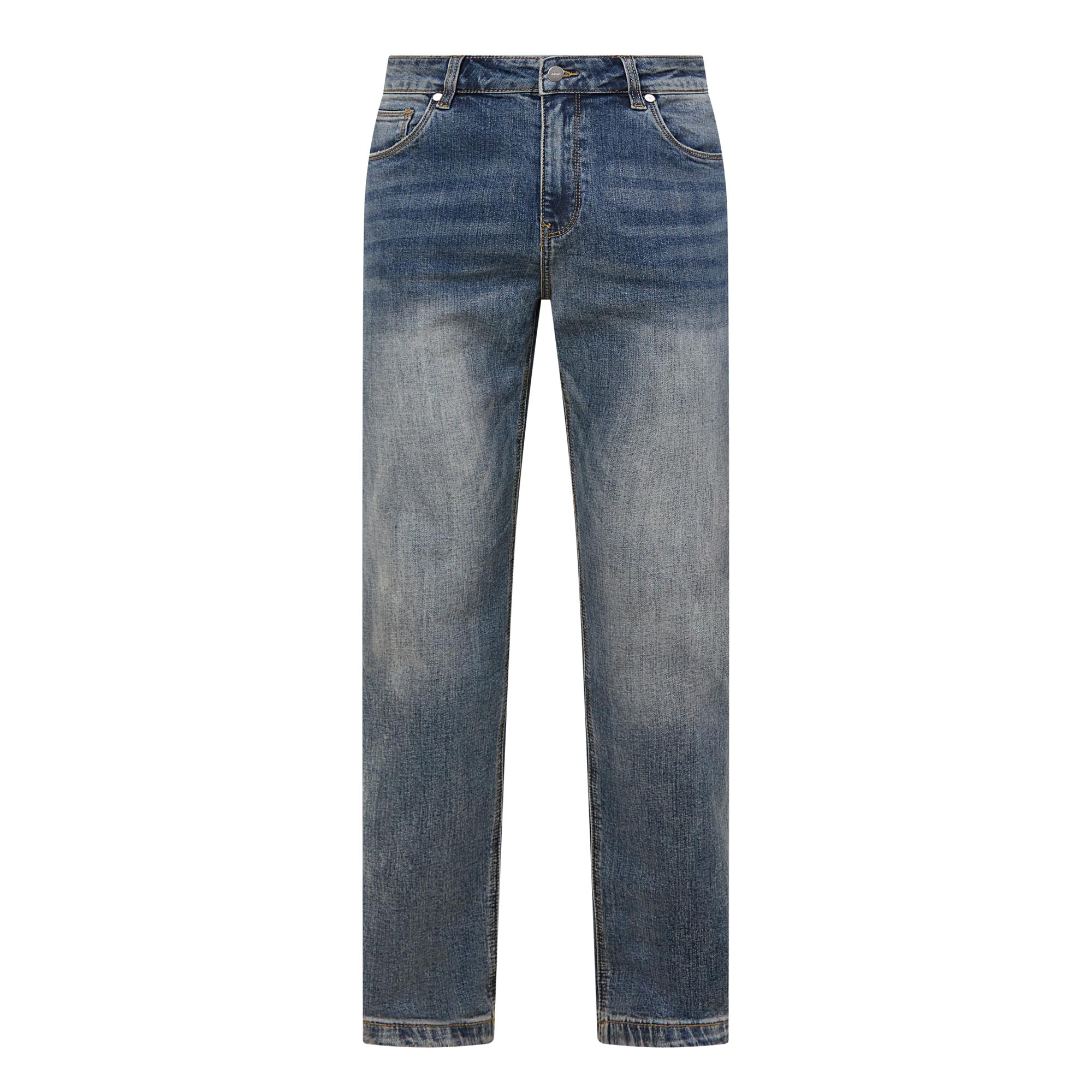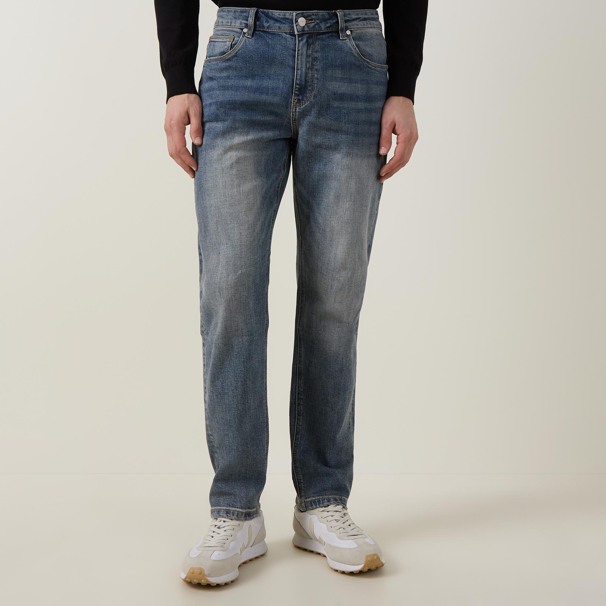 - Fixed waistband, belt loops, button and zip fly fastening, five pockets, faded details, contrast stitching