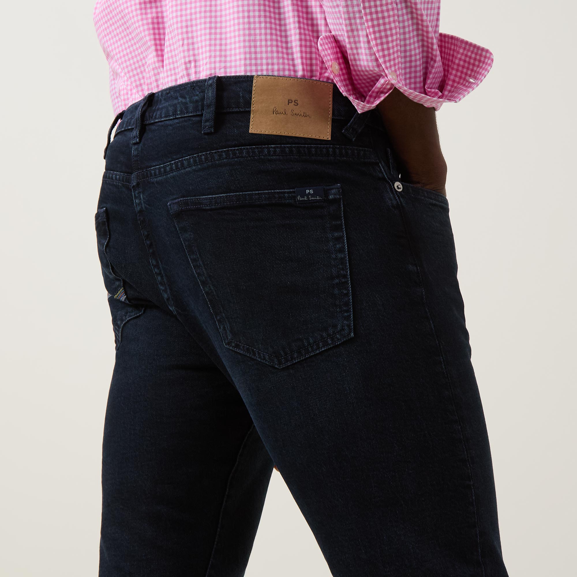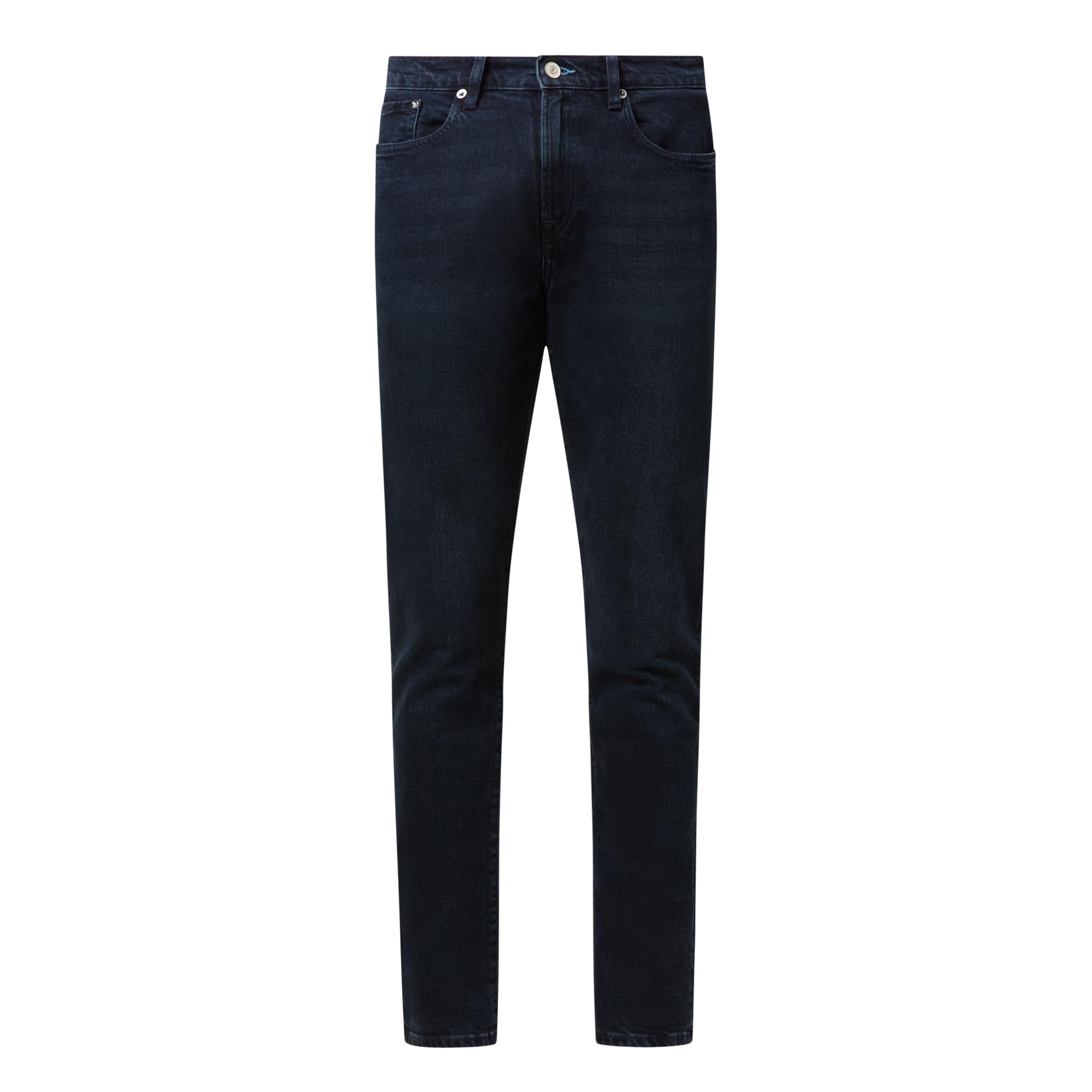 - Mid rise, tapered leg, belt loops, concealed fly and button fastening, five-pocket styling, clean hems, tobacco stitching, logo detailing, dark wash finish