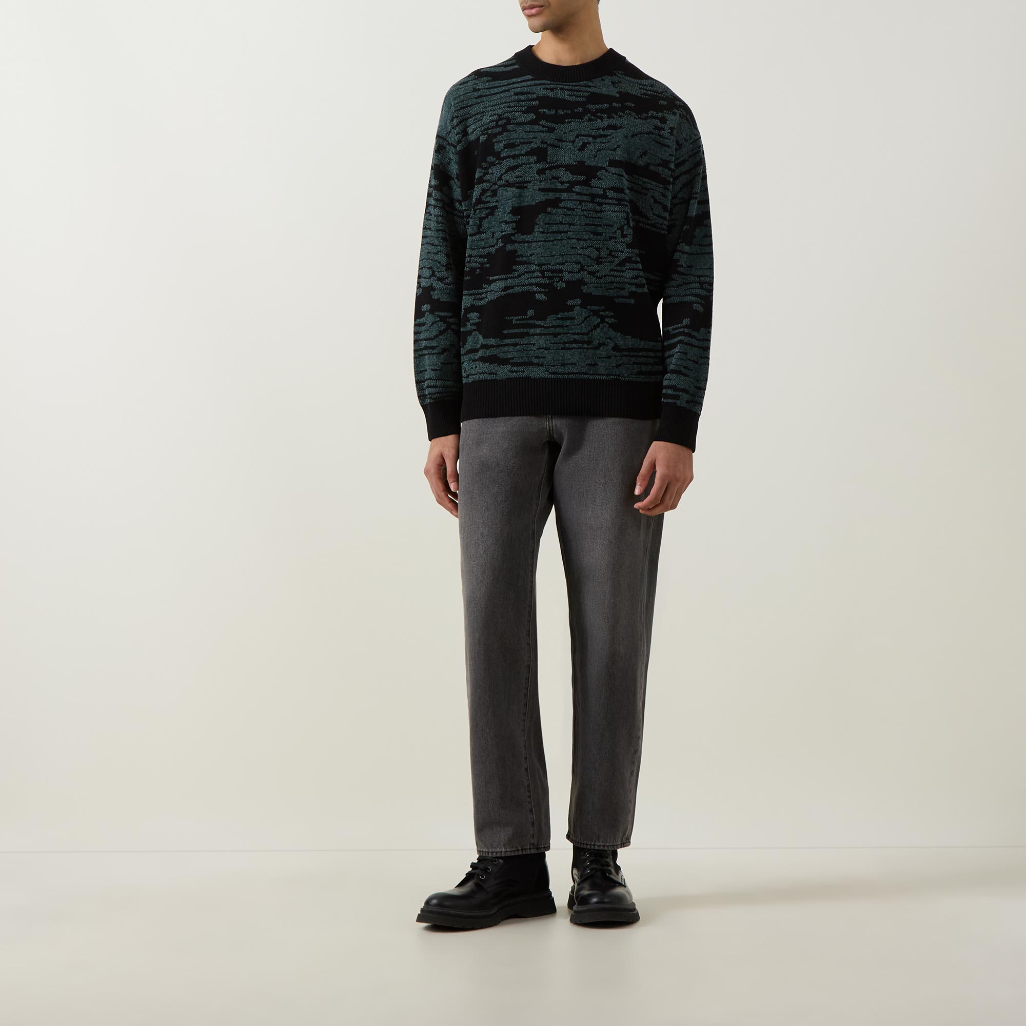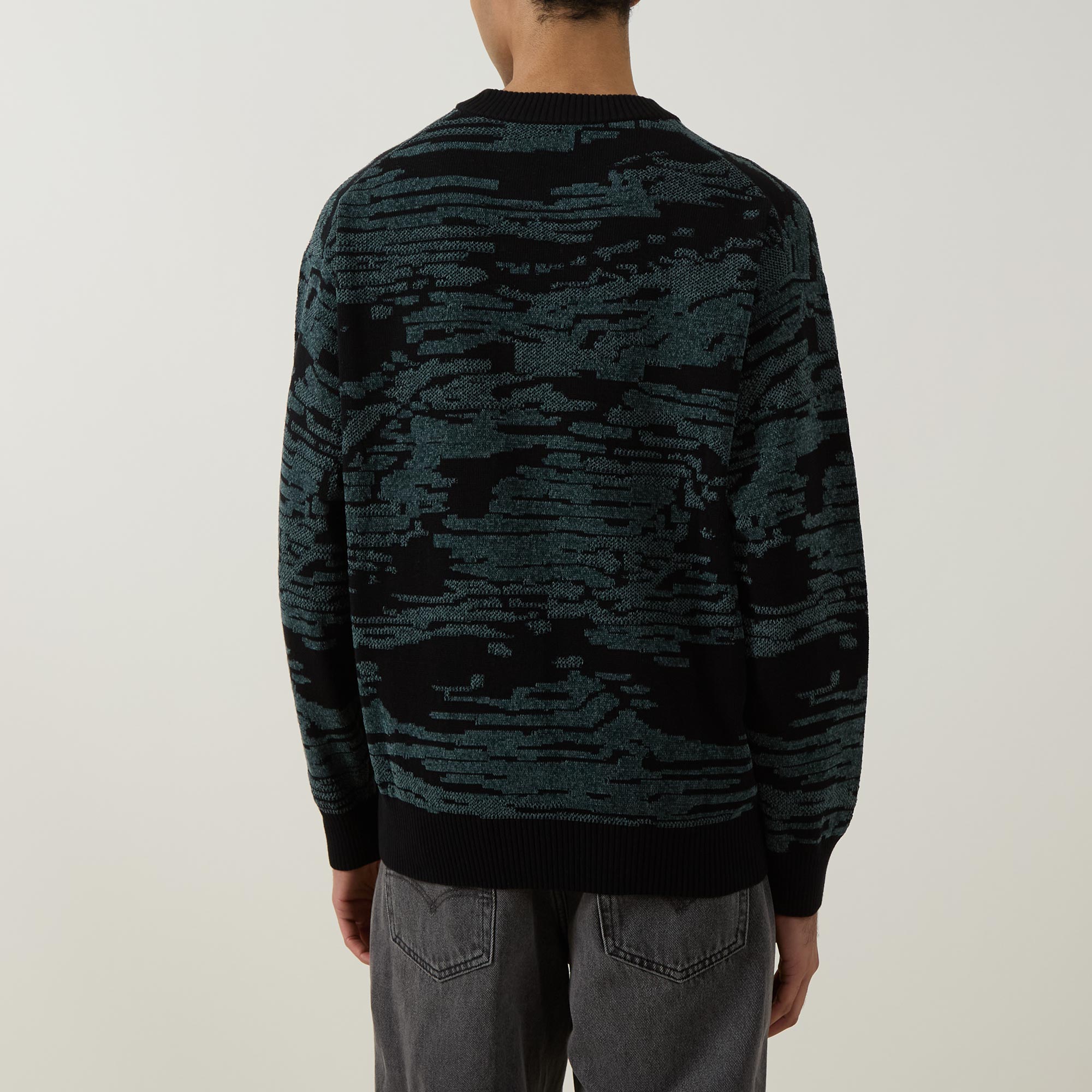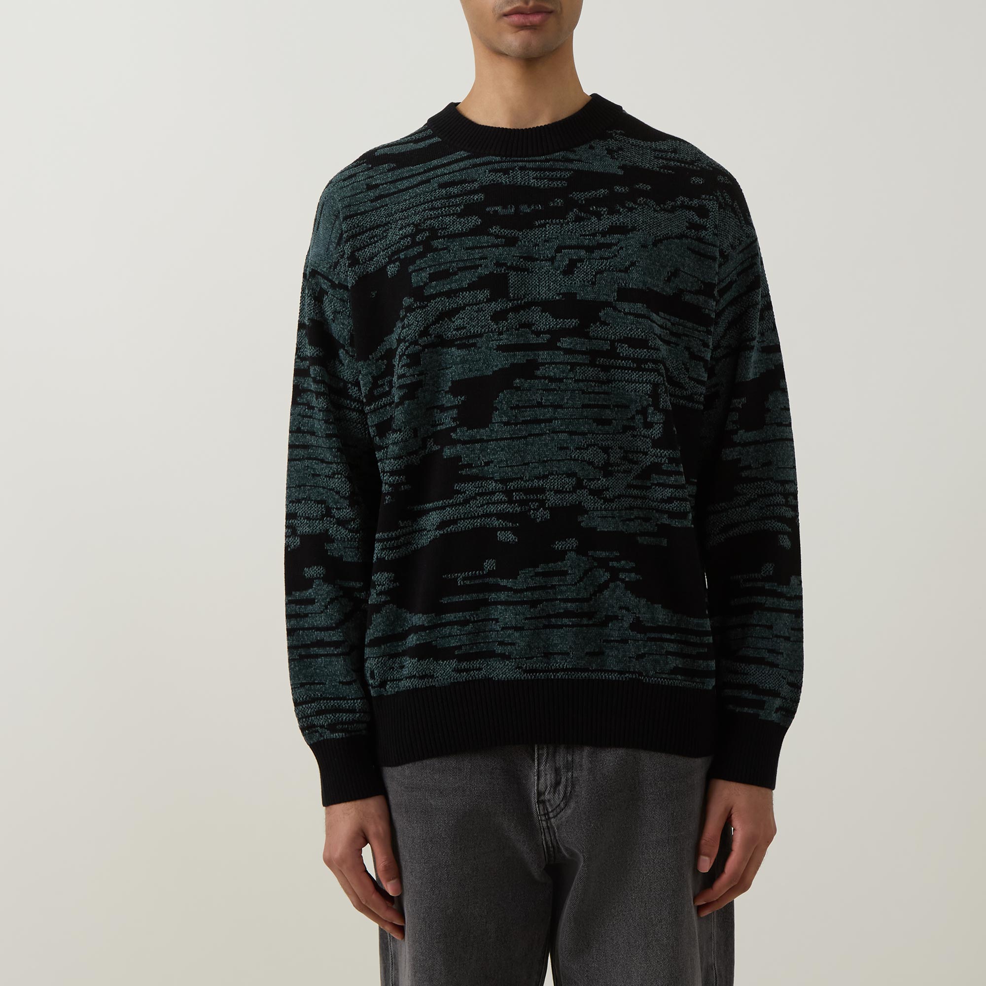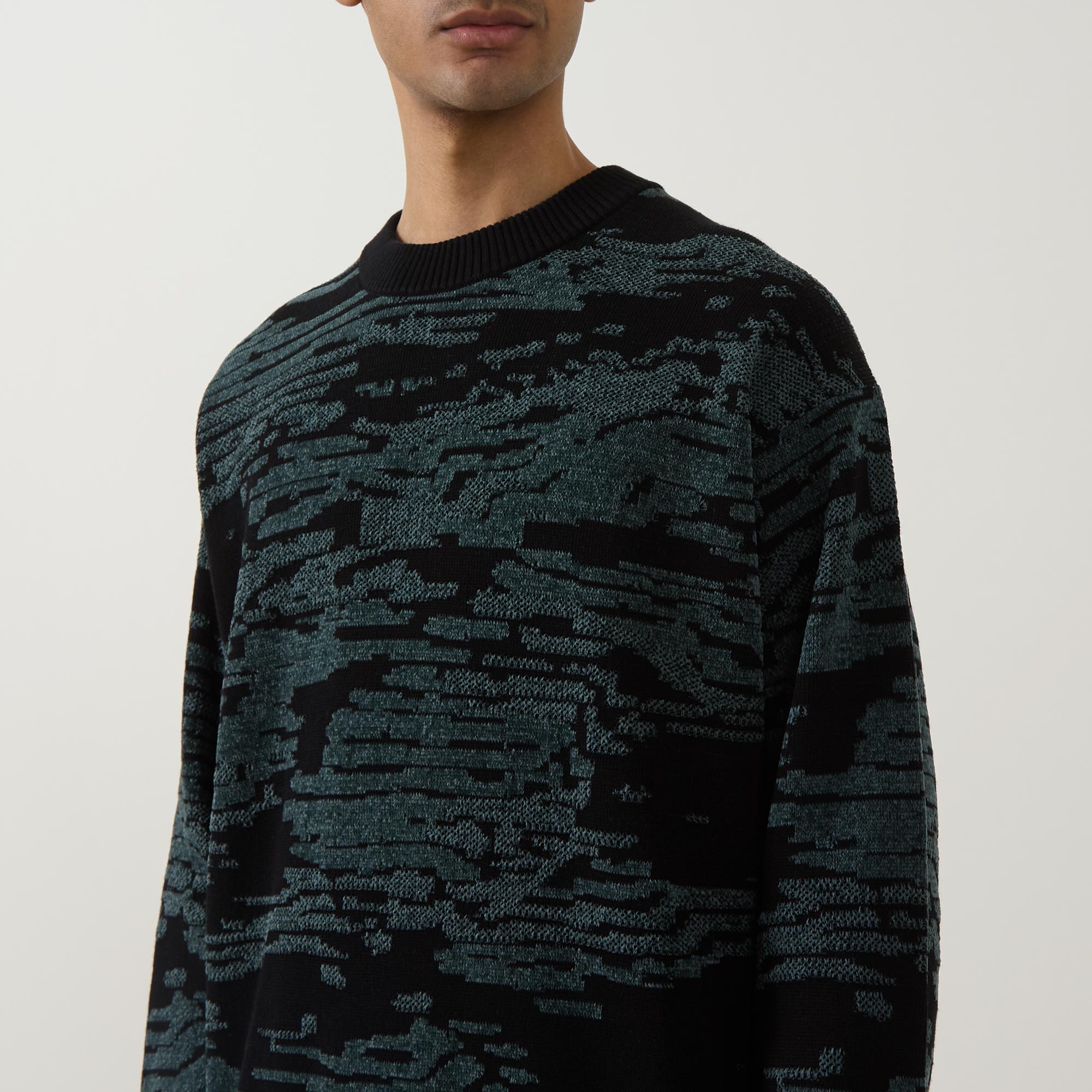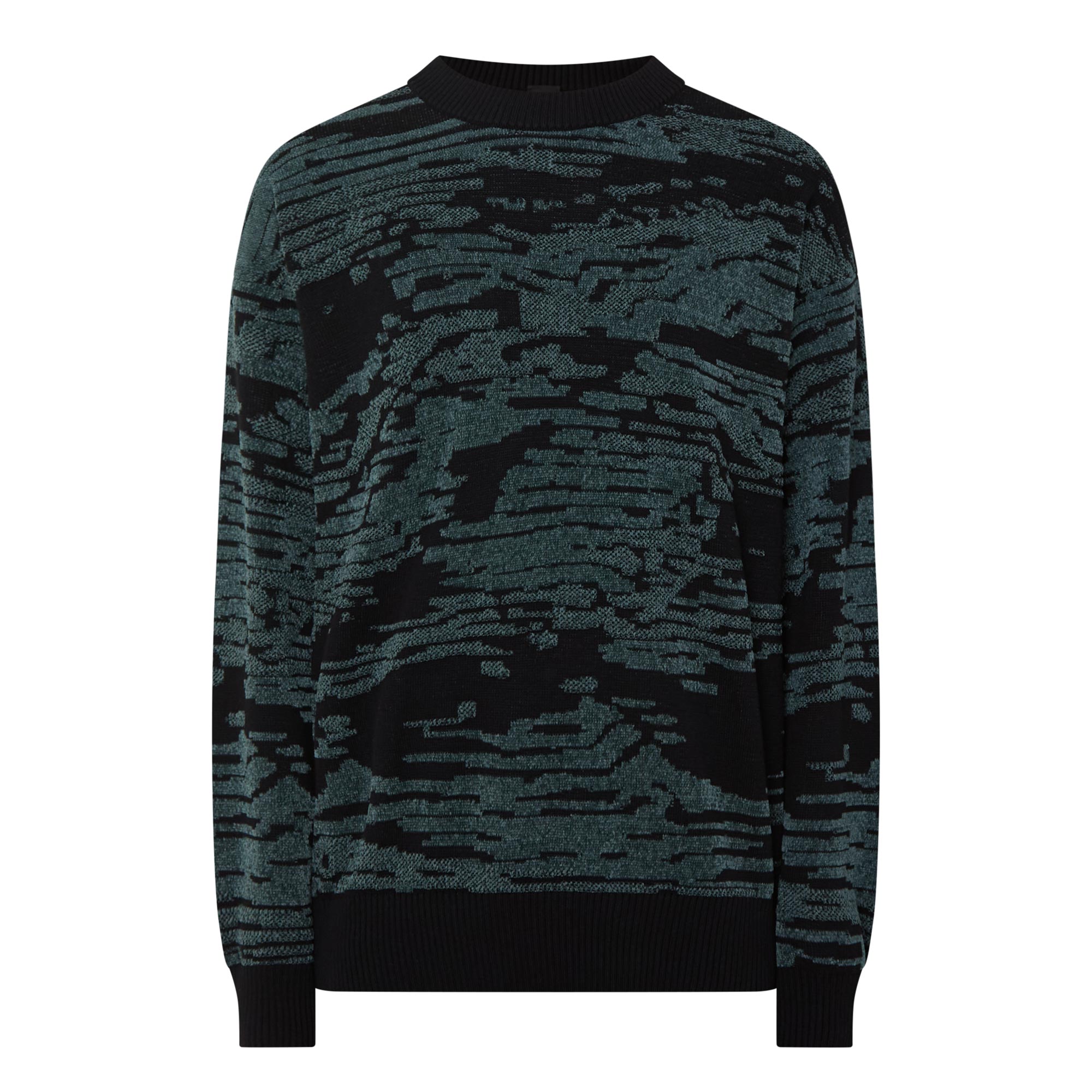 • Crew neck, dropped shoulders, long sleeves, straight hem, ribbed trims, jacquard landscape print, knit construction