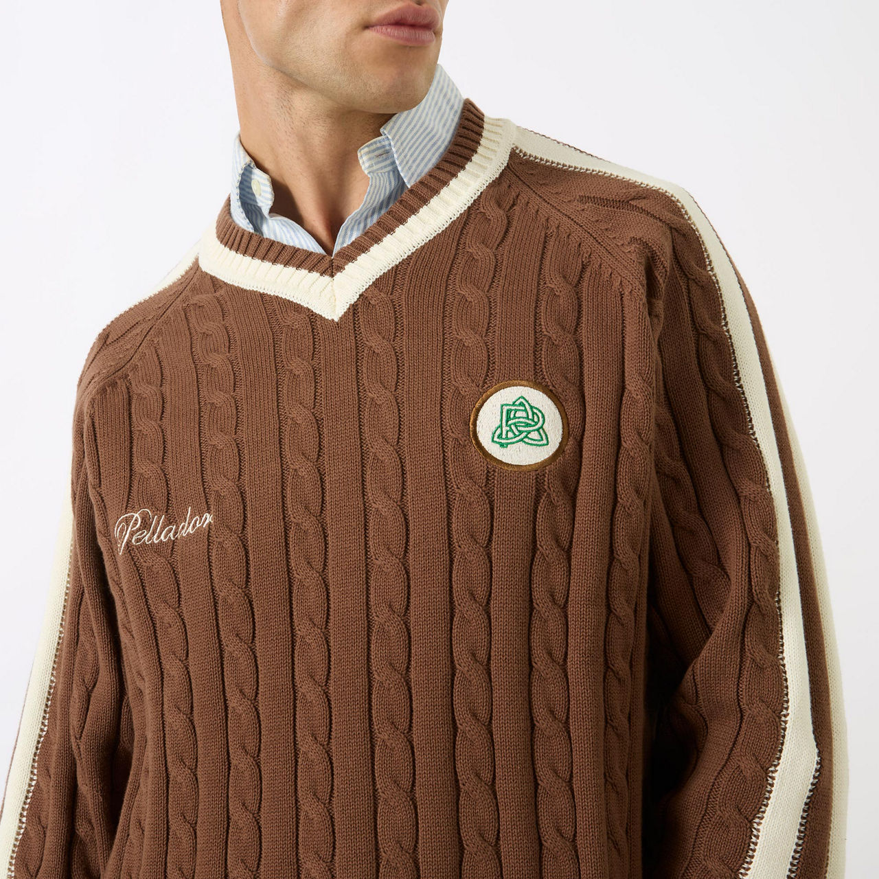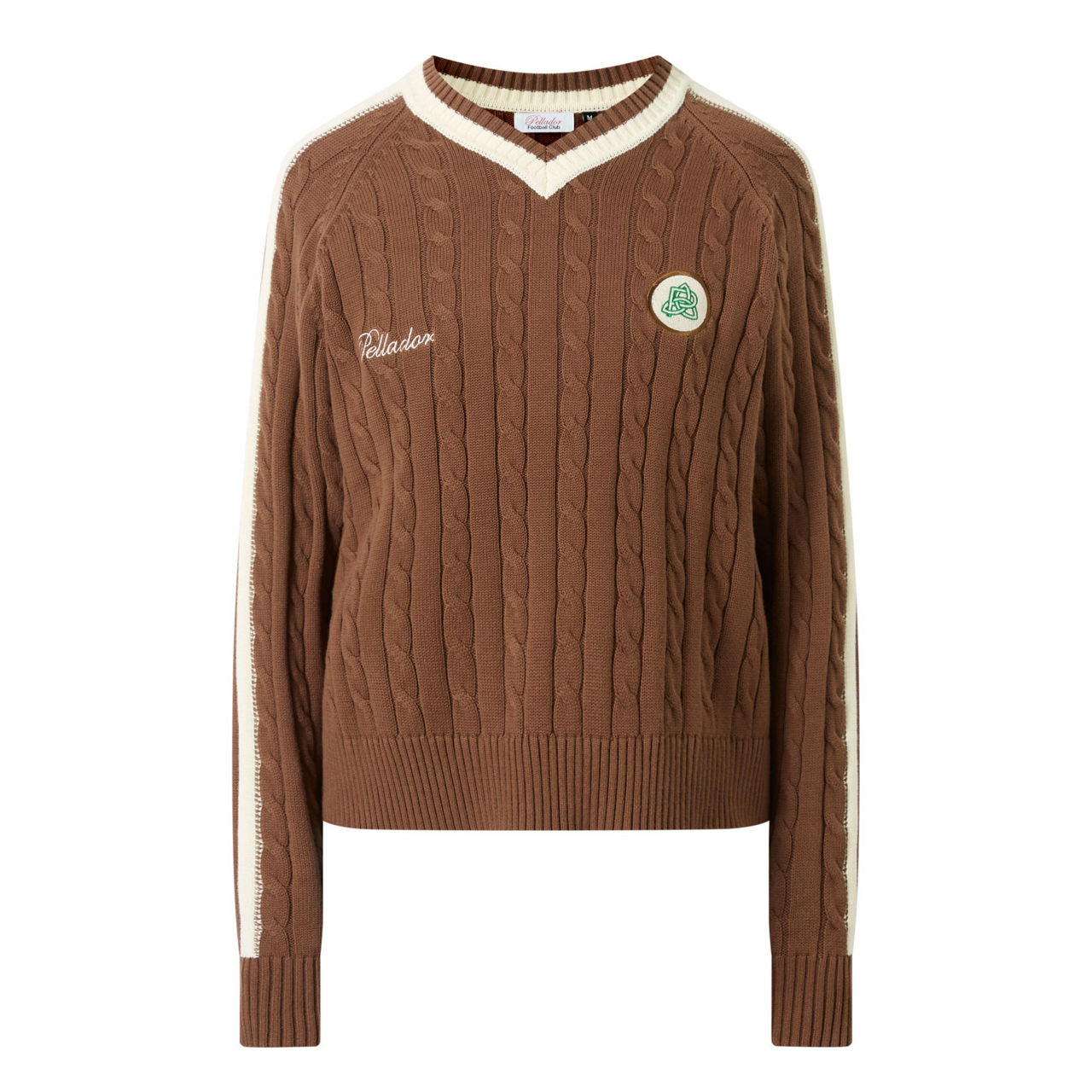 - V-neckline, contrast neckline, long sleeves, cable knit, logo detail, straight hemline