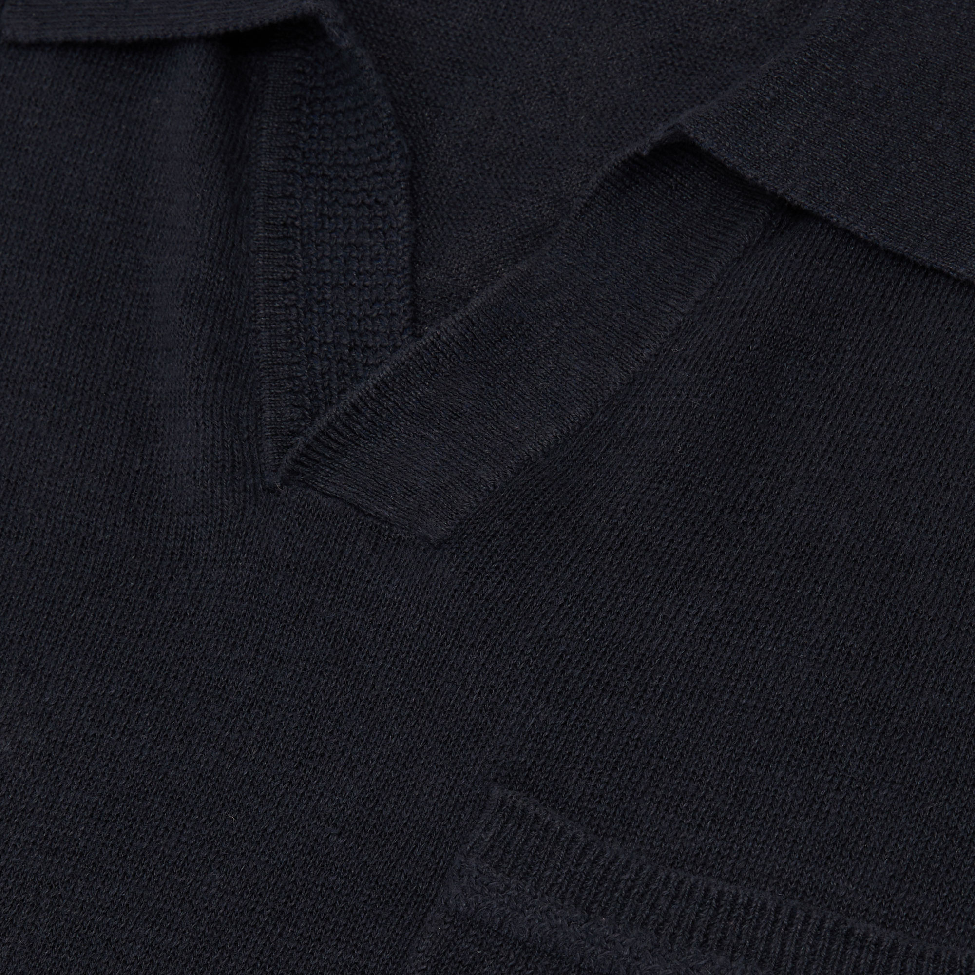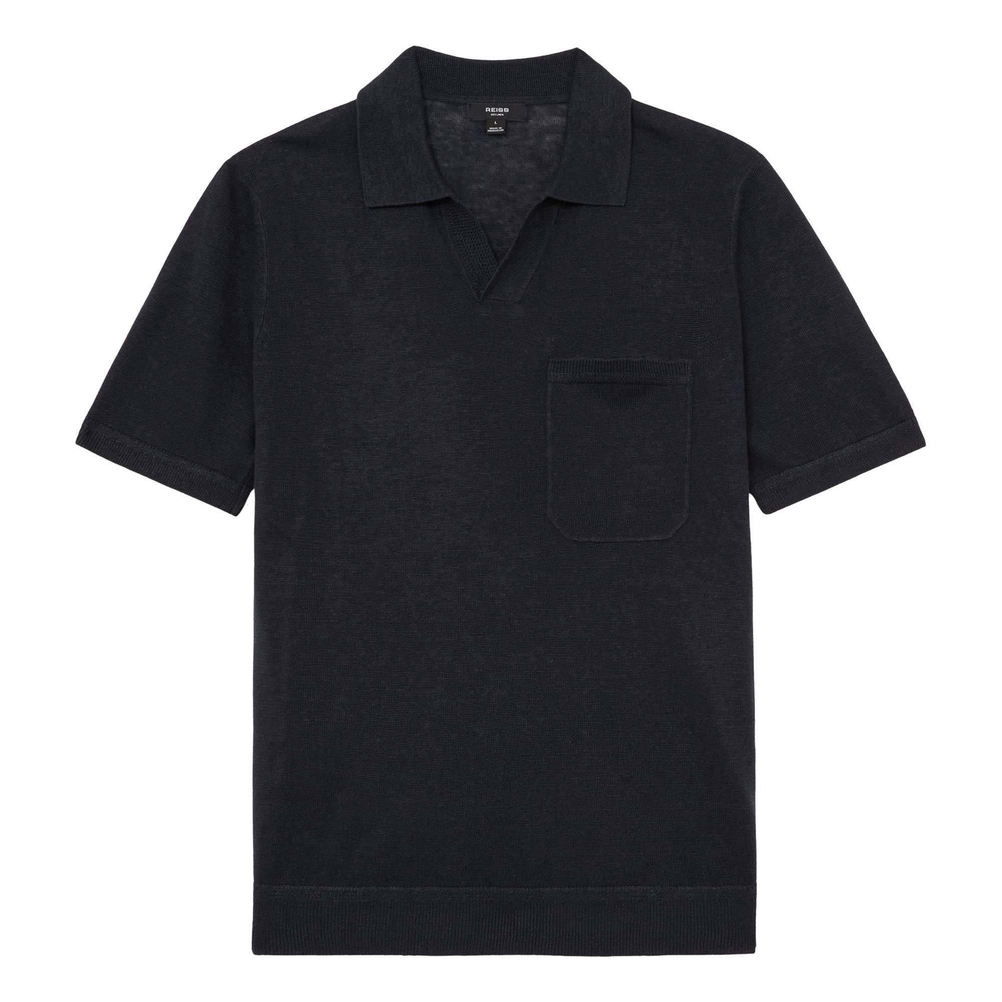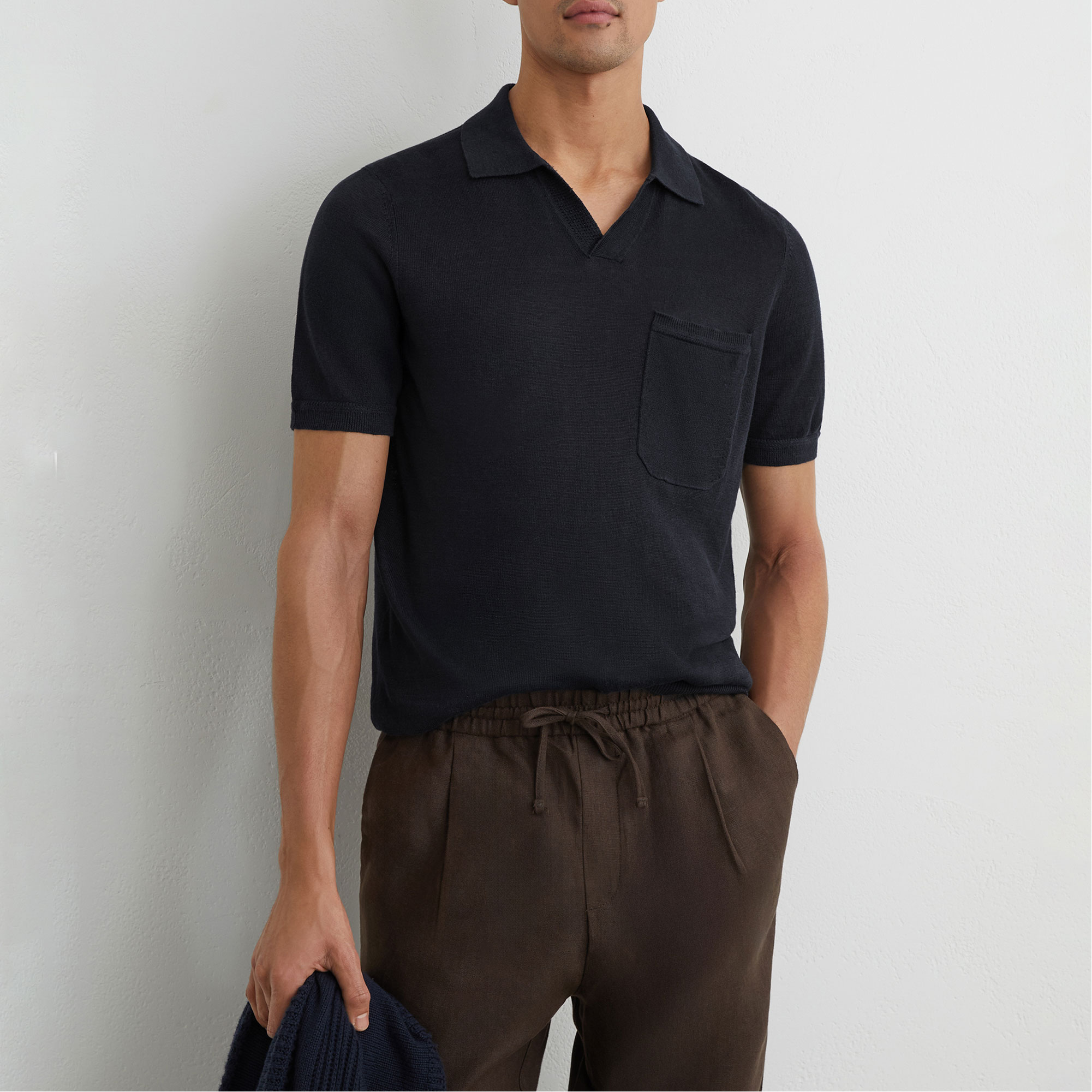 - Open polo collar, short sleeves, chest patch pocket, ribbed hem and cuffs