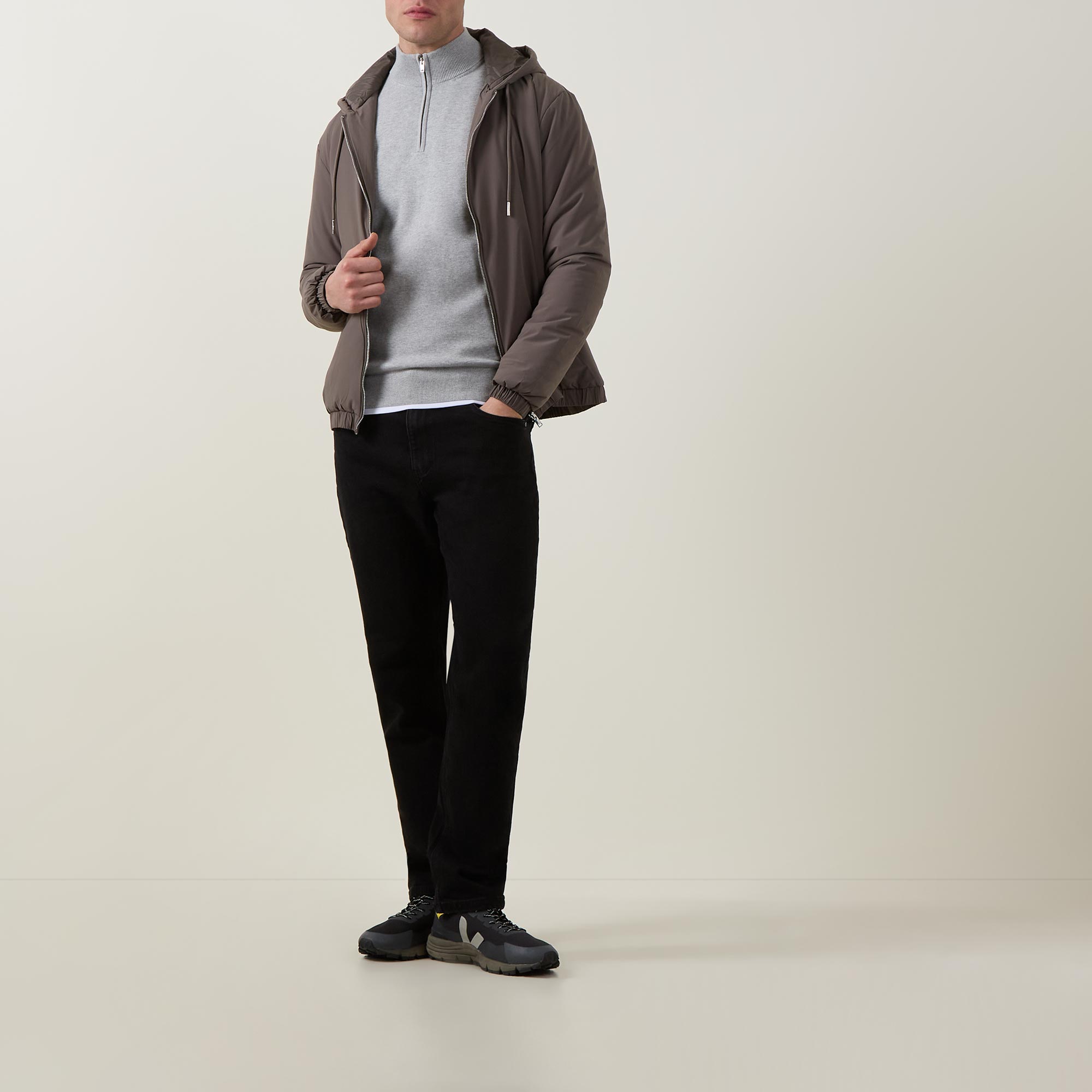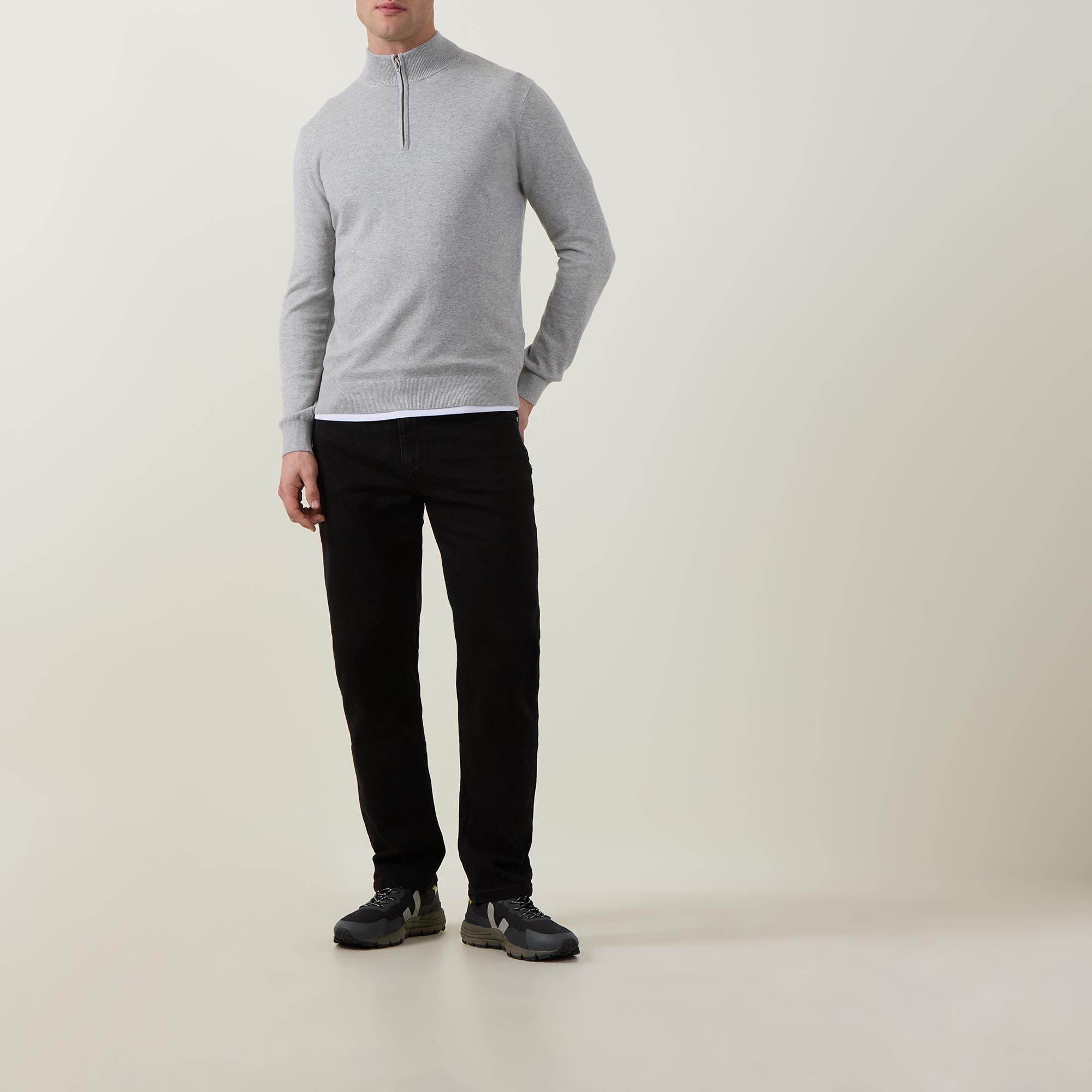 - Funnel neckline, long sleeves, half-zip fastening, ribbed trims, straight hemline