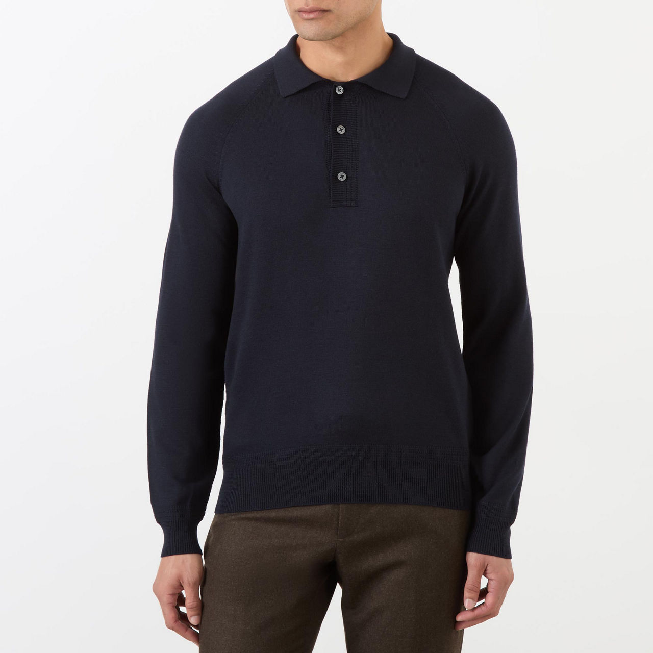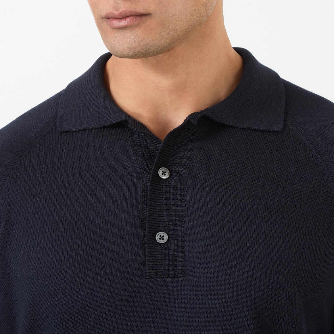- Long sleeves, polo collar, straight hemline, button fastenings