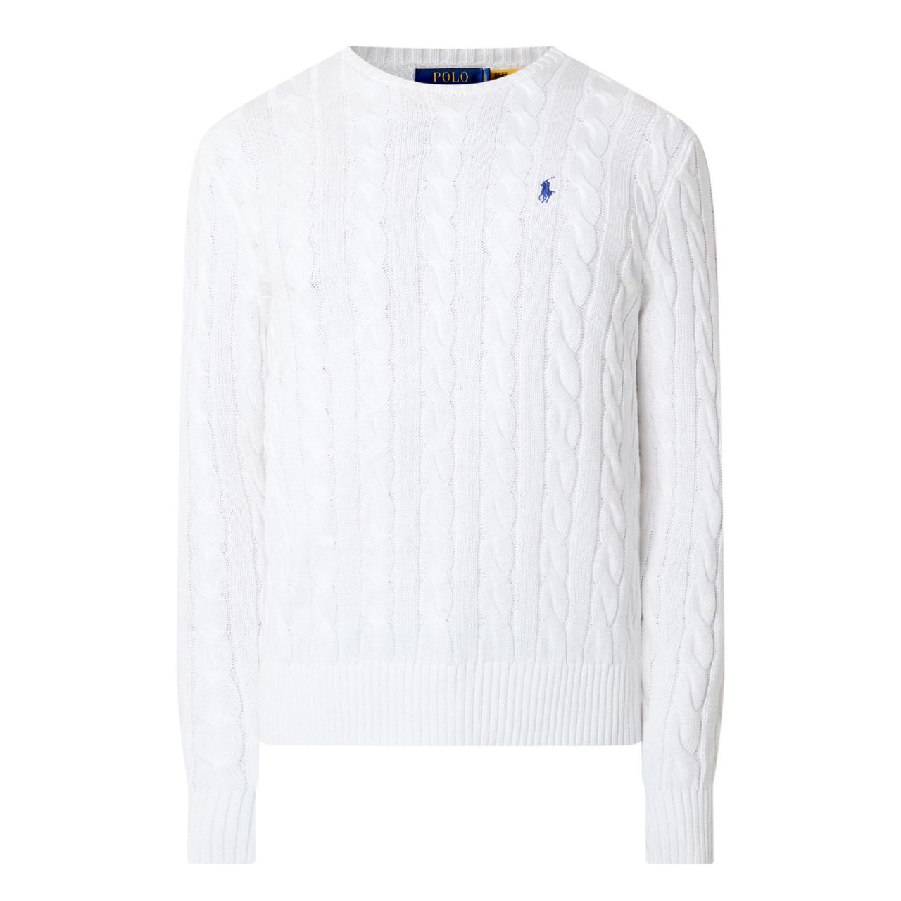 - Long sleeves, cable-knit pattern, logo detail, straight hemline, ribbed trims