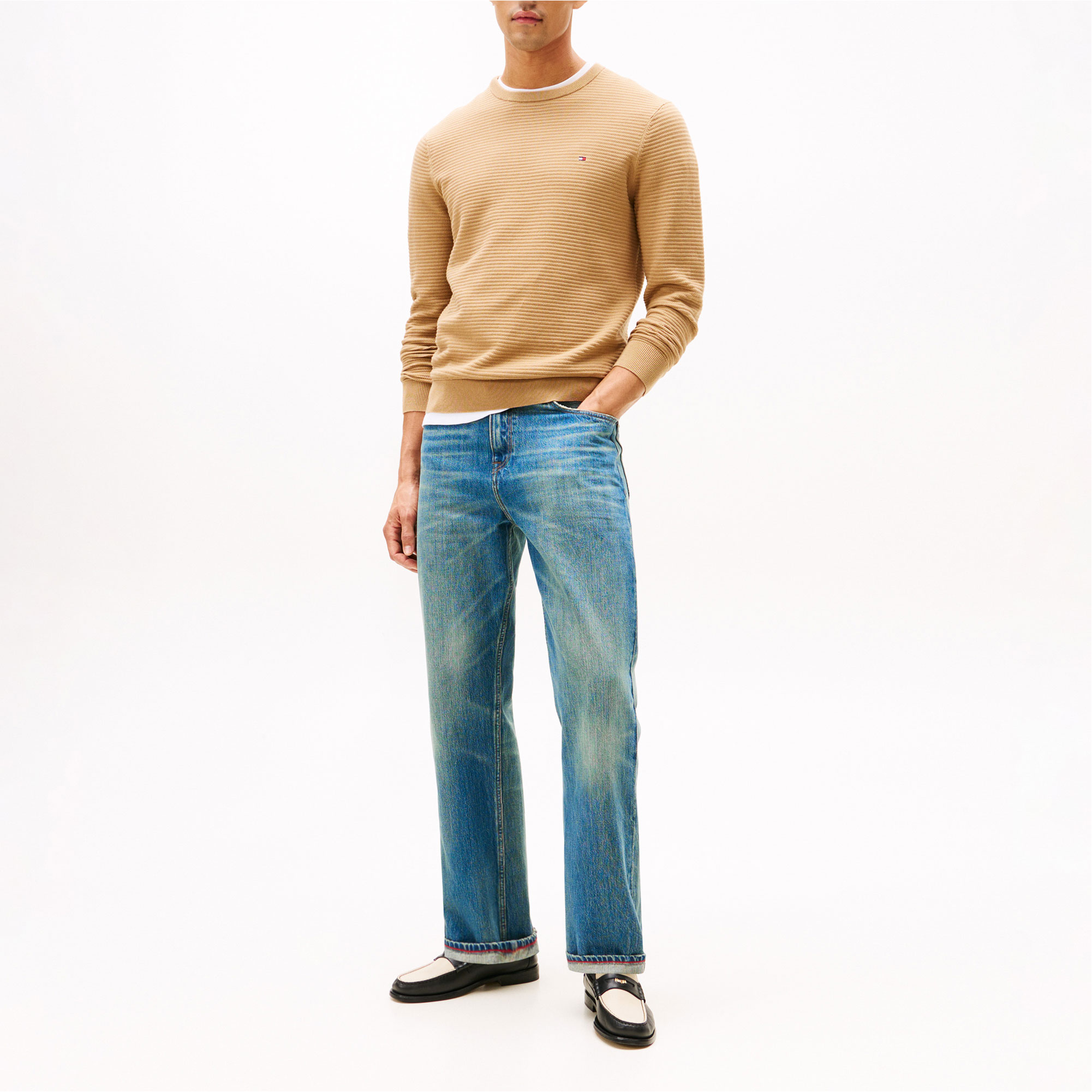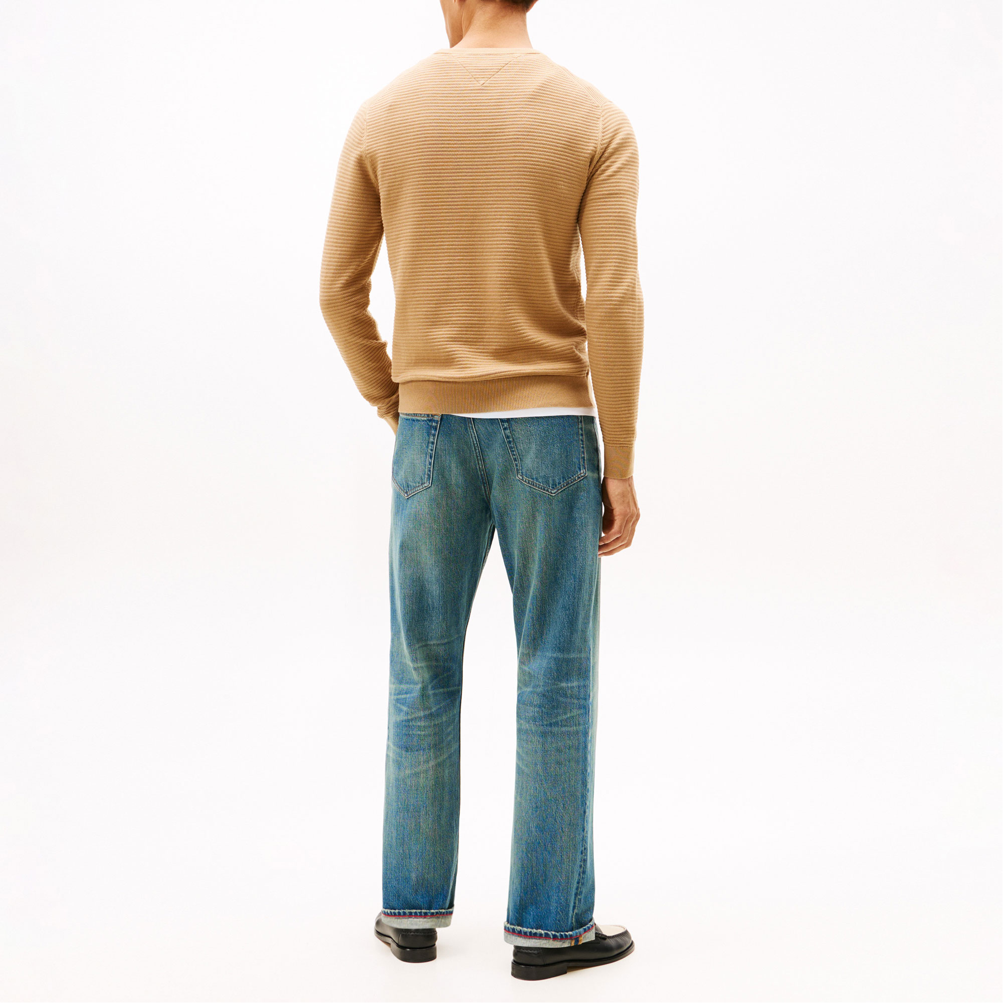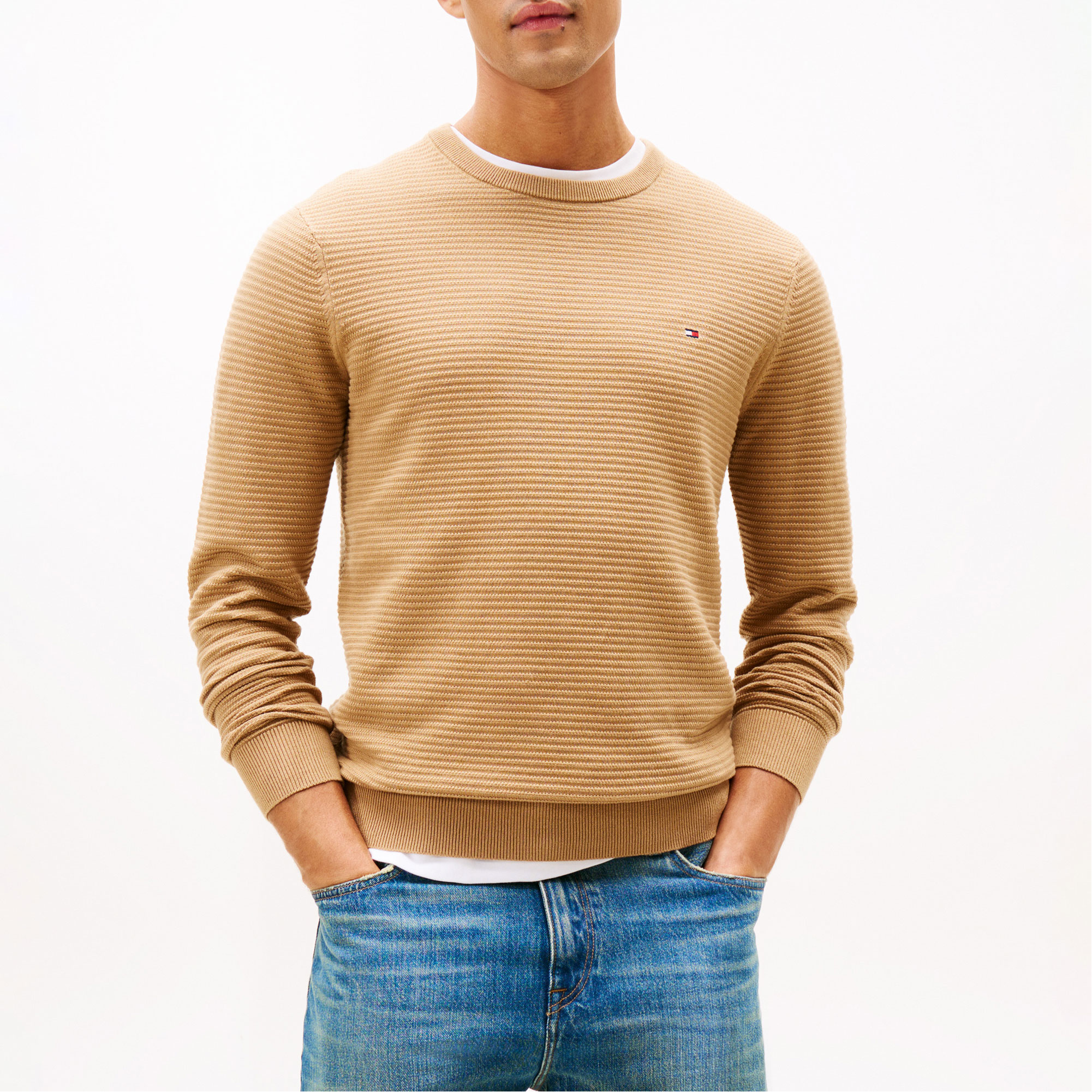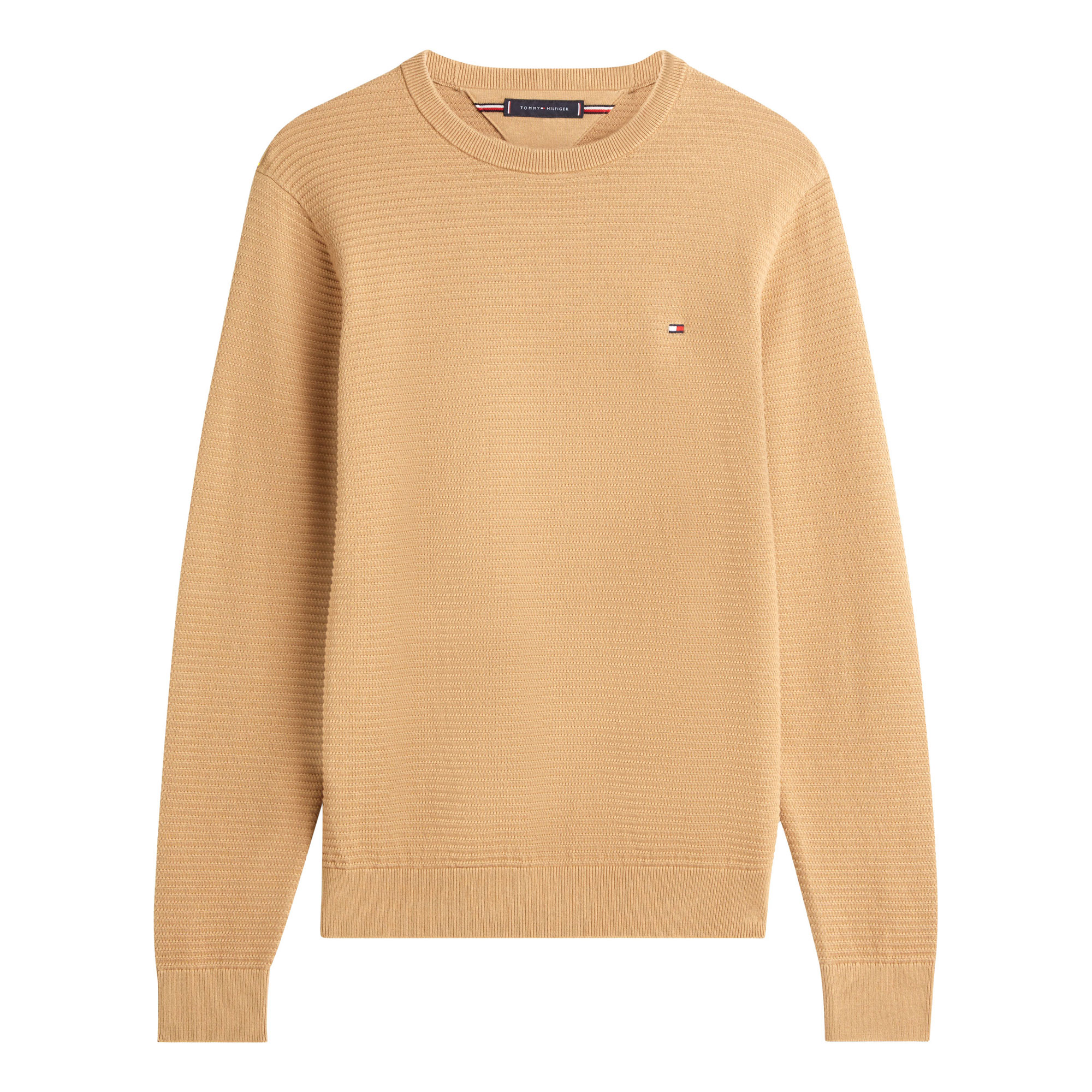 - Textured knit, crew neck, rib-knit collar, cuffs and hem, signature tape inside neckline, logo detail