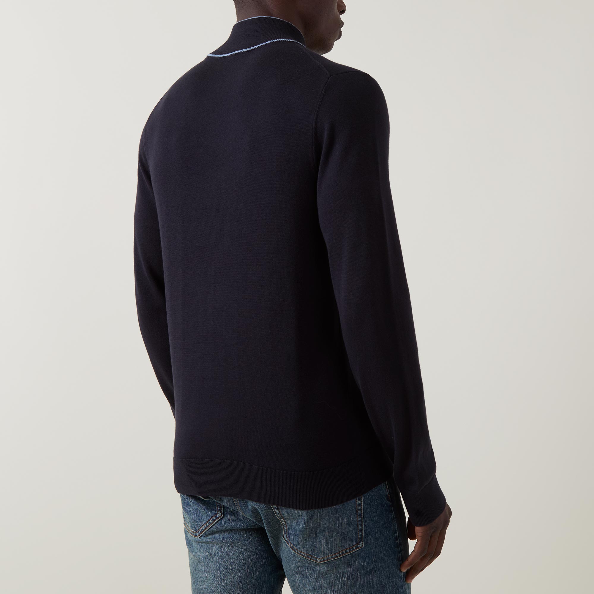 - Funnel neckline with contrast stripe detail, long sleeves, half zip-fastening placket, logo patch, pullover style, fine knit finish